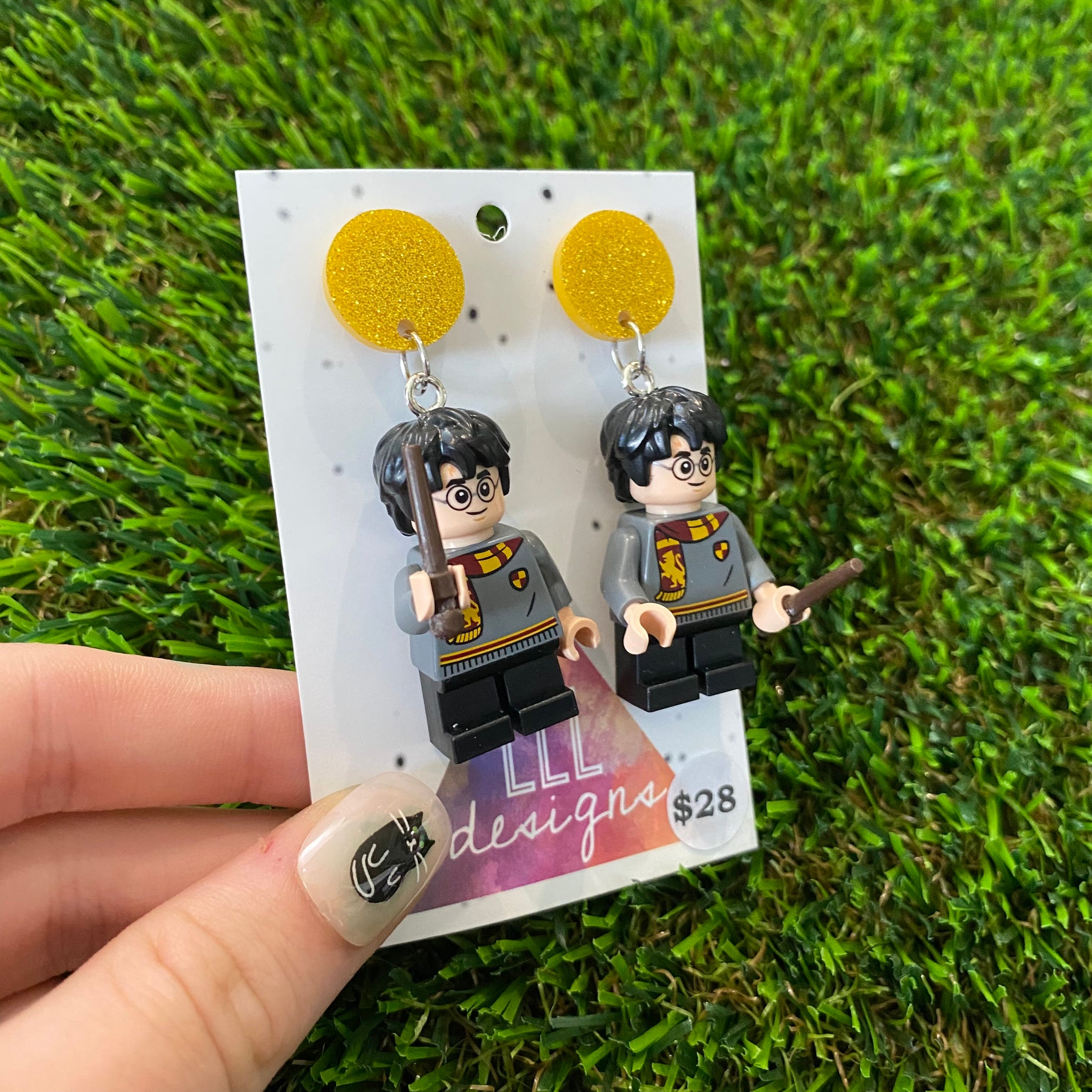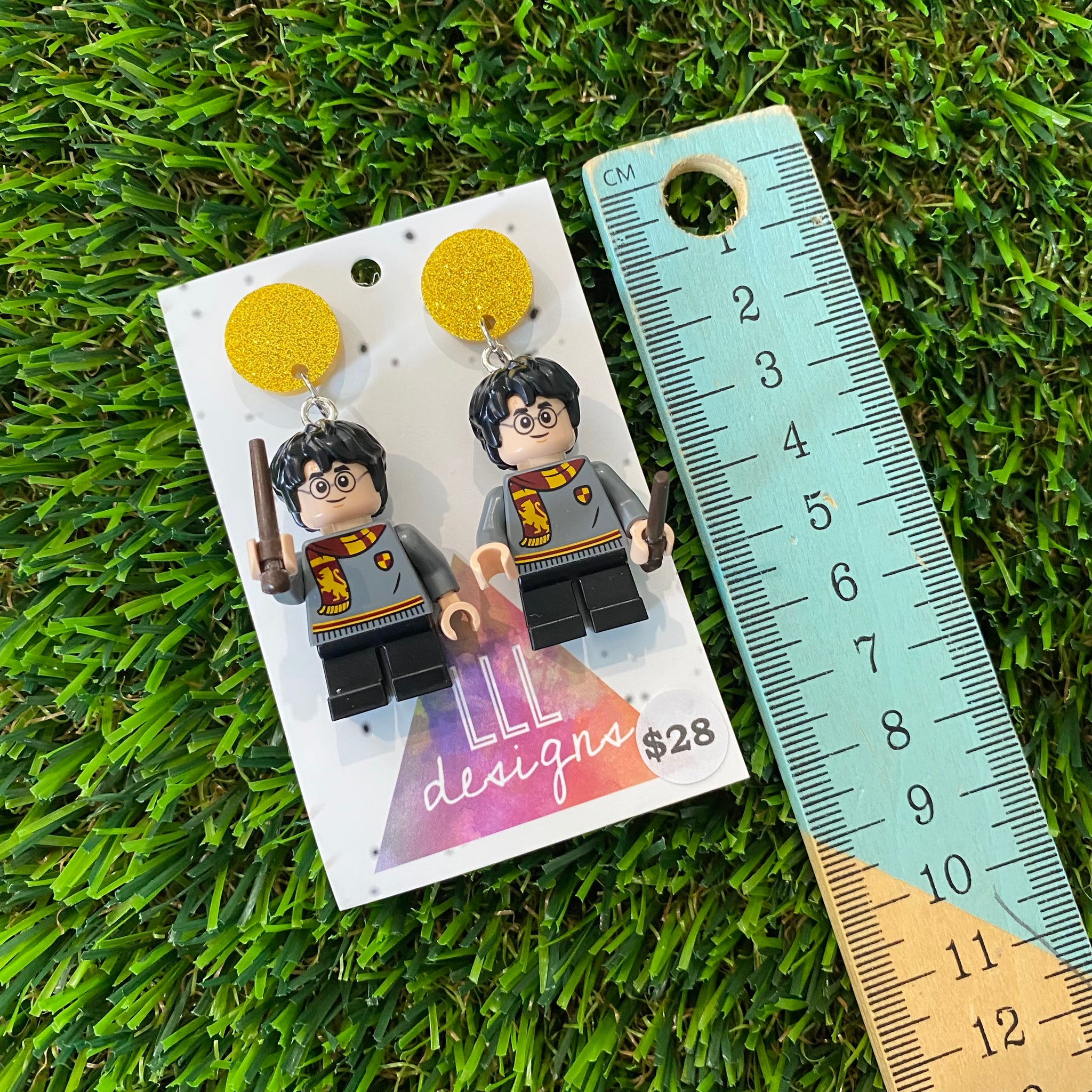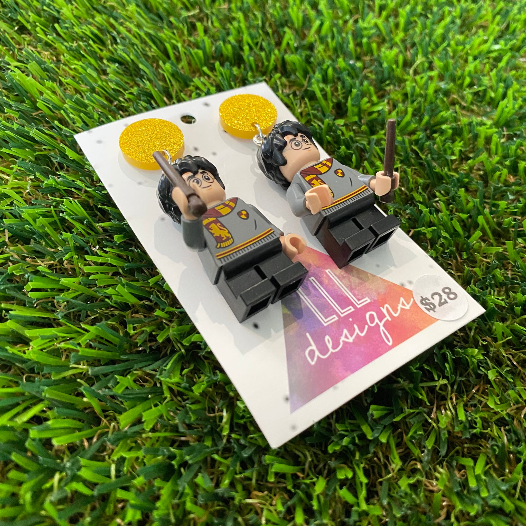 Uniformed Wizard Boy Brick Character with Wand Accessory Dangle Earrings - Featuring a Yellow Glitter Top!