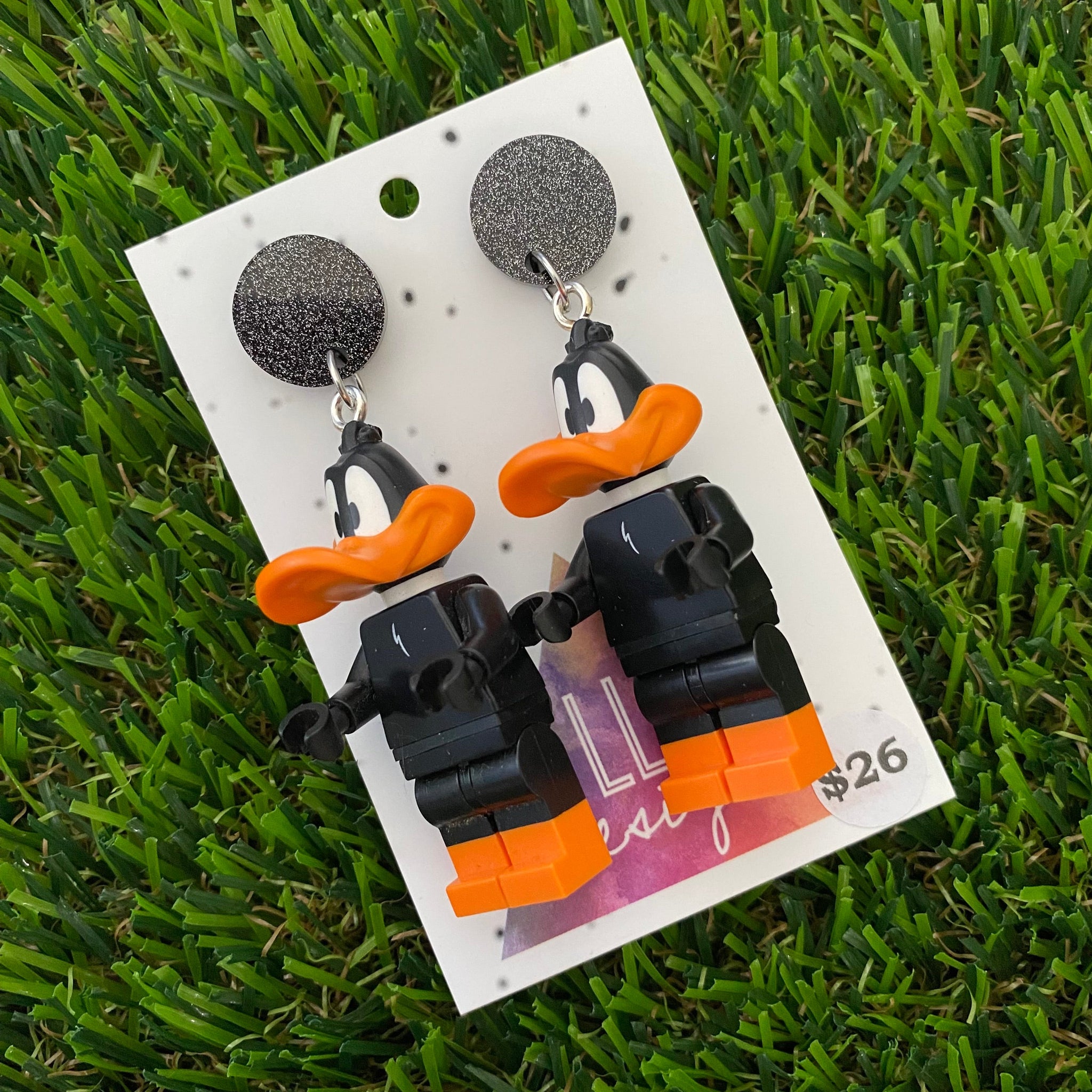 Brick Character Orange Billed Duck Dangle Earrings - Featuring Black Glitter Tops!