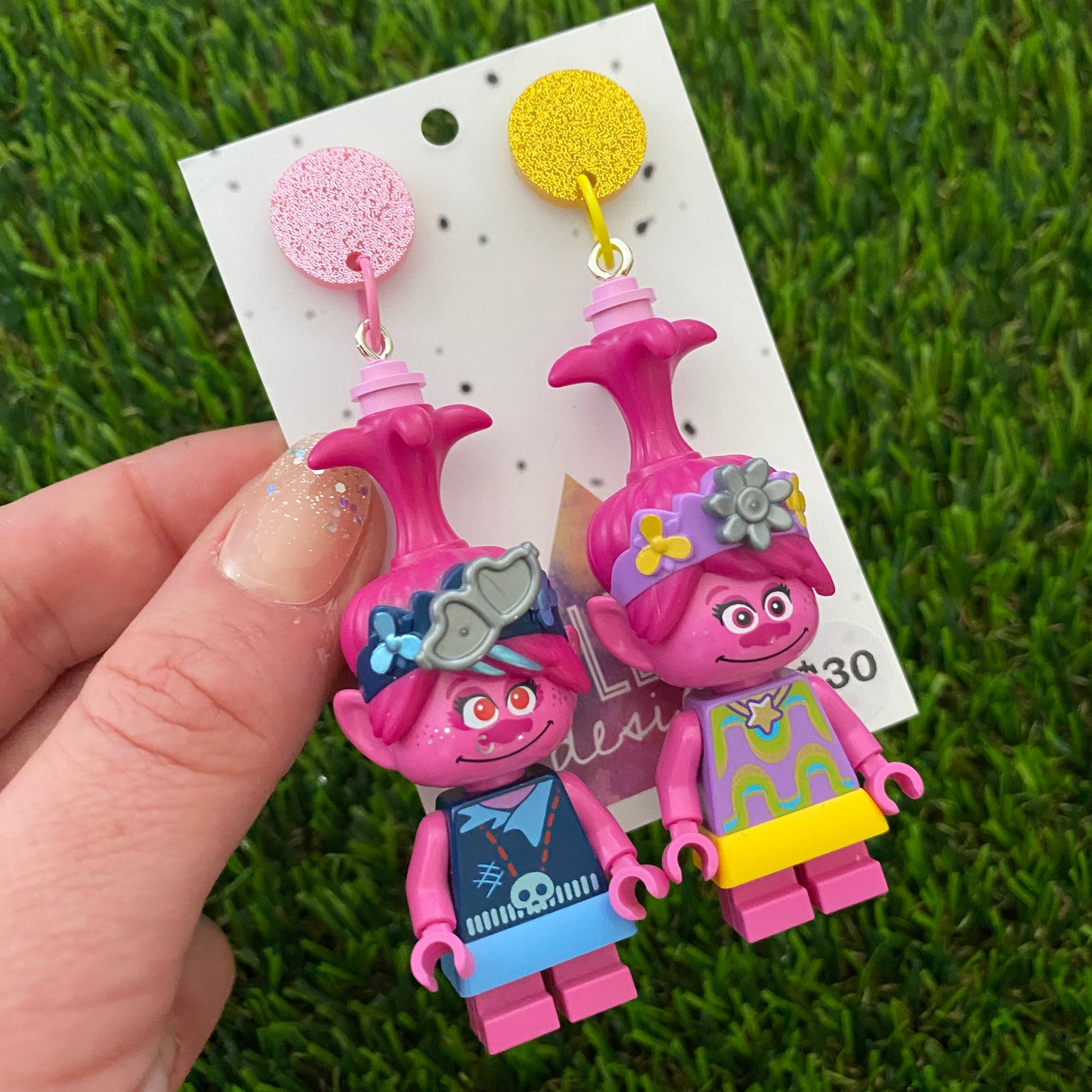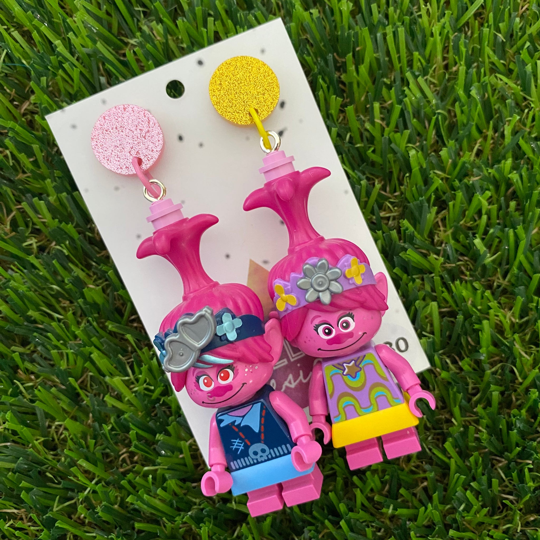 Brick Character Pink Girl Punk and Hippie Dangle Earrings - Featuring Pink and Yellow Glitter Tops!