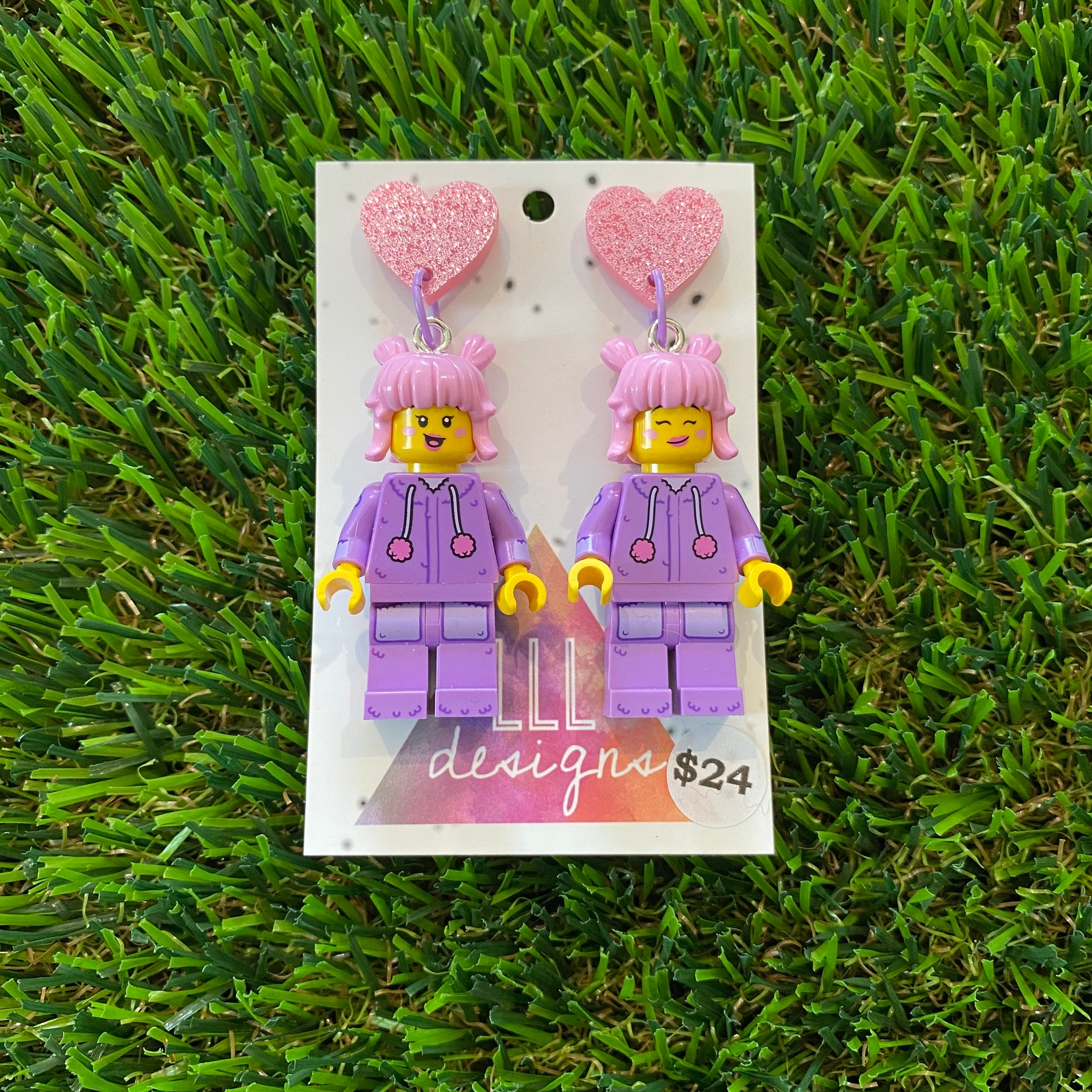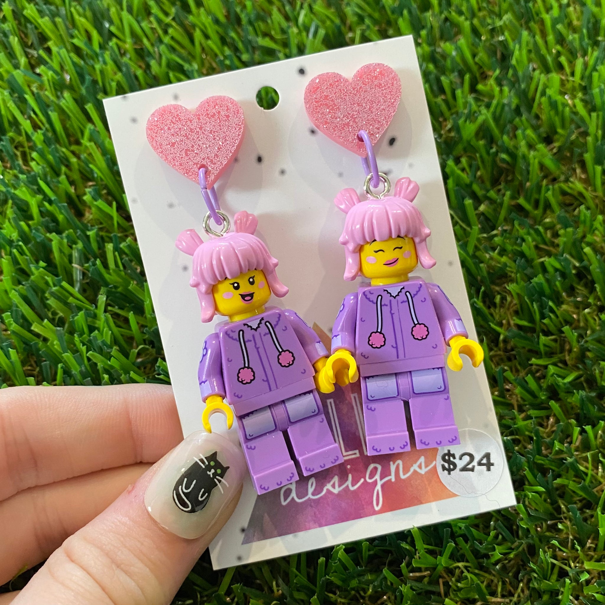 Pink Haired Cutie Brick Character With Purple Bunny Onesie Dangle Earrings - Featuring Pink Glitter Heart Shaped Tops!