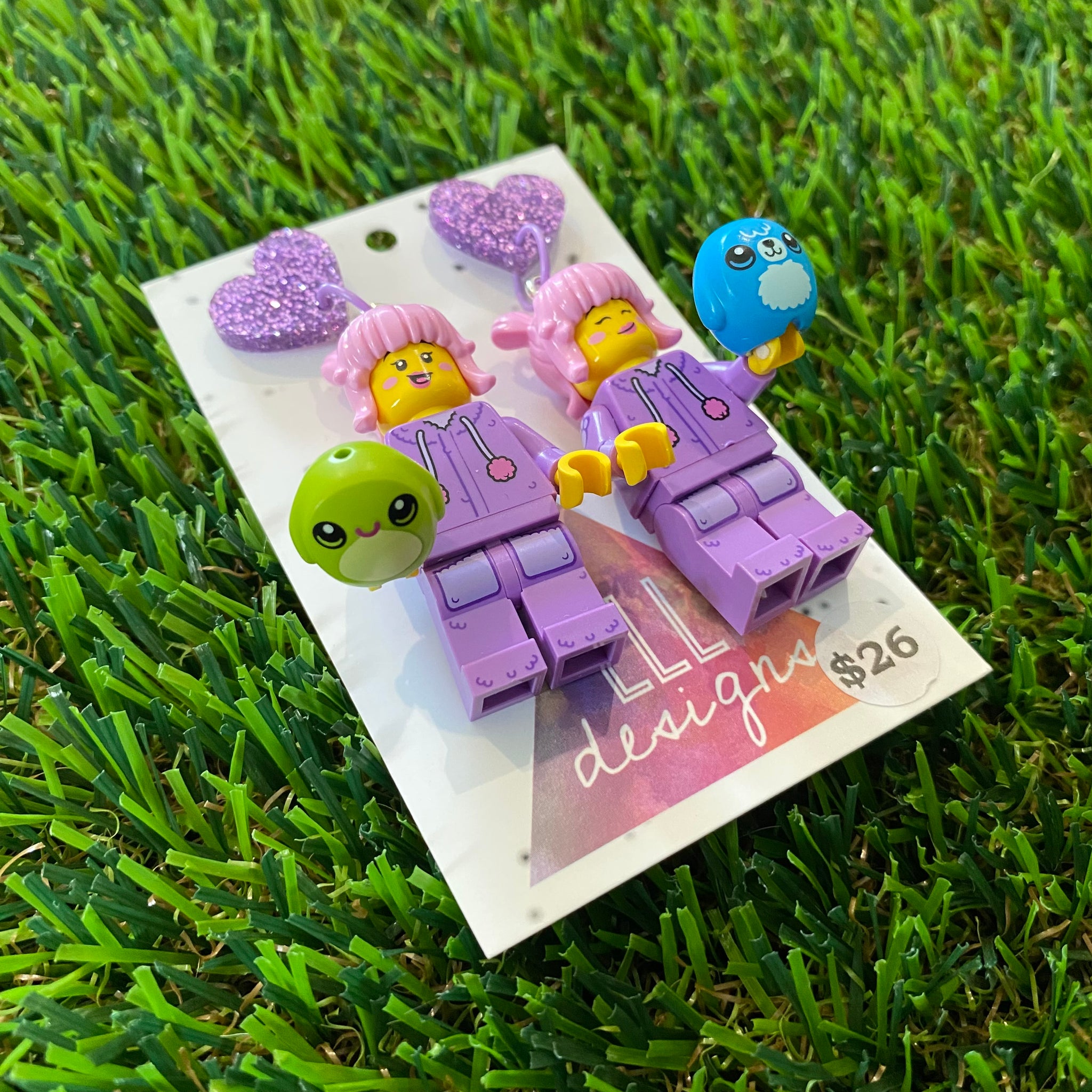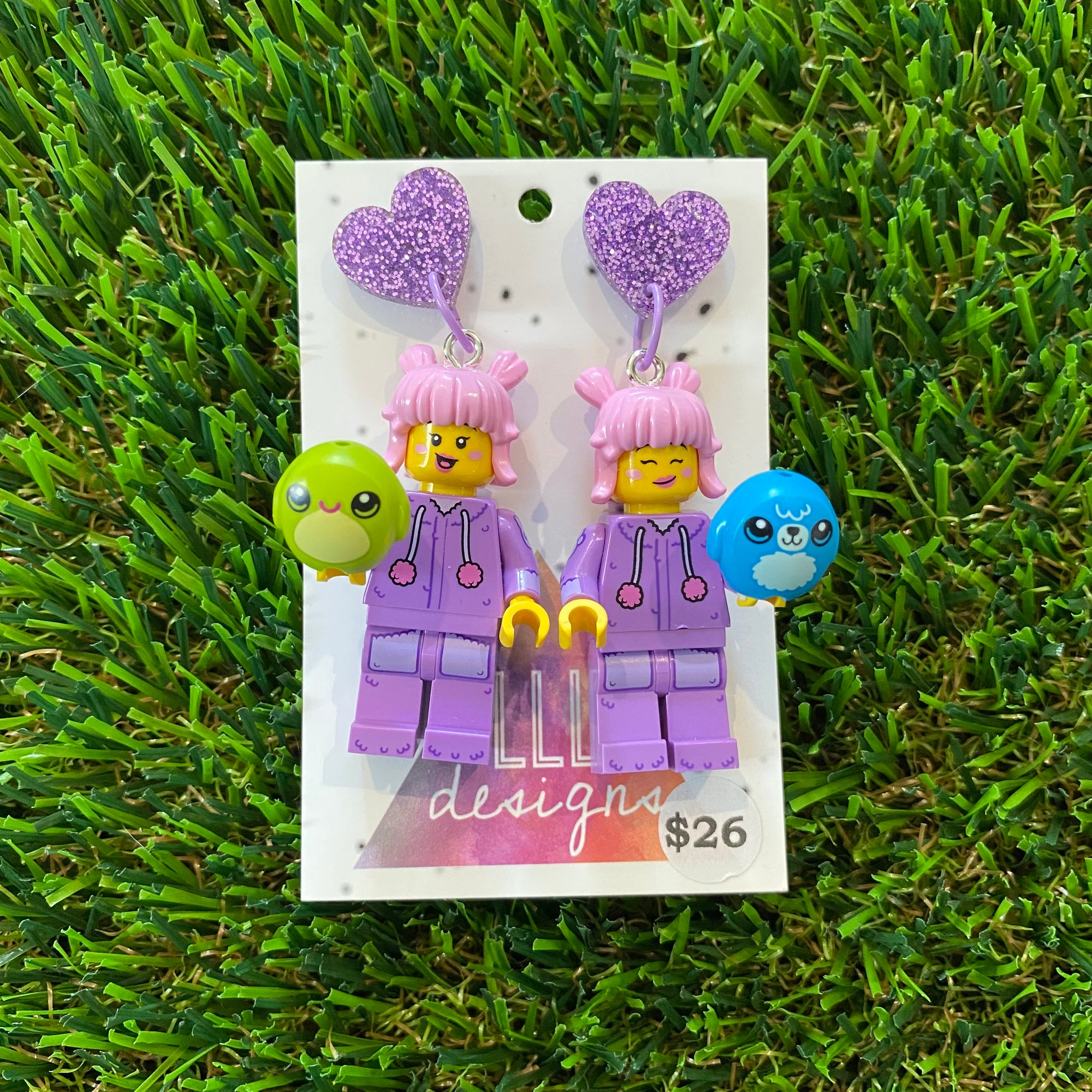 Pink Haired Cutie Brick Character With Purple Bunny Onesie Dangle Earrings With Plushies - Featuring Purple Glitter Heart Shaped Tops!