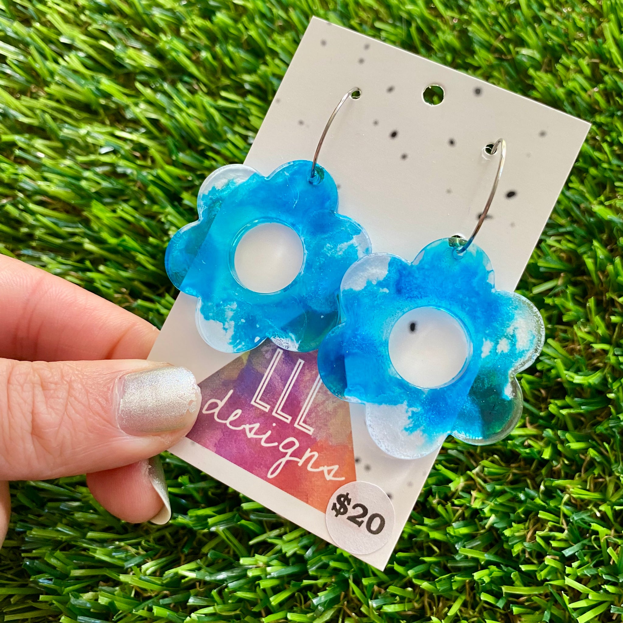 Alcohol Ink Resin Earrings - Blue and White Daisies Featuring a Silver Hoop!