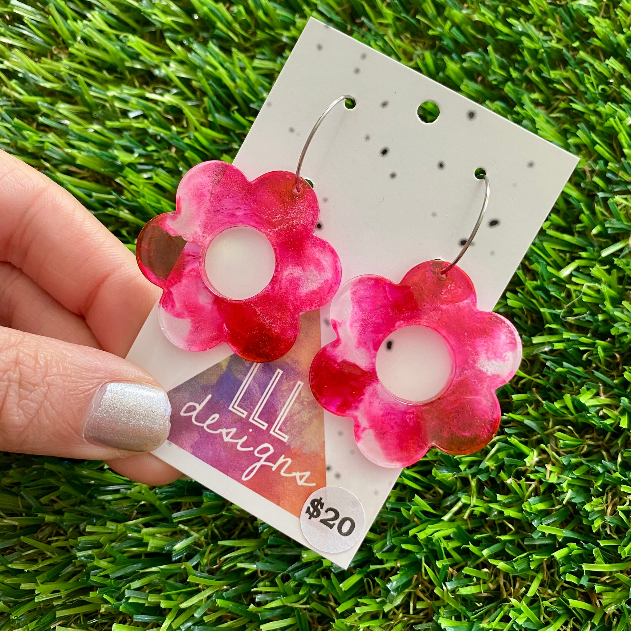 Alcohol Ink Resin Earrings - Pink and White Daisies Featuring a Silver Hoop!