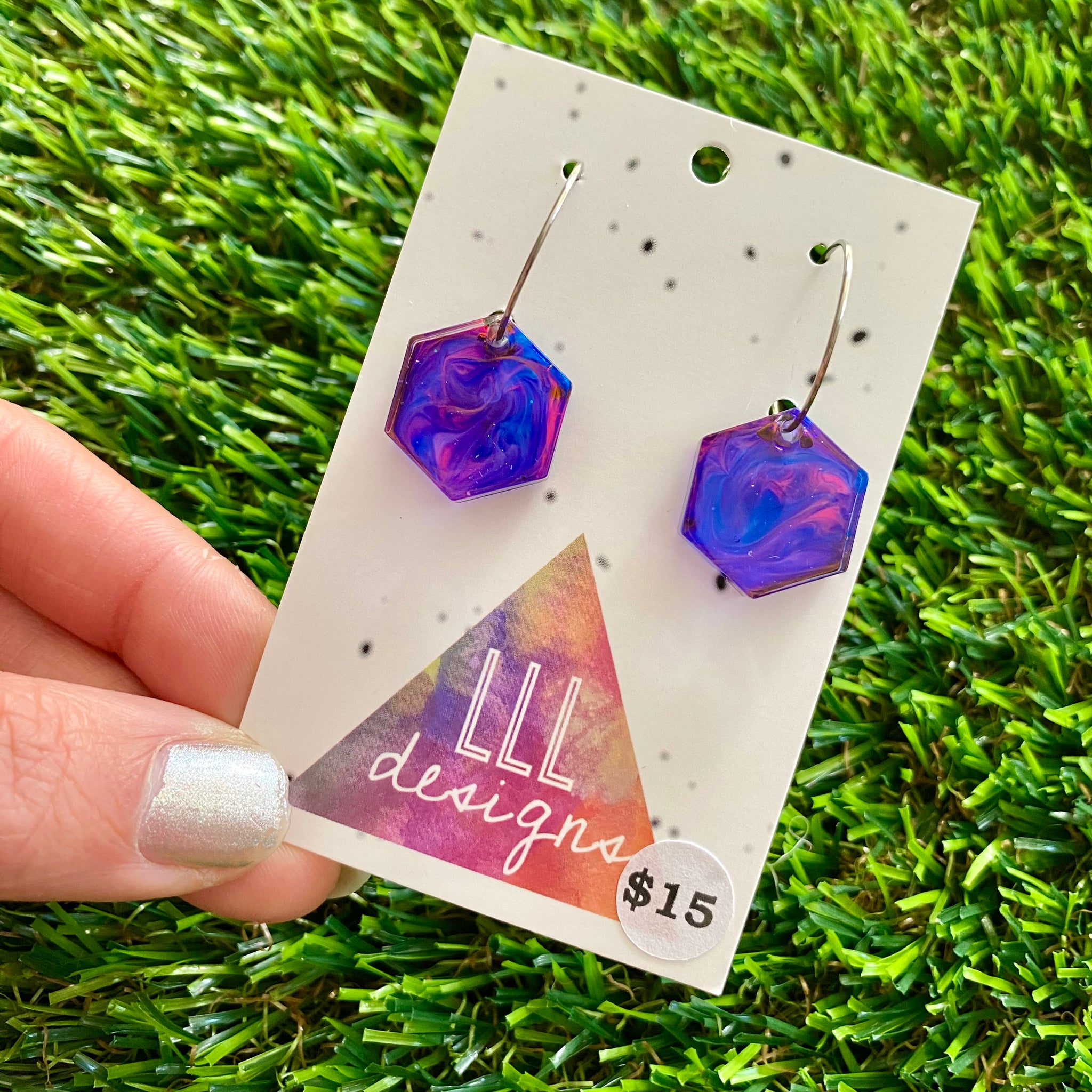 Alcohol Ink Resin Earrings - Blue and Pink Hexagons Featuring a Silver Hoop!