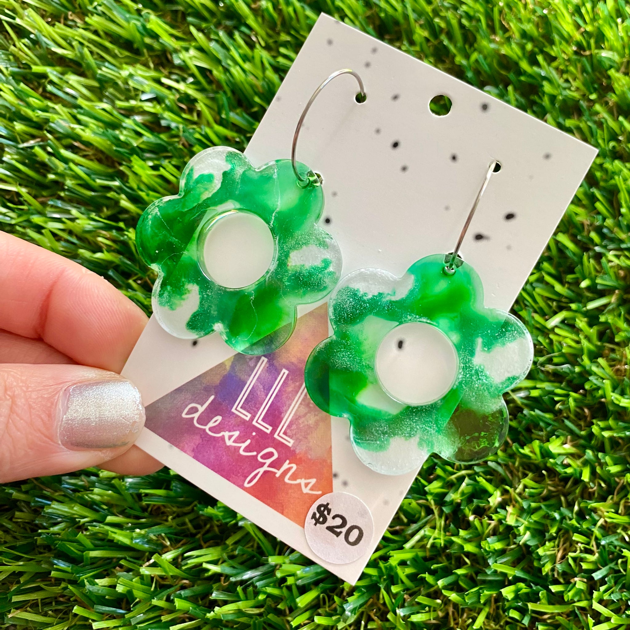 Alcohol Ink Resin Earrings - Green and White Daisies Featuring a Silver Hoop!