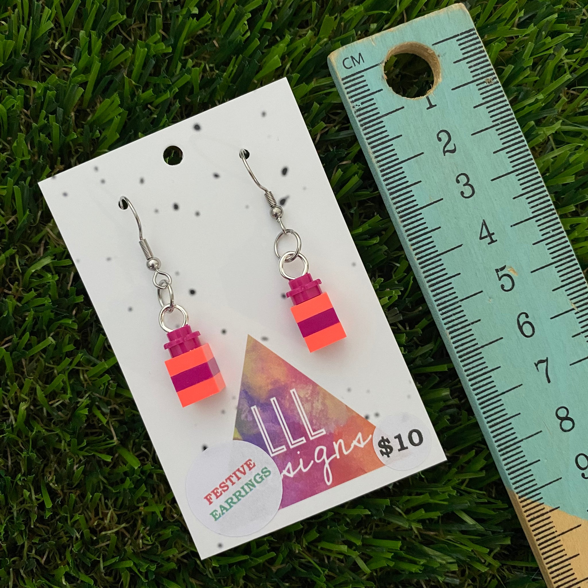 Christmas Brick Dangle Earrings- Neon Pink and Magenta Brick Dangle Present Earrings on Surgical Stainless Steel Hooks