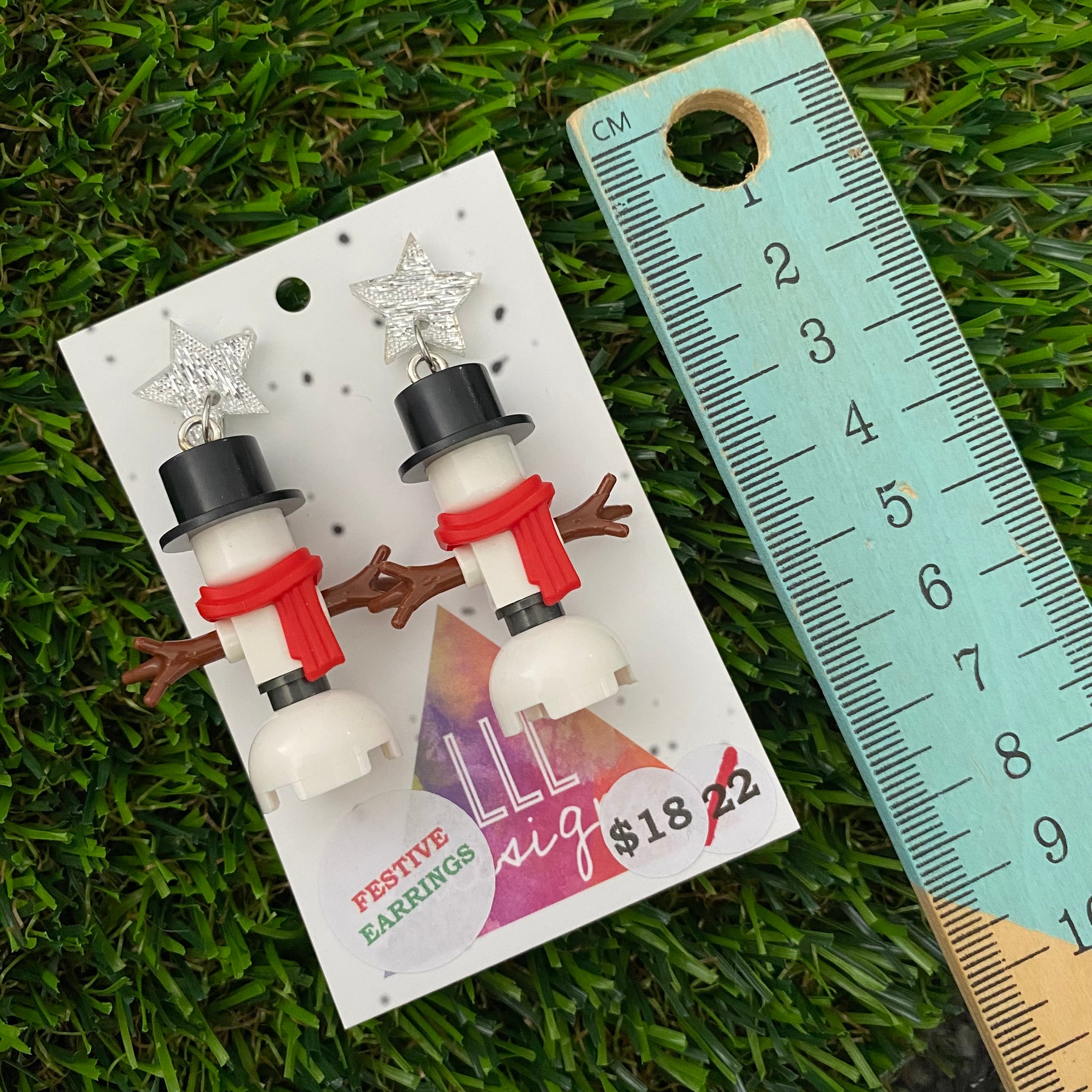 Christmas Snowman Brick Earrings- Simple Christmas Snowman with Top Hat Brick Dangle Earrings, Featuring Festive Silver Star Tops.