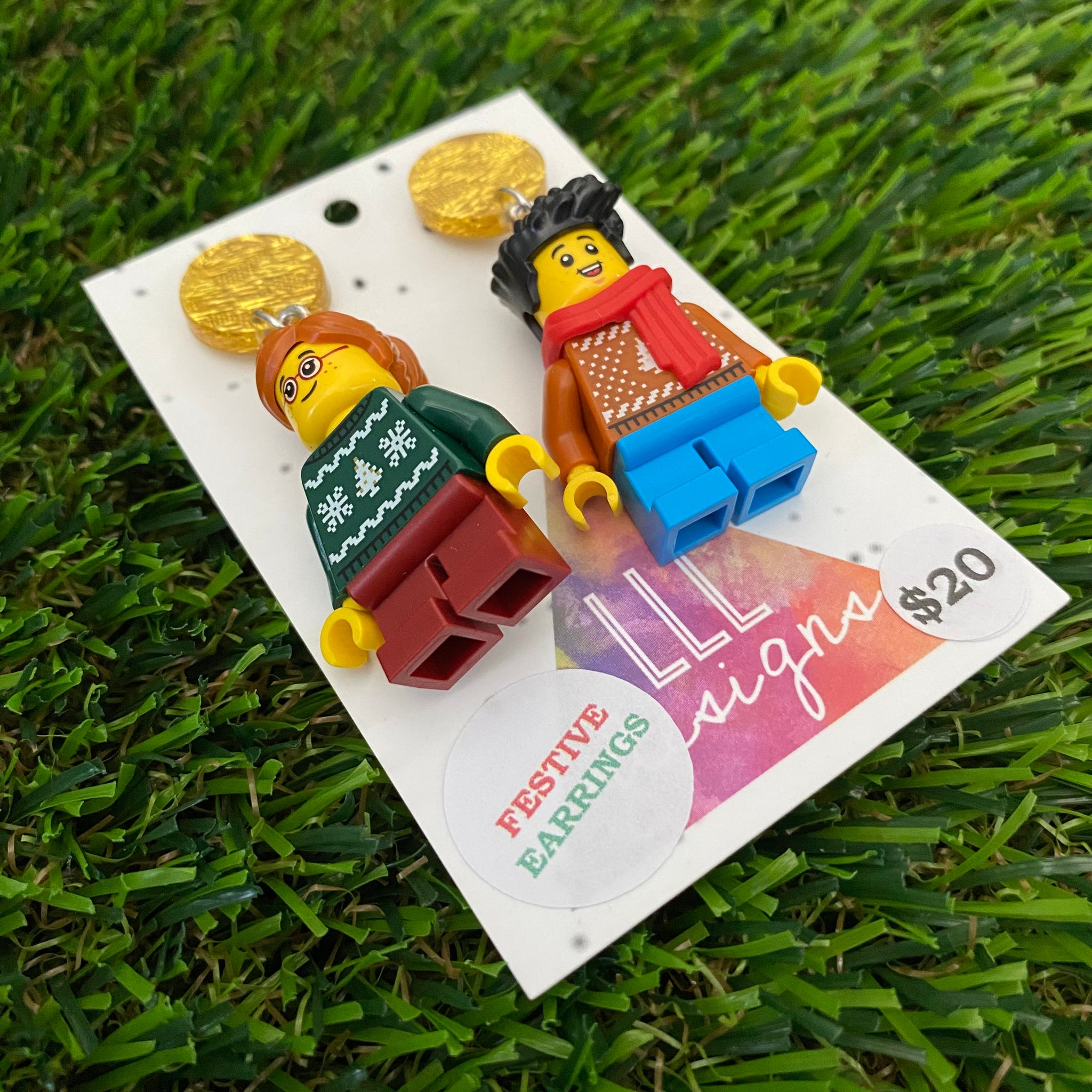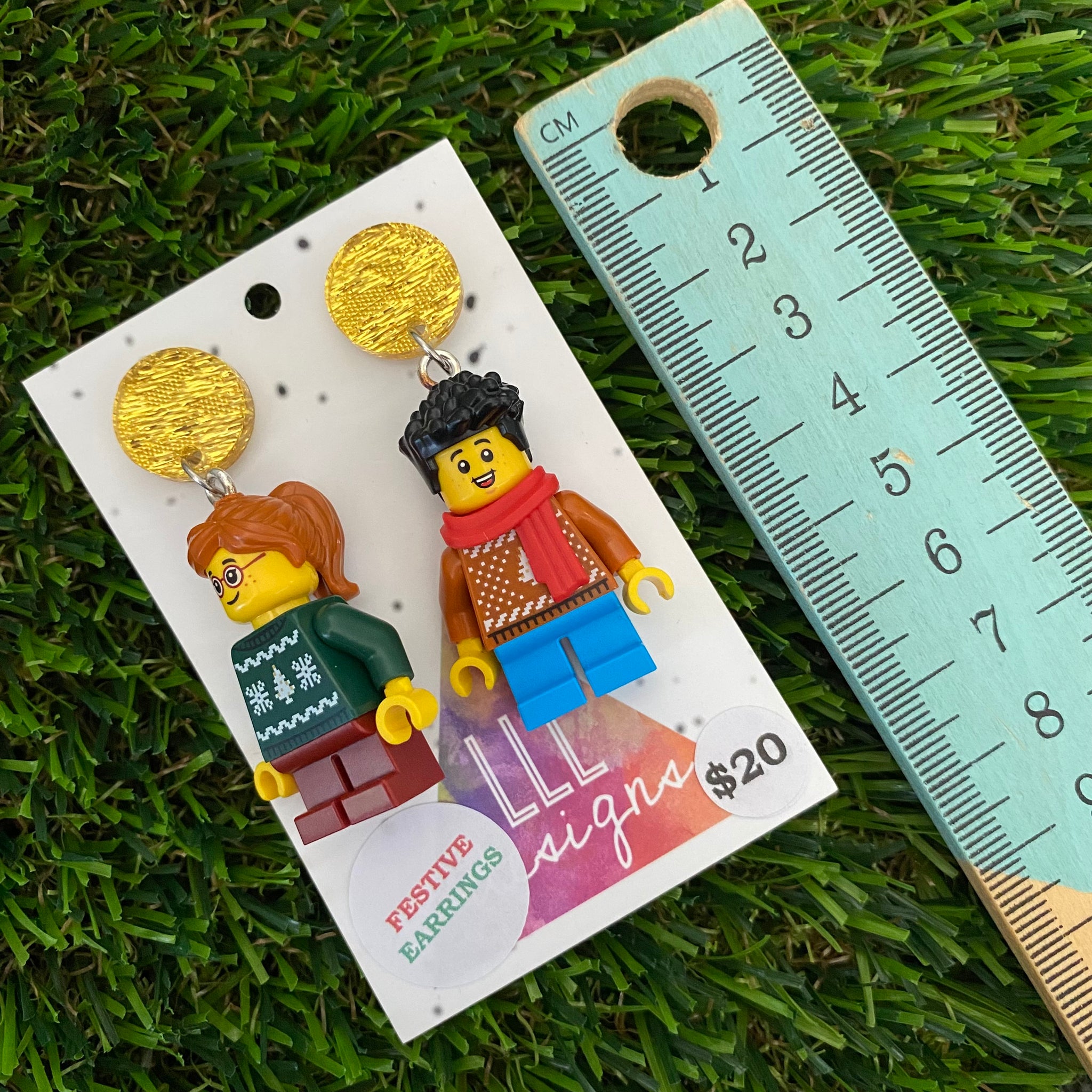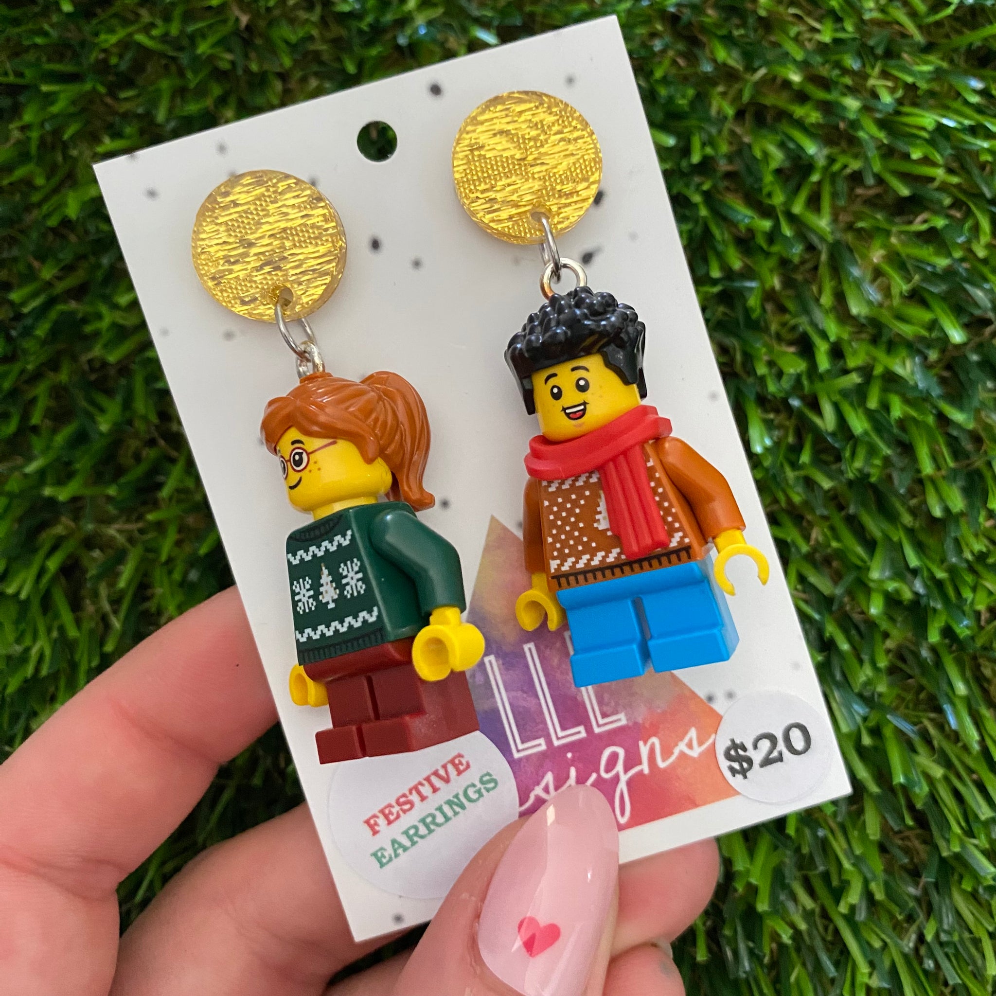Christmas Sweater Kid Brick Earrings- Festive Christmas Sweater and Winter Scarf Kid Dangle Earrings, Featuring a Glitzy Gold Top.