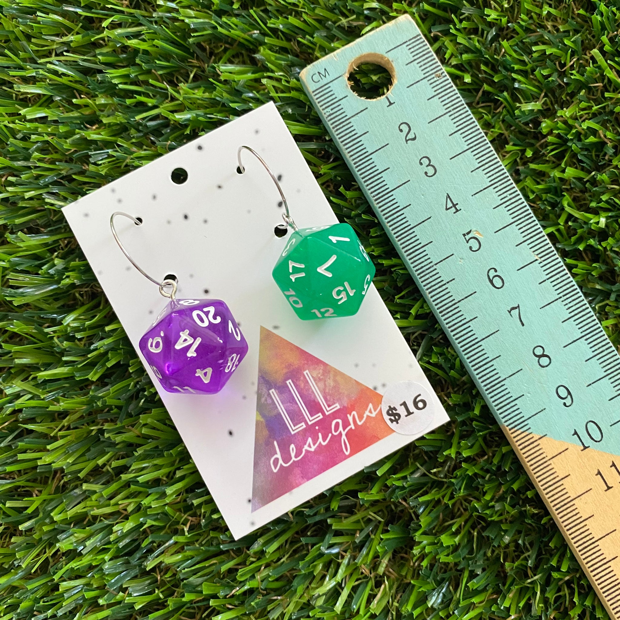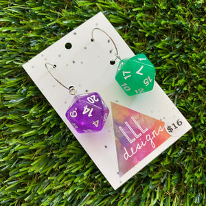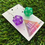 Dice Earrings - Purple and Green Multi Dice with Silver Hoops!