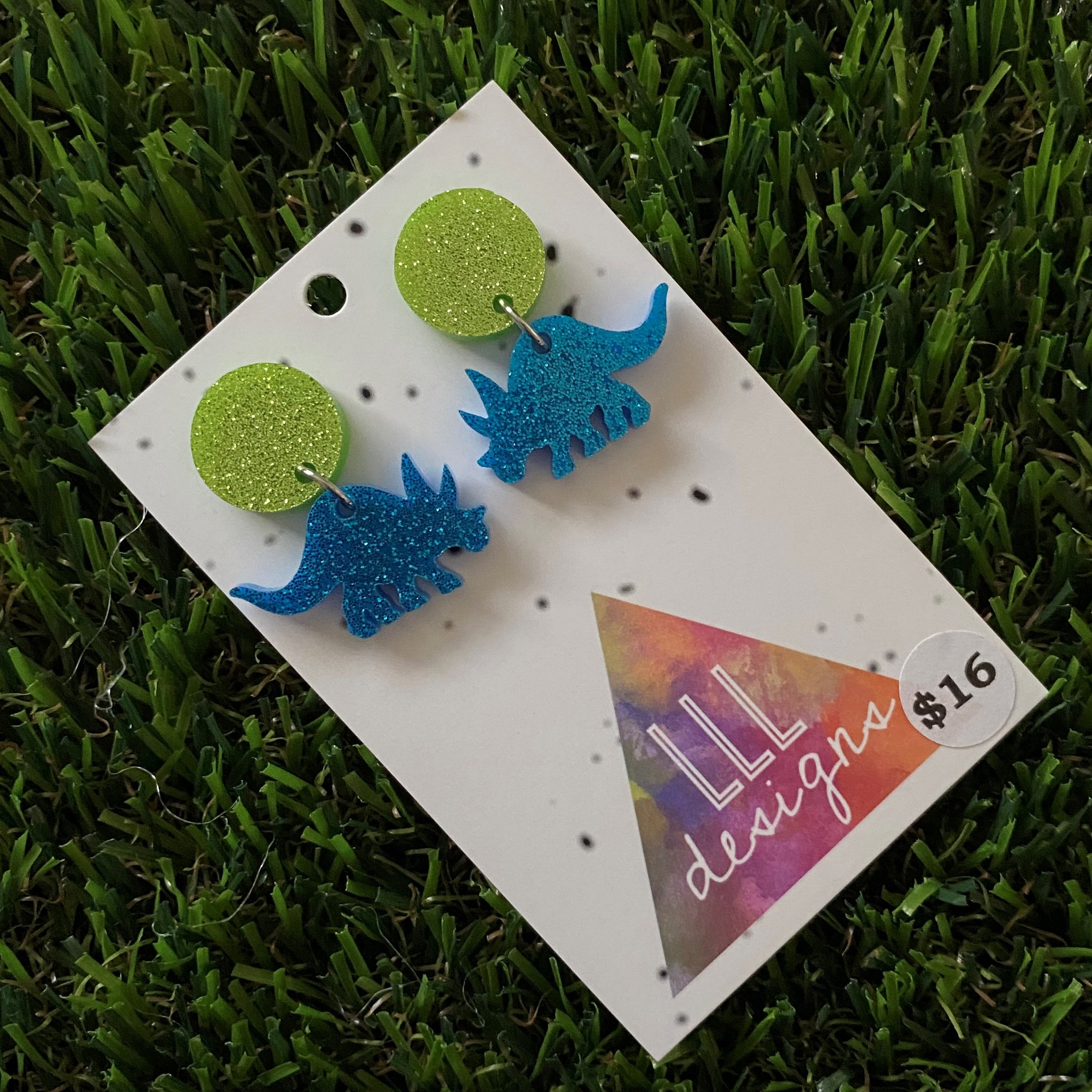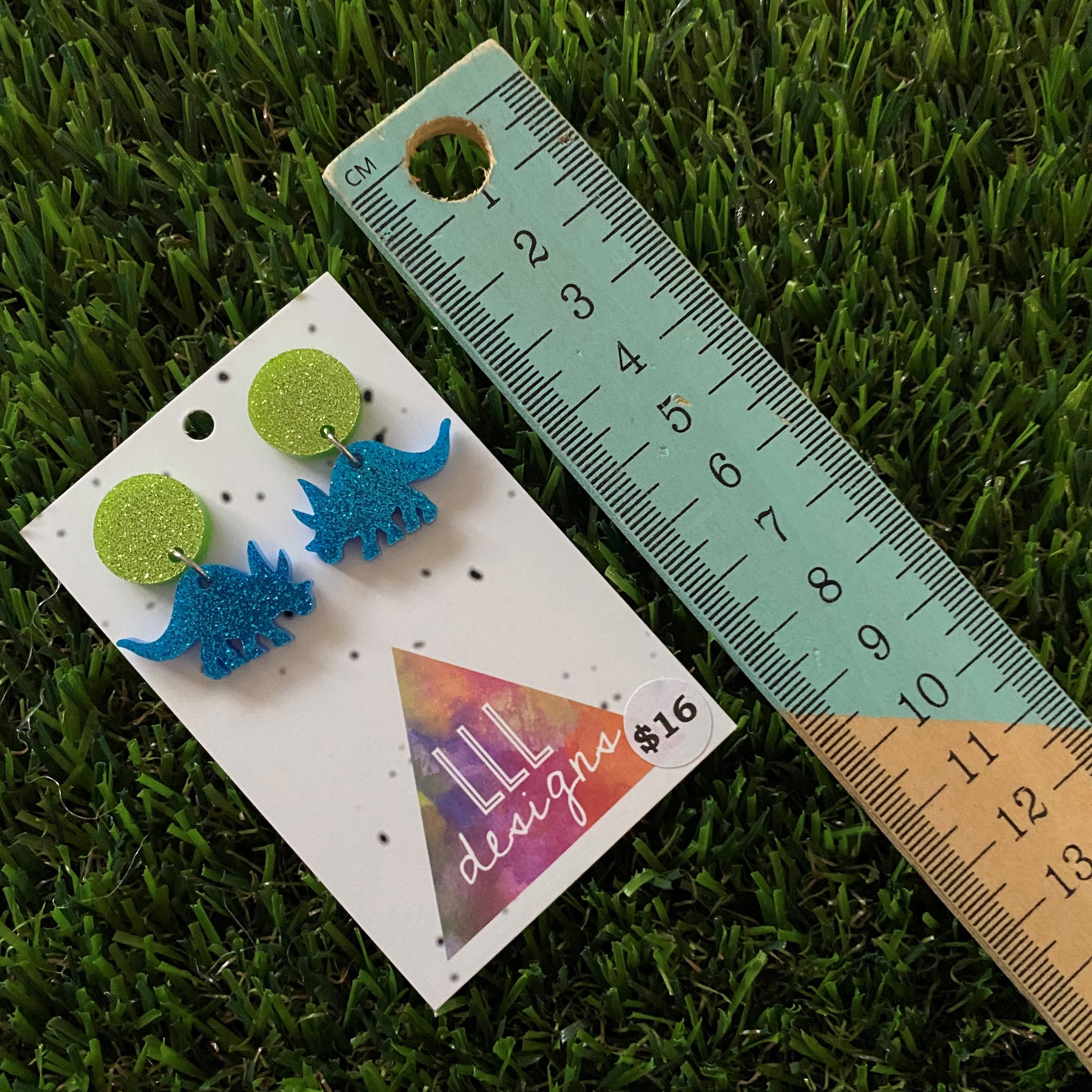 Dinosaur Earrings - Mini Glitter Blue Triceratops Dangles with Green Glitter Studs - these are TriceraTOPS!