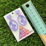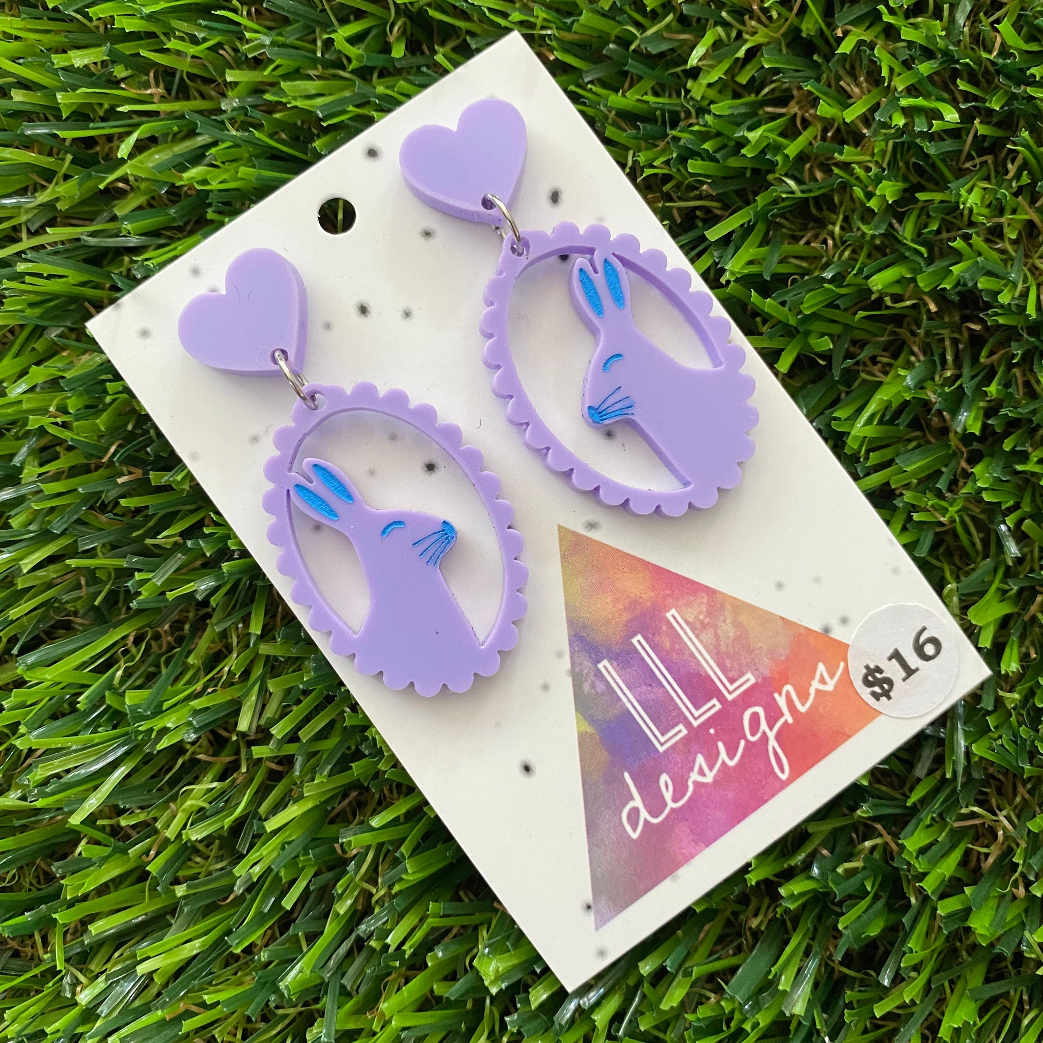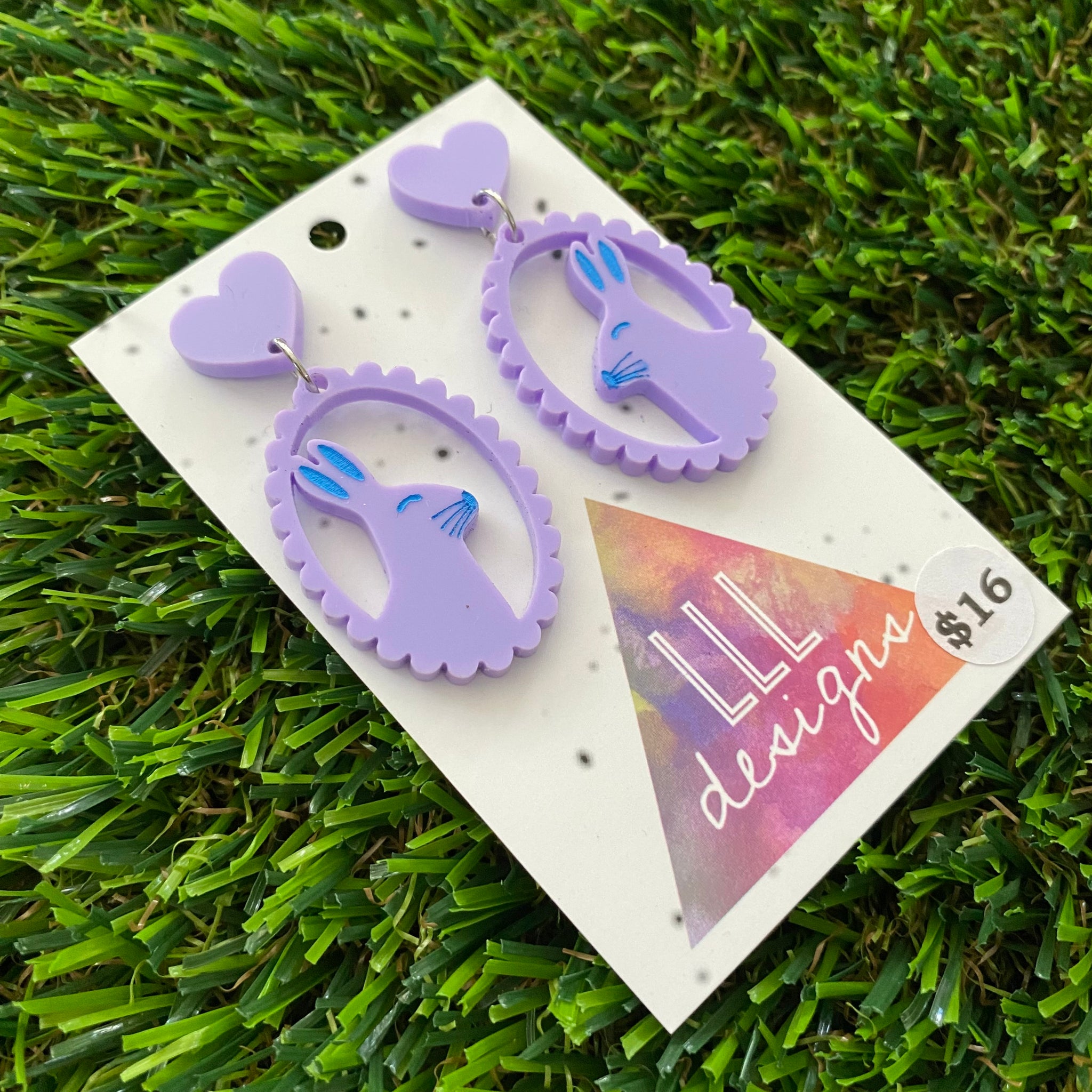 Easter Earrings - Pastel Purple Easter Bunny Cameo with Blue Hand Painted Detailing and Pastel Purple Heart Tops!