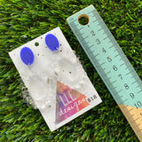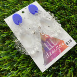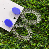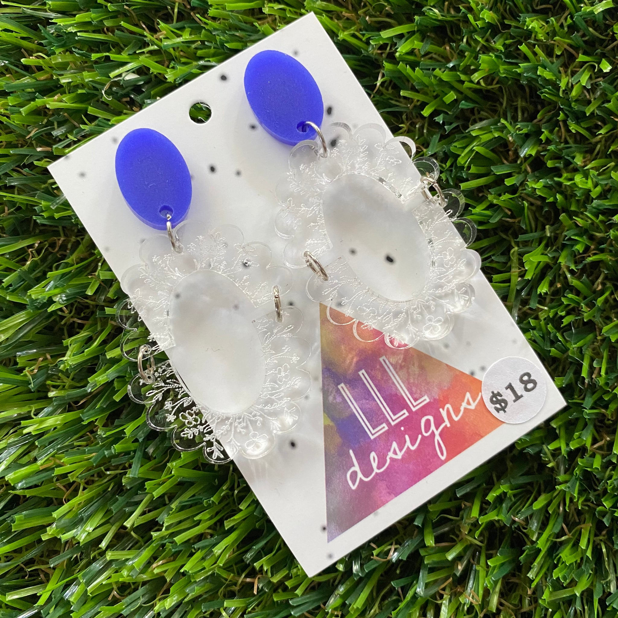 Floral Earrings - Intricate Clear Floral Lace Scalloped Oval Dangles with Royal Blue Tops!
