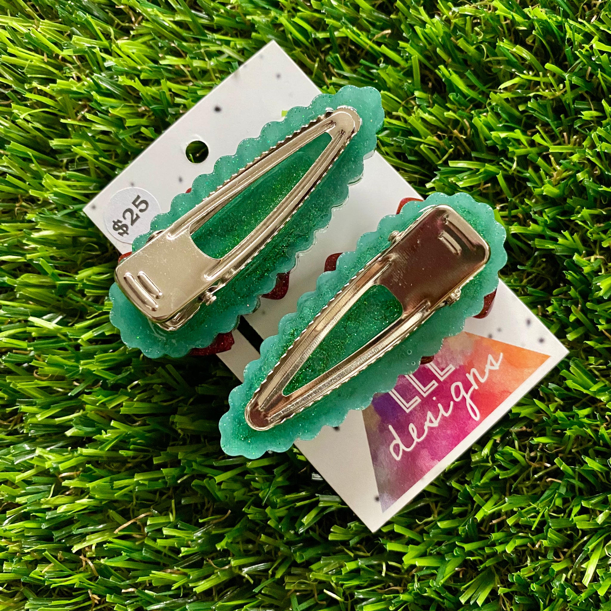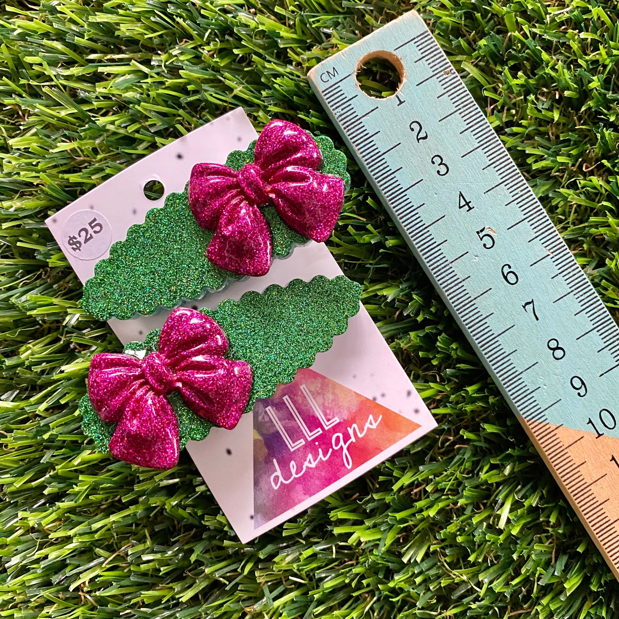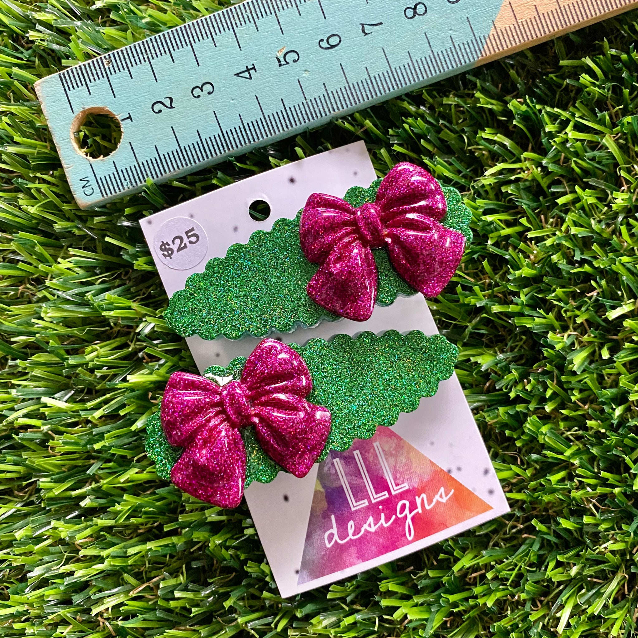 Handmade Resin Hair Clip - Glitter Green Scalloped Hair Clip Pair Featuring a Mega Glitter Pink Bow!