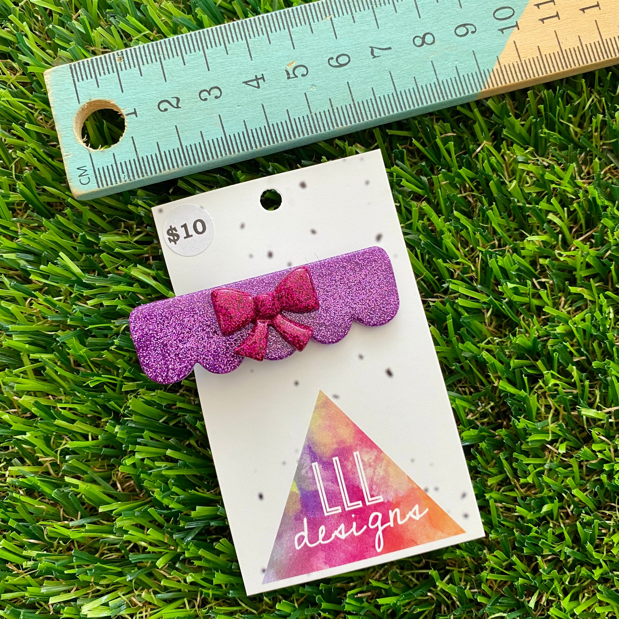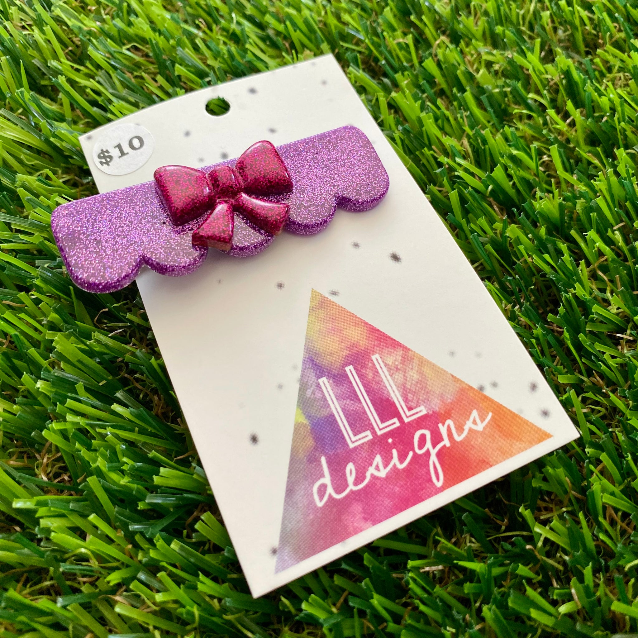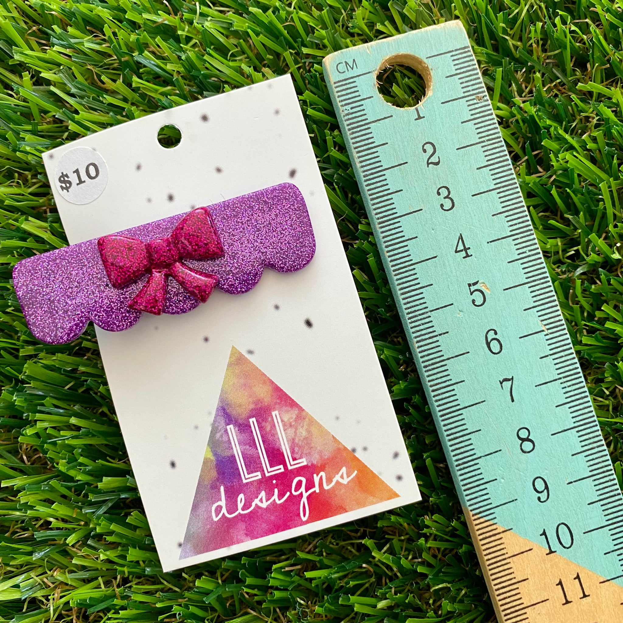 Handmade Resin Hair Clip - Glitter Purple Scalloped Edge Hair Clip Featuring a Glitter Pink Regular Bow!