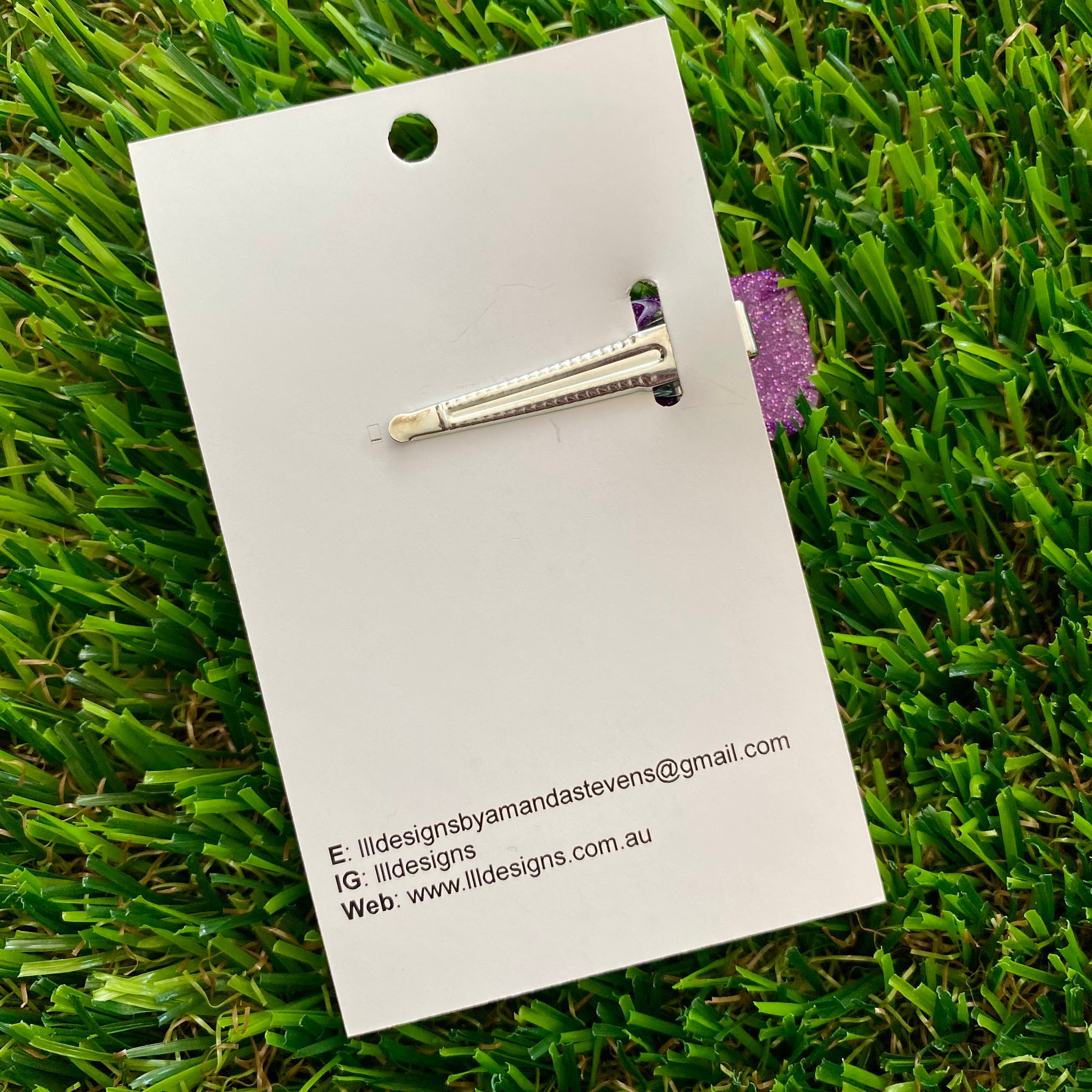 Scroll through photo's to see the size. This hair clip is created by hand poured resin and features a sparkly finish.