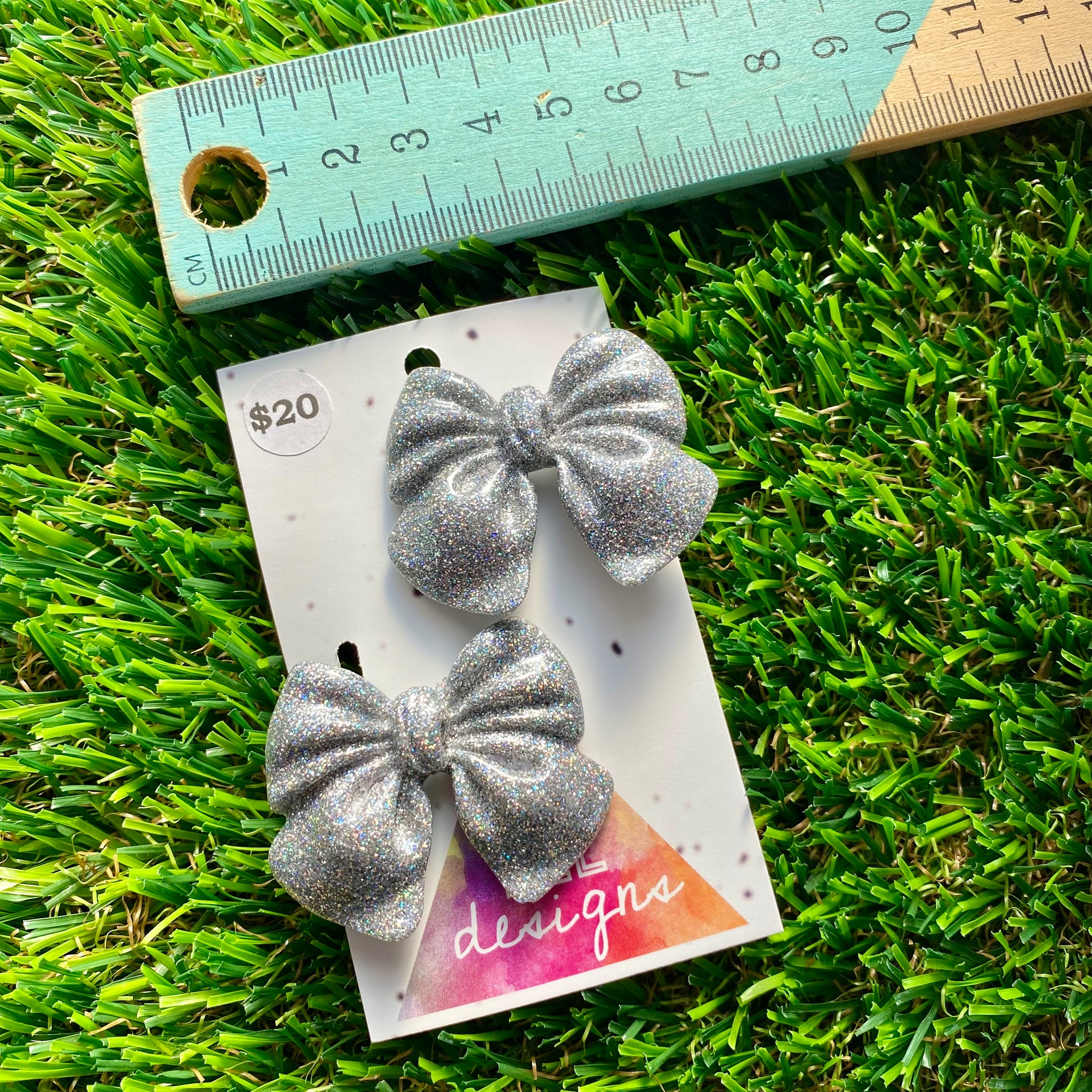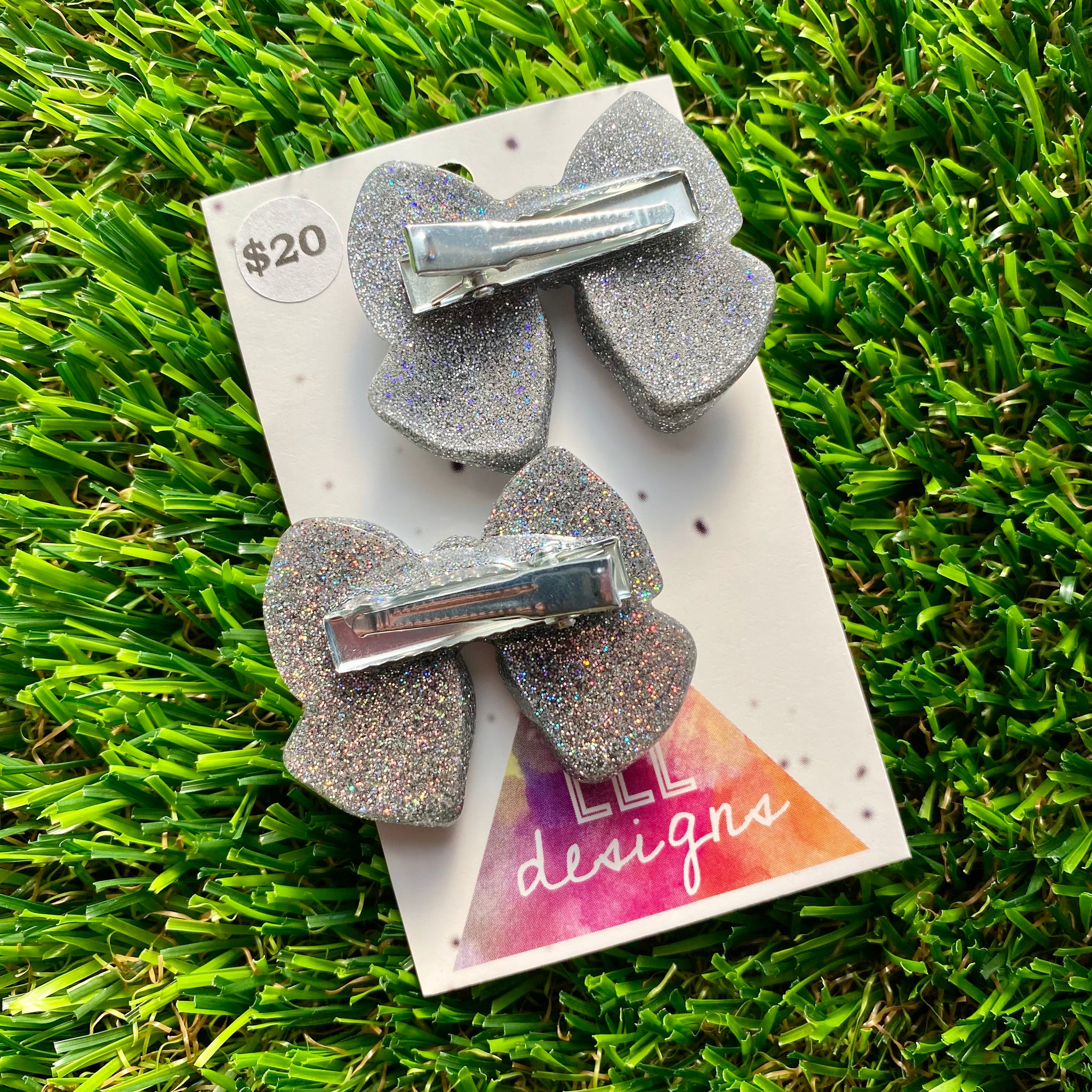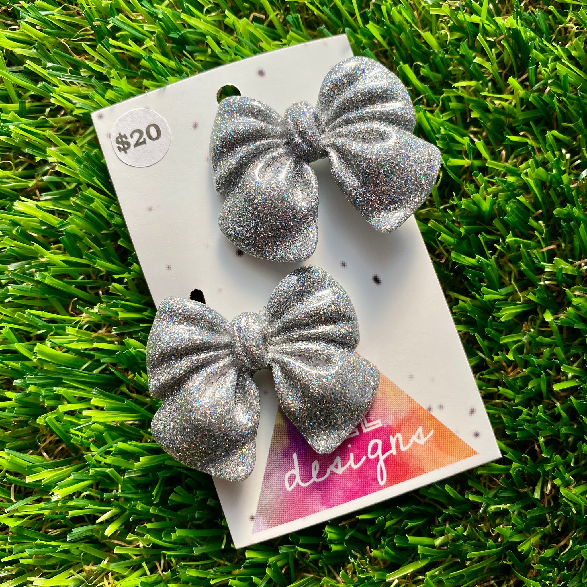 Handmade Resin Hair Clip - Glitter Silver - Large Chunky Bow Hair Clip Pair!