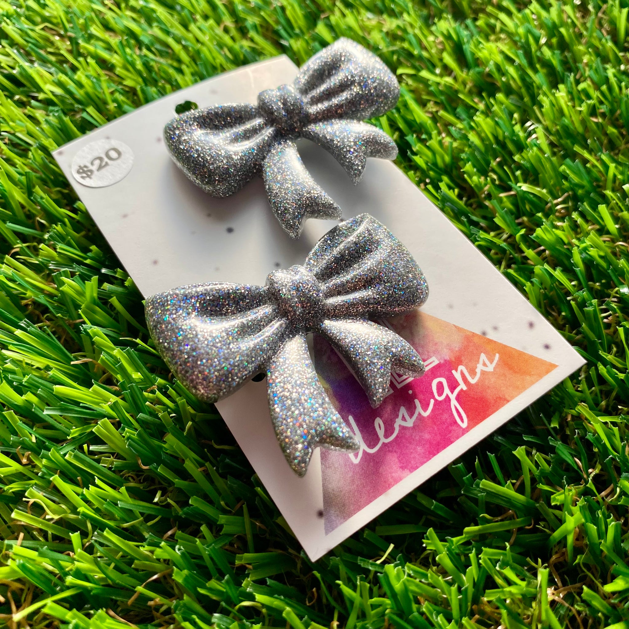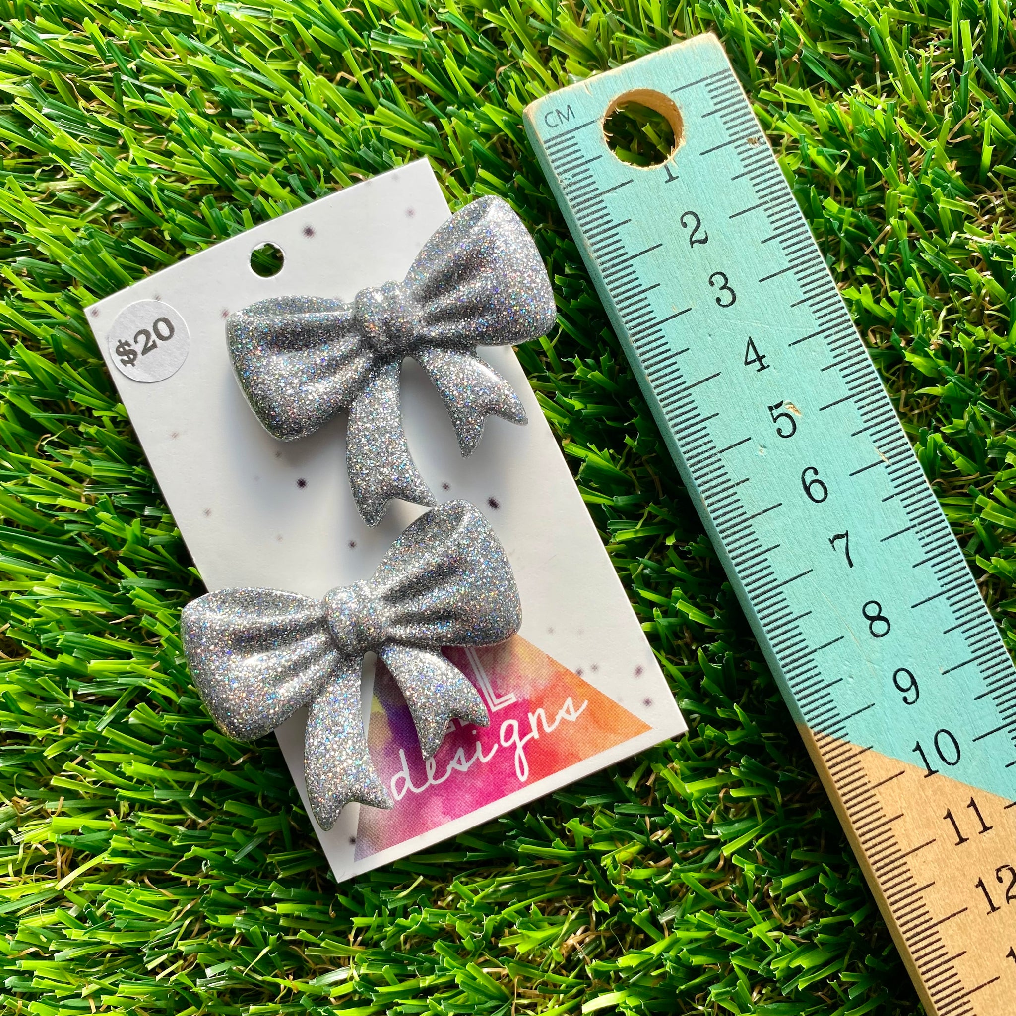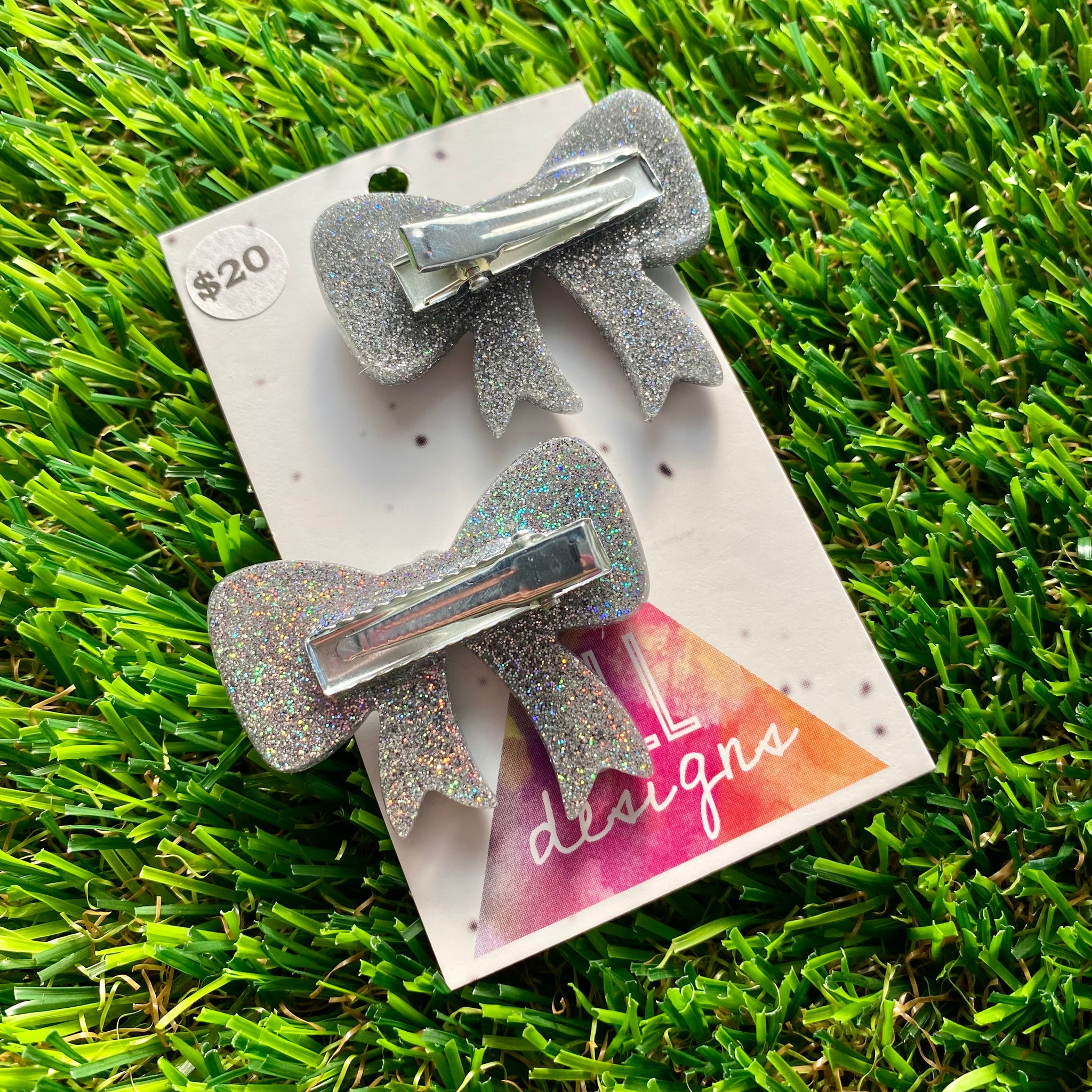 Handmade Resin Hair Clip - Glitter Silver - Large Regular Bow Hair Clip Pair!