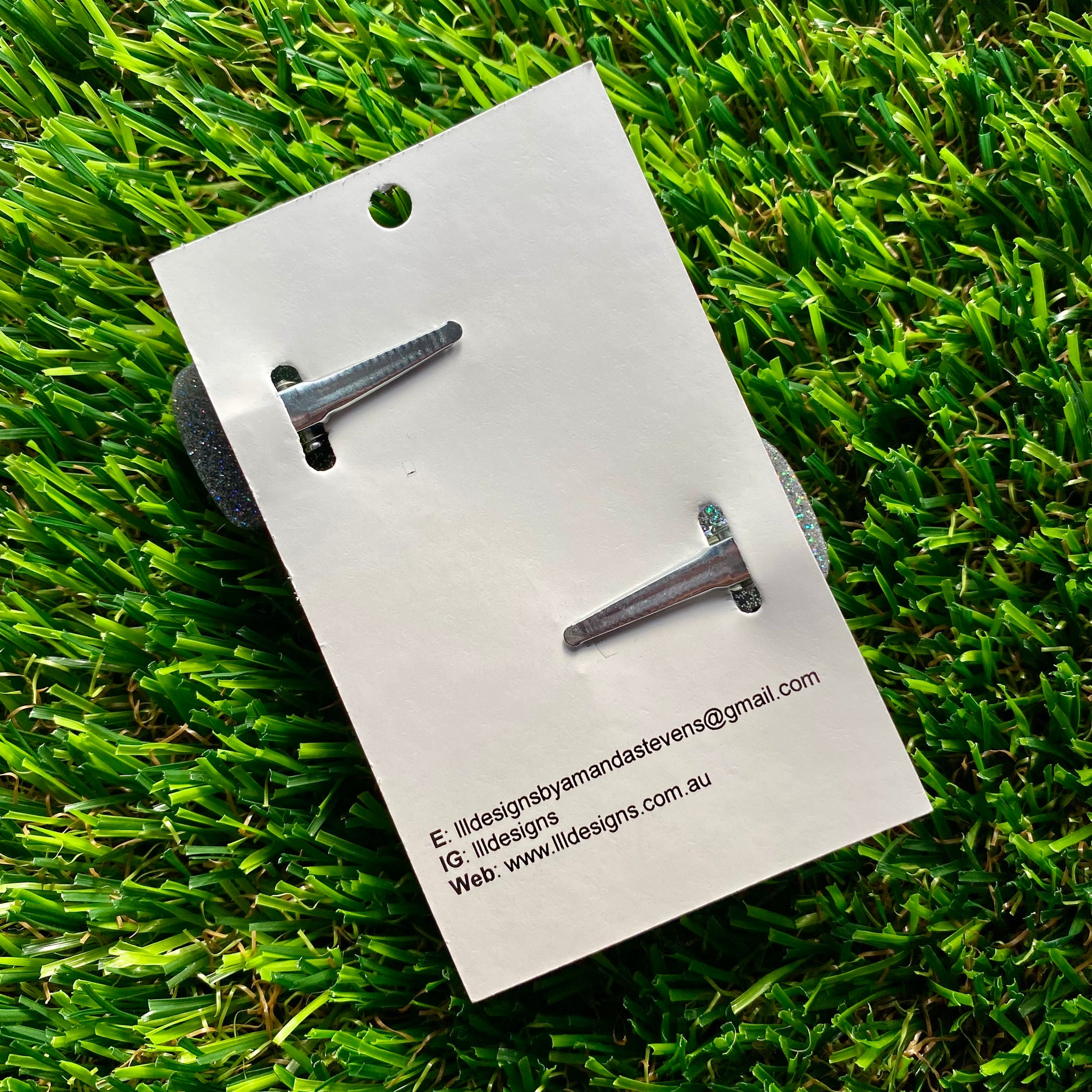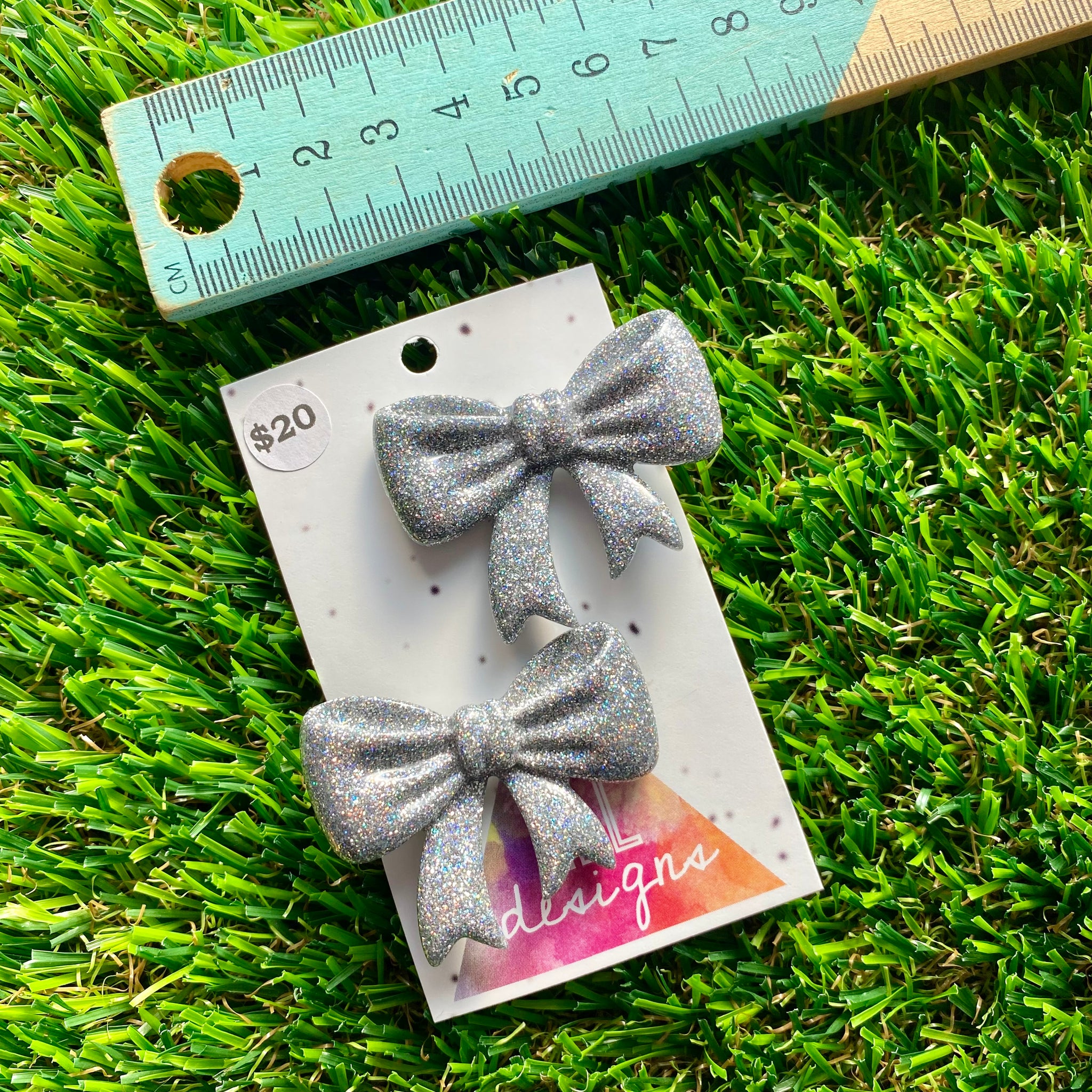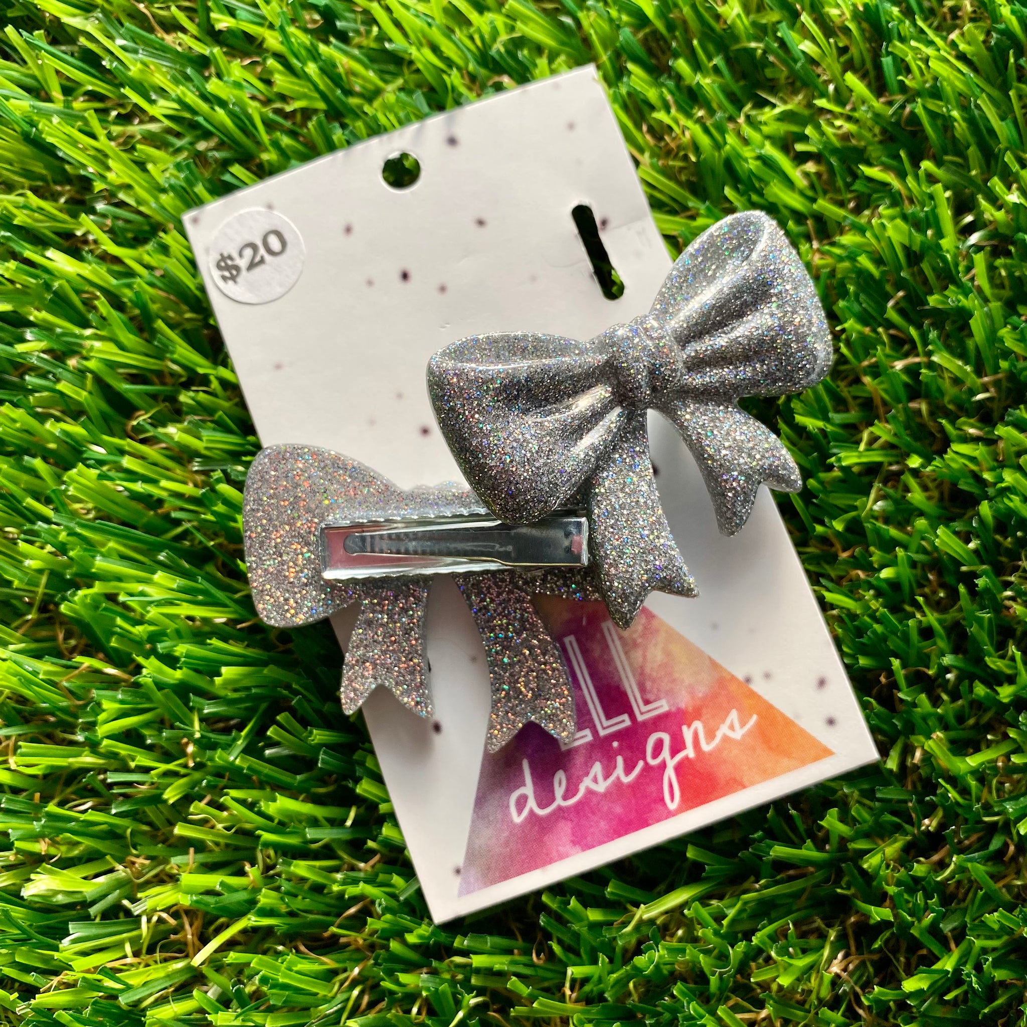 Handmade Resin Hair Clip - Glitter Silver - Large Regular Bow Hair Clip Pair!