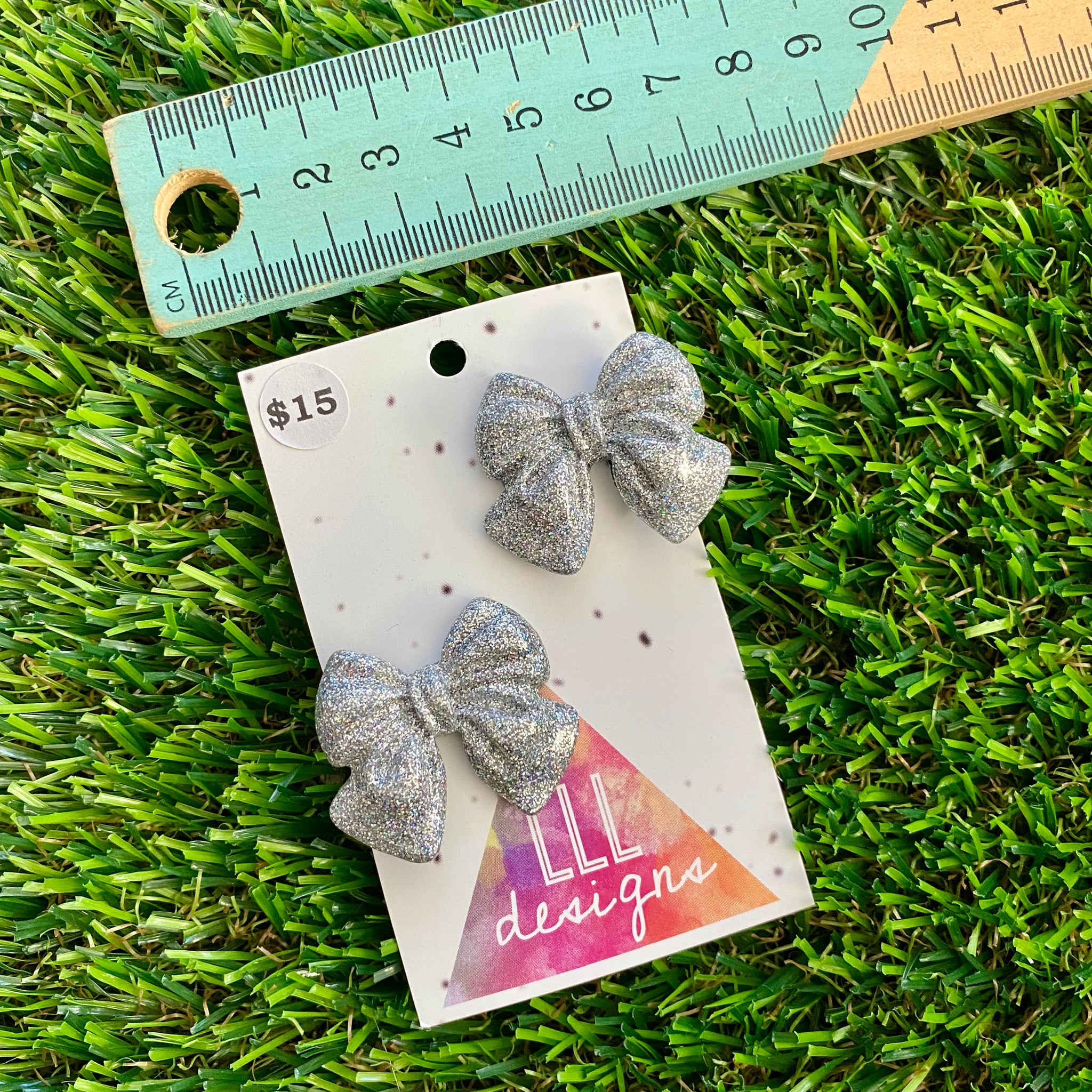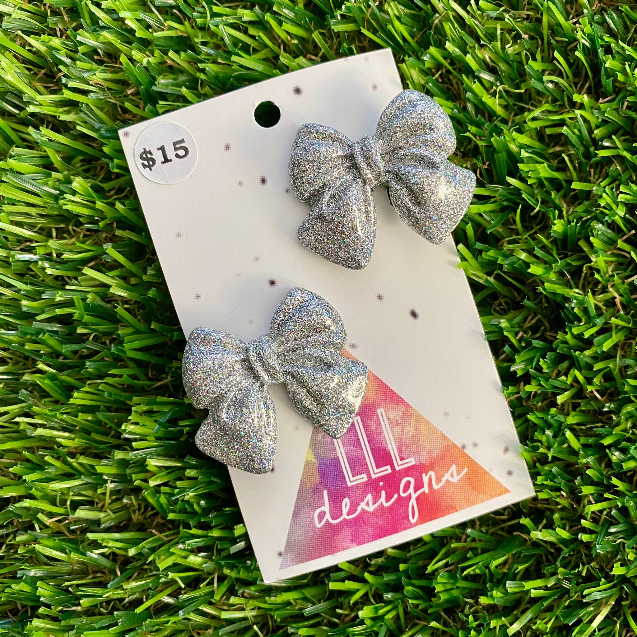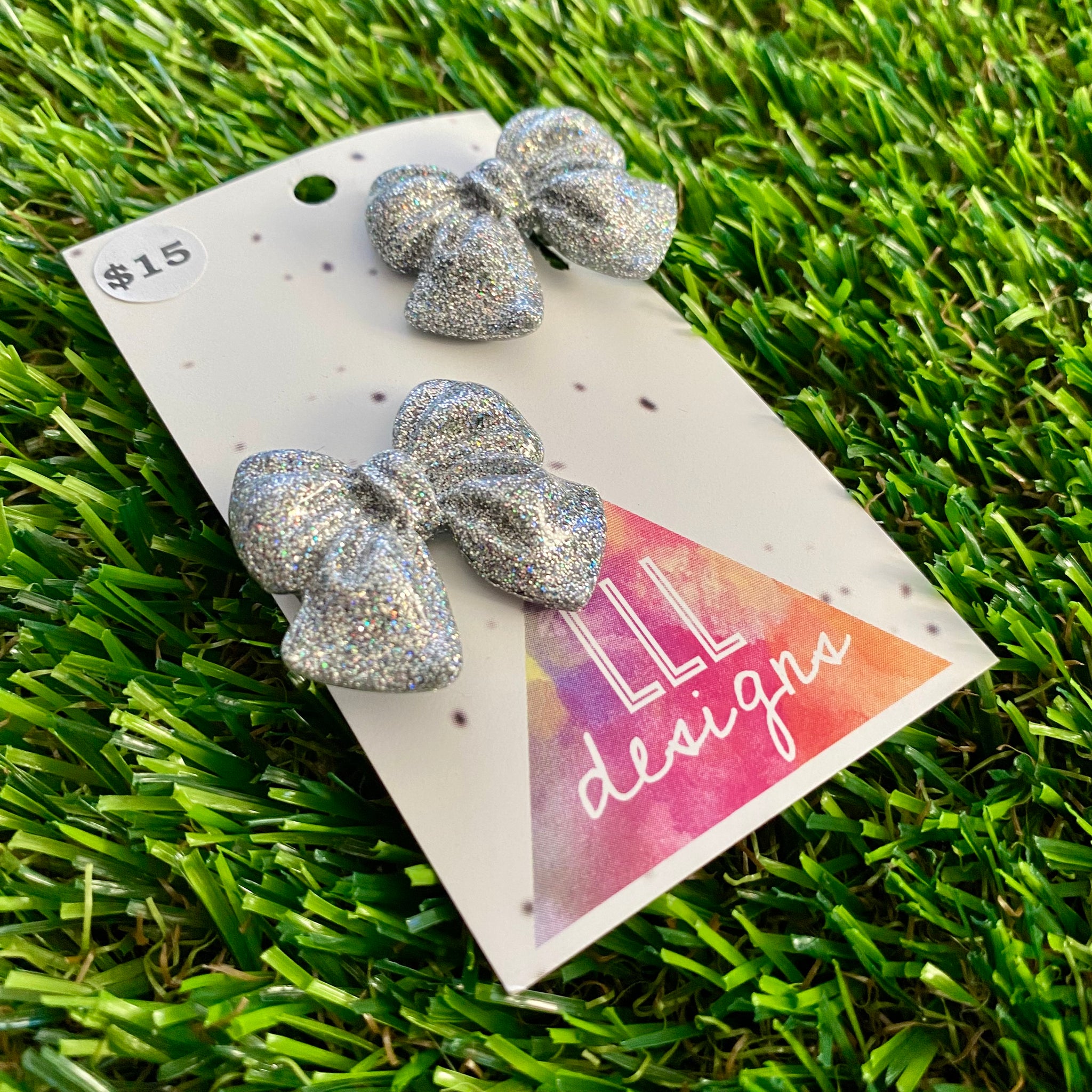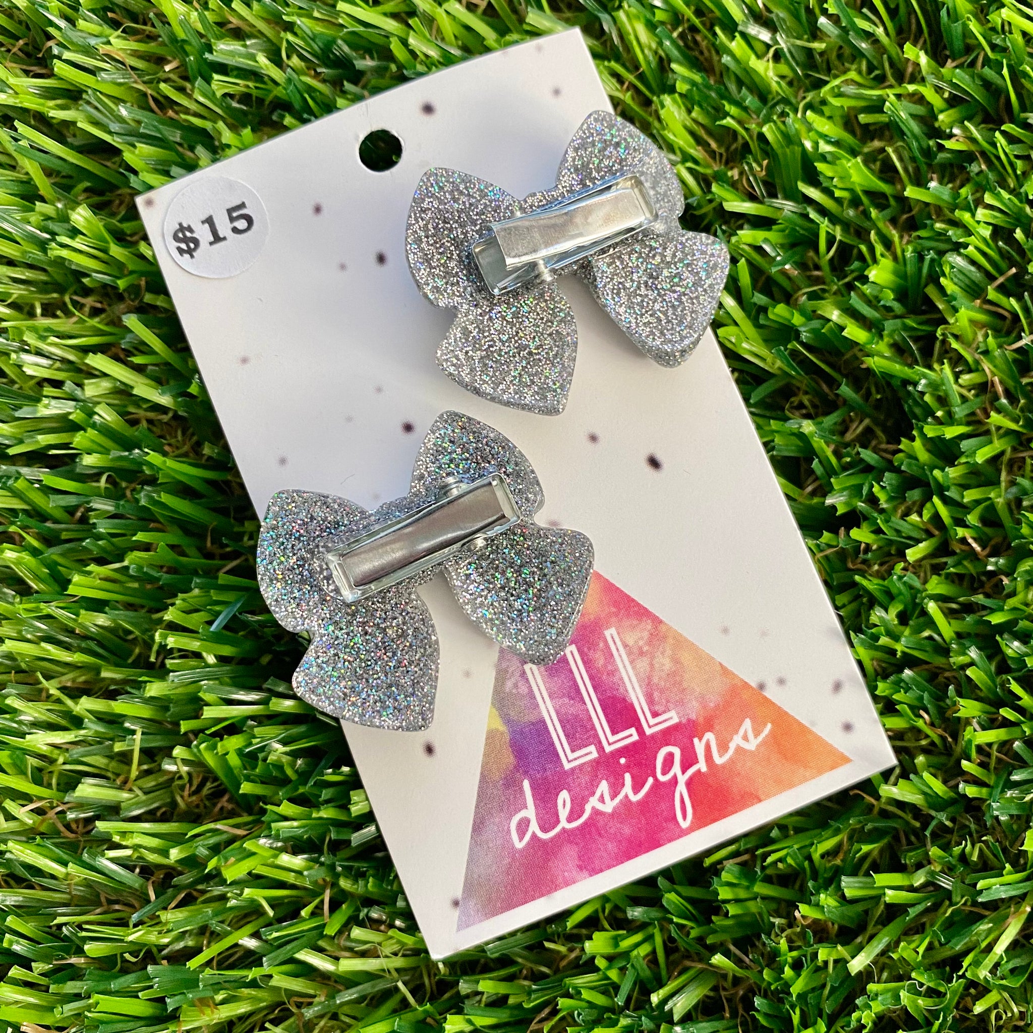 Handmade Resin Hair Clip - Glitter Silver - Medium Chunky Bow Hair Clip Pair!