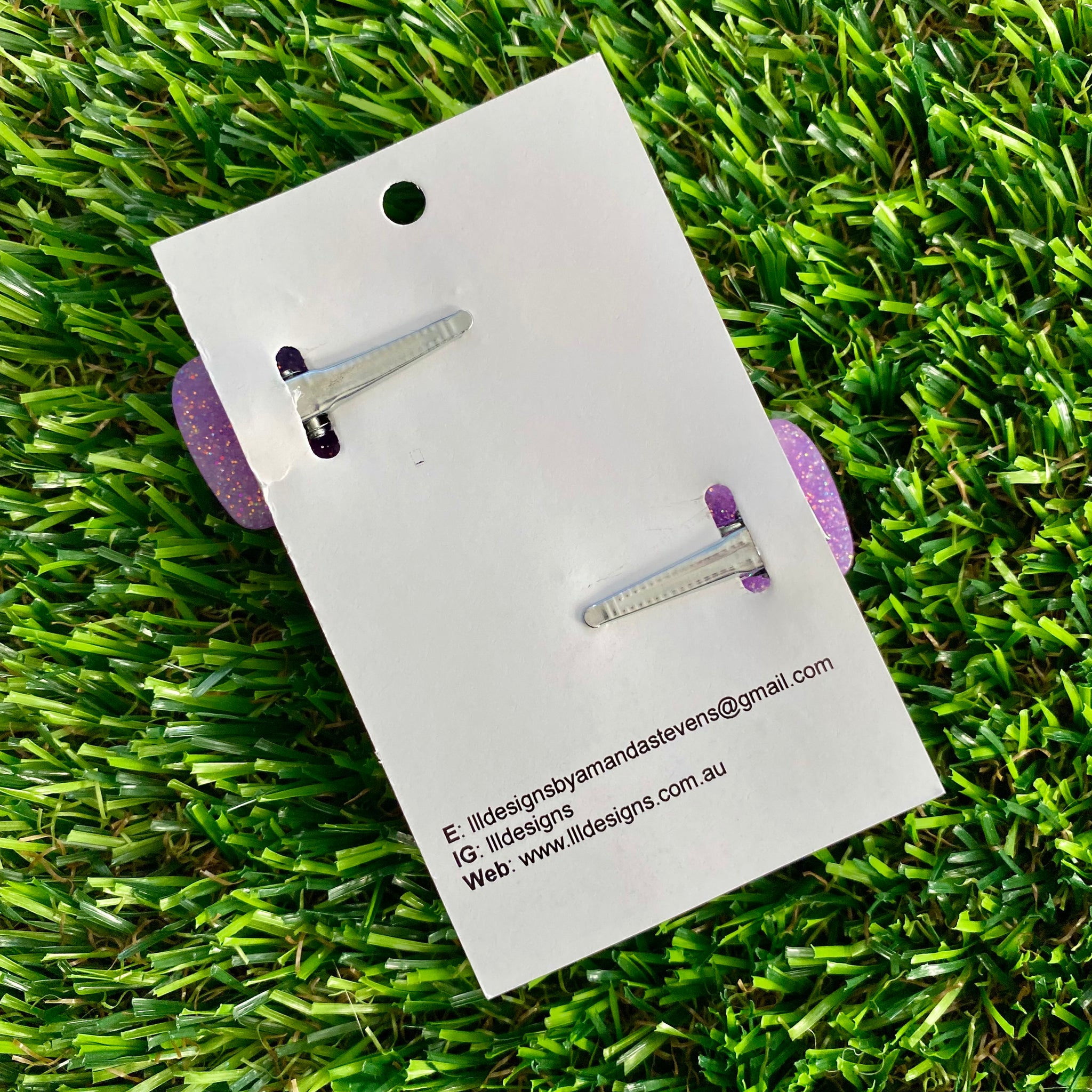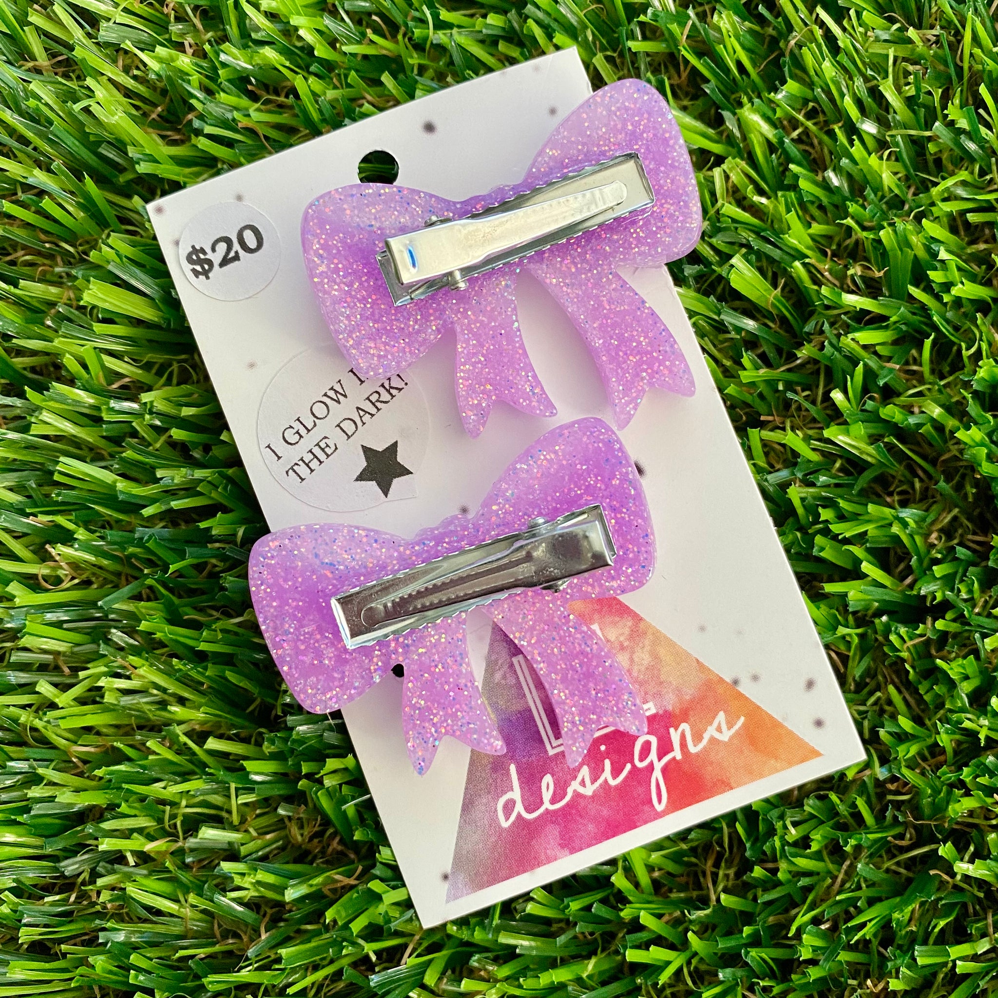 Handmade Resin Hair Clip - Glow In Dark Lavender Glitter - Large Regular Bow Hair Clip Pair!
