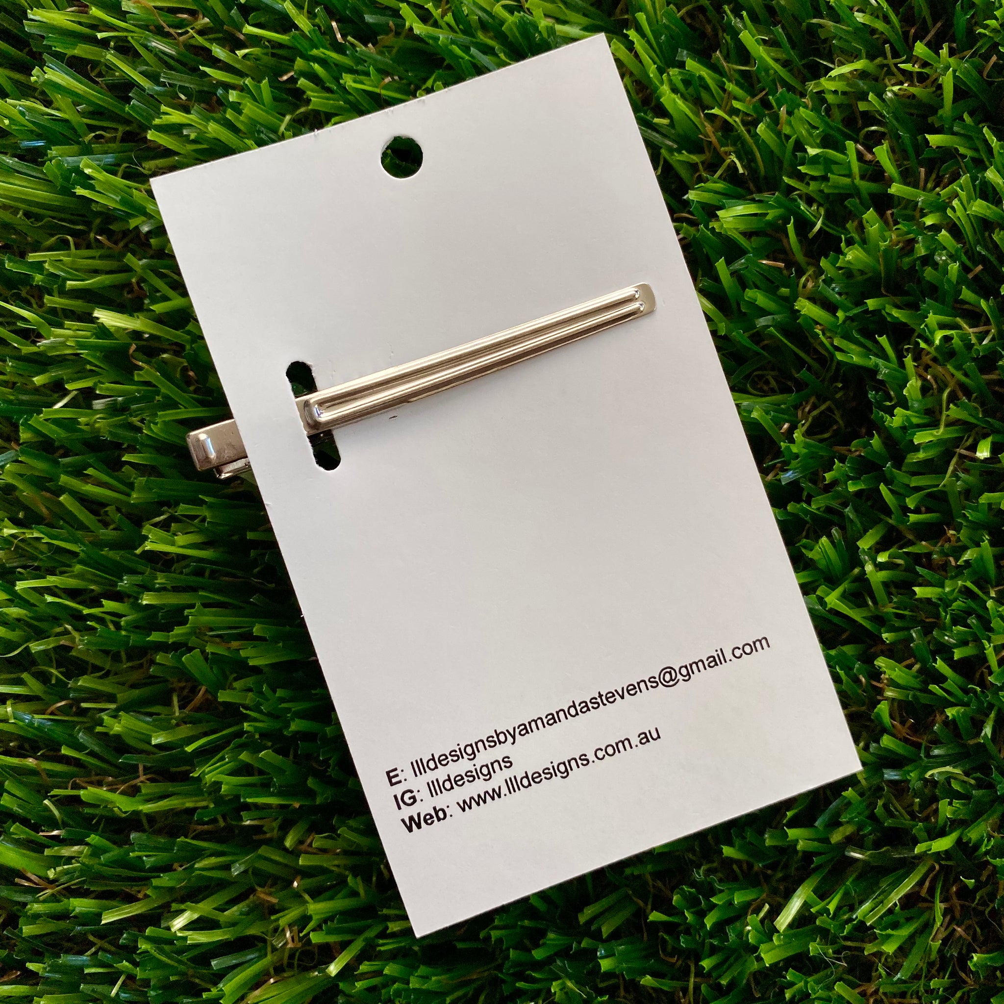Scroll through photo's to see the size. This hair clip is created by hand poured resin and features a sparkly finish.