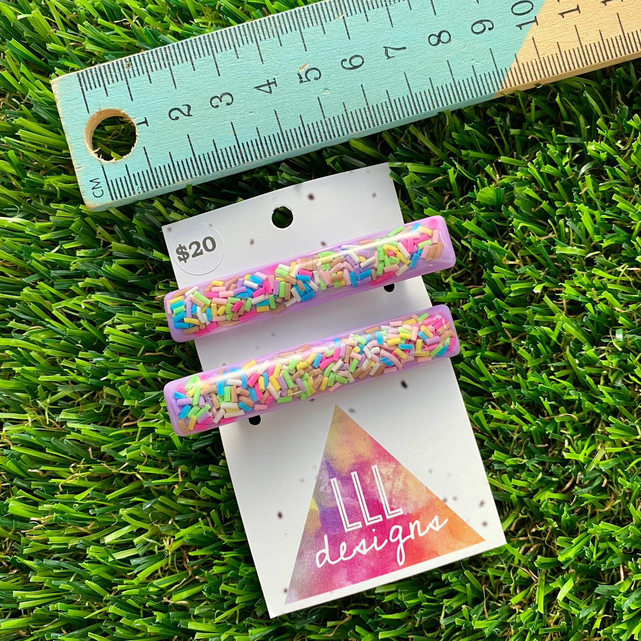 Scroll through photo's to see the size. These hand poured hair clips feature placed Sprinkles, allowing for a one of a kind finish.