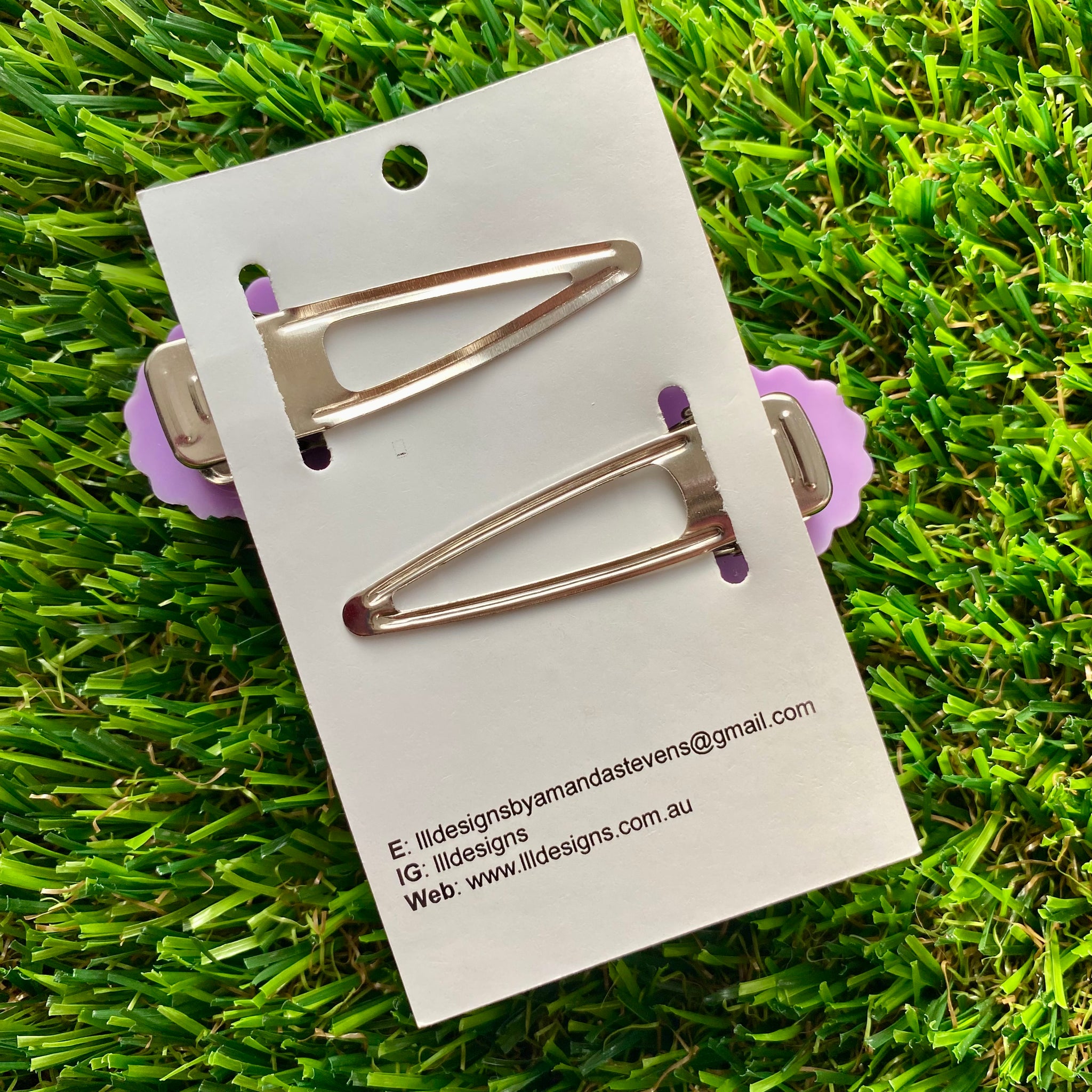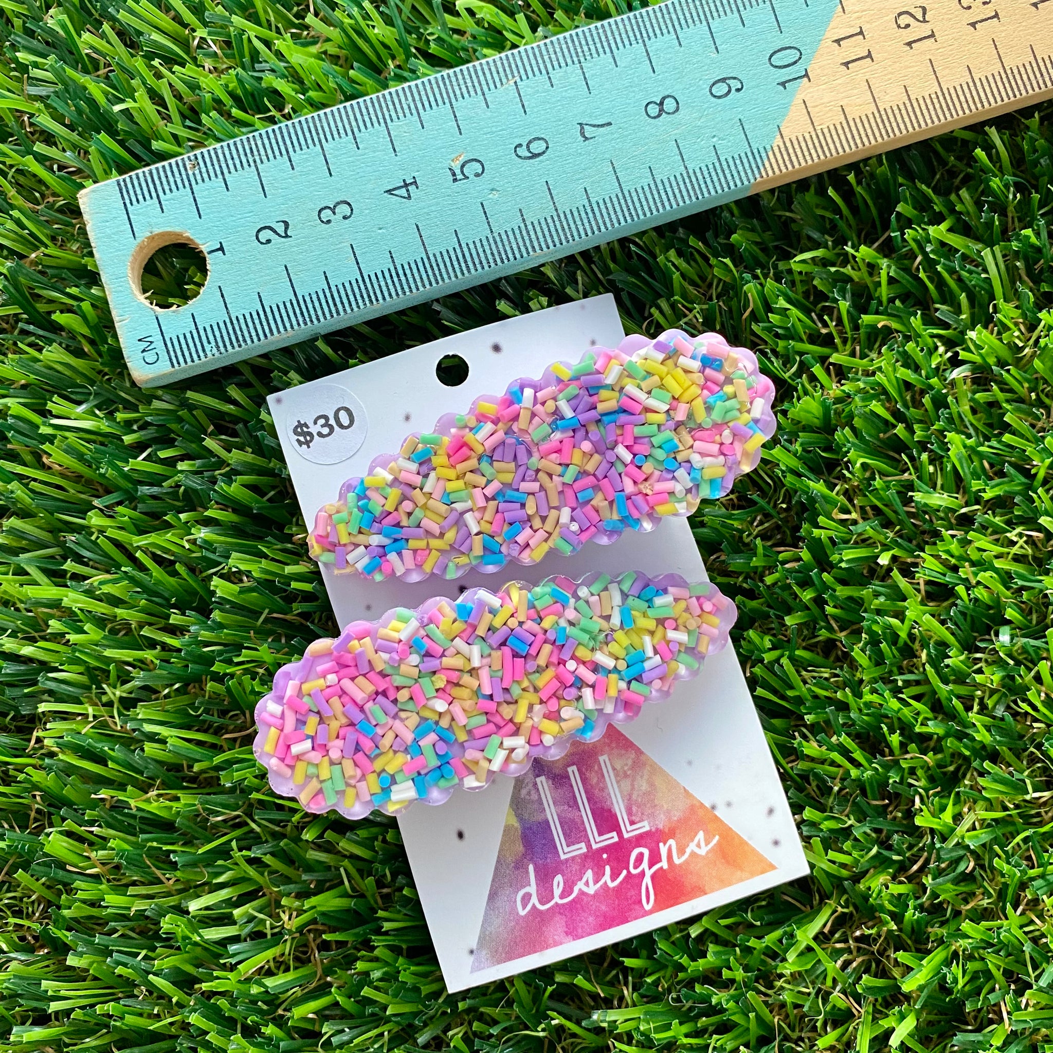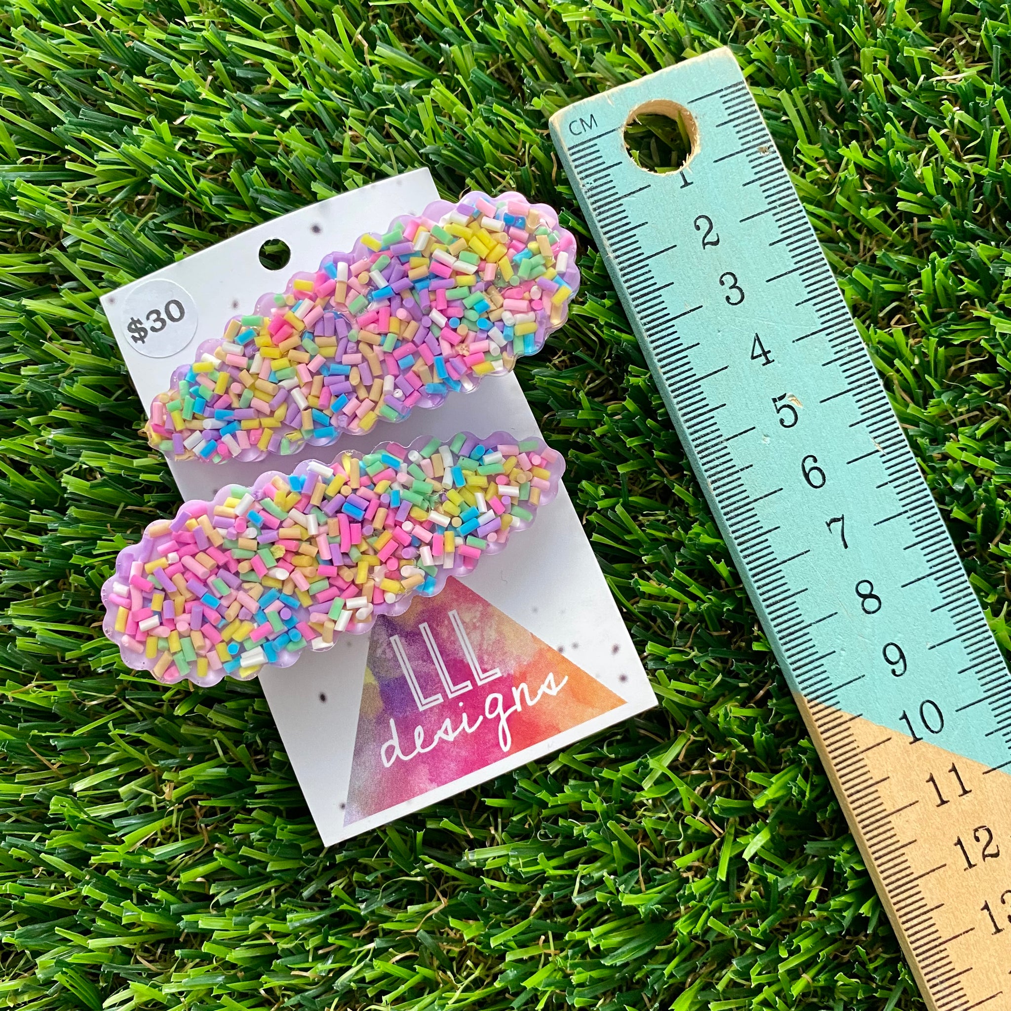 Scroll through photo's to see the size. These hand poured hair clips feature placed sprinkles, allowing for a one of a kind finish.