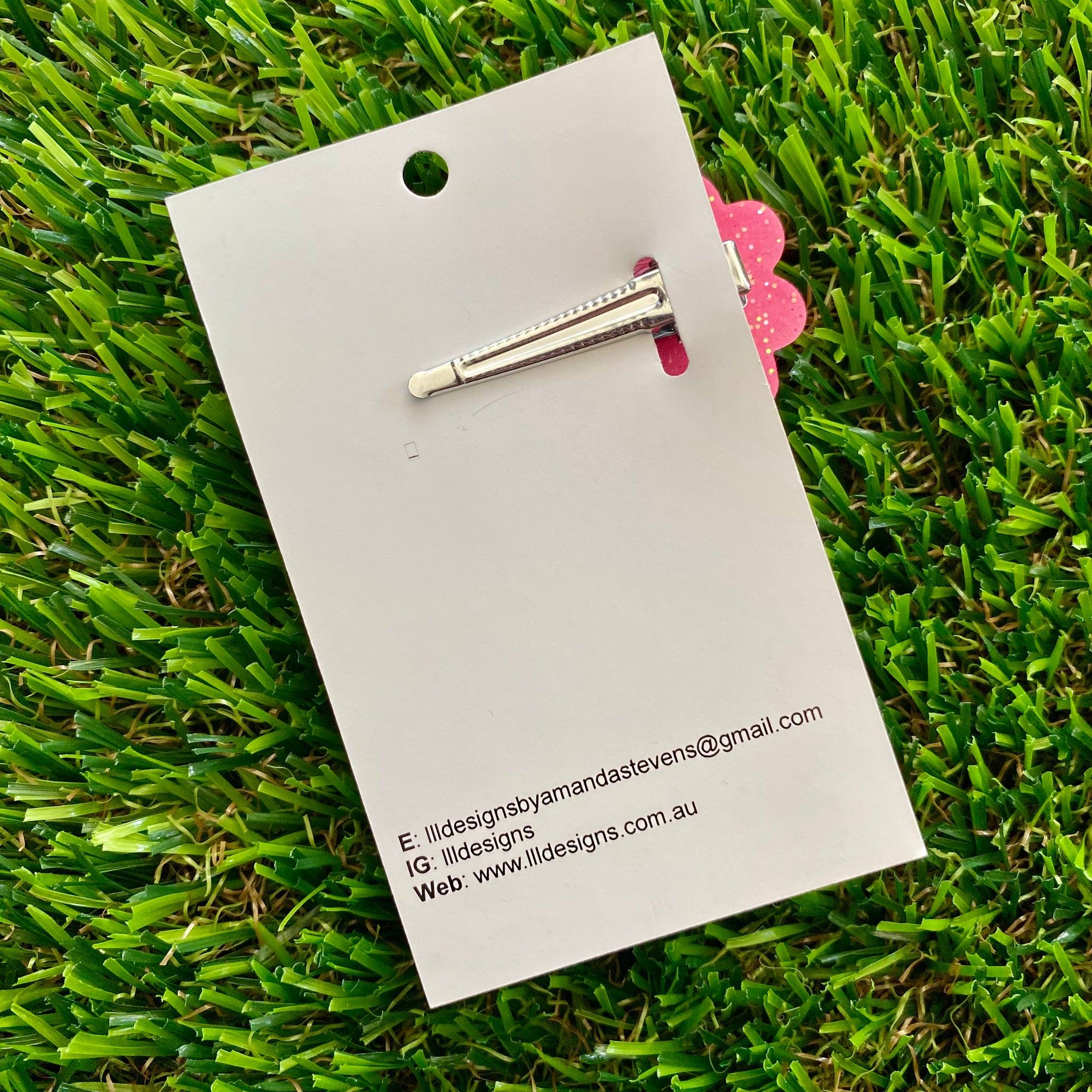Scroll through photo's to see the size. This hair clip is created by hand poured resin and features a sparkly finish.