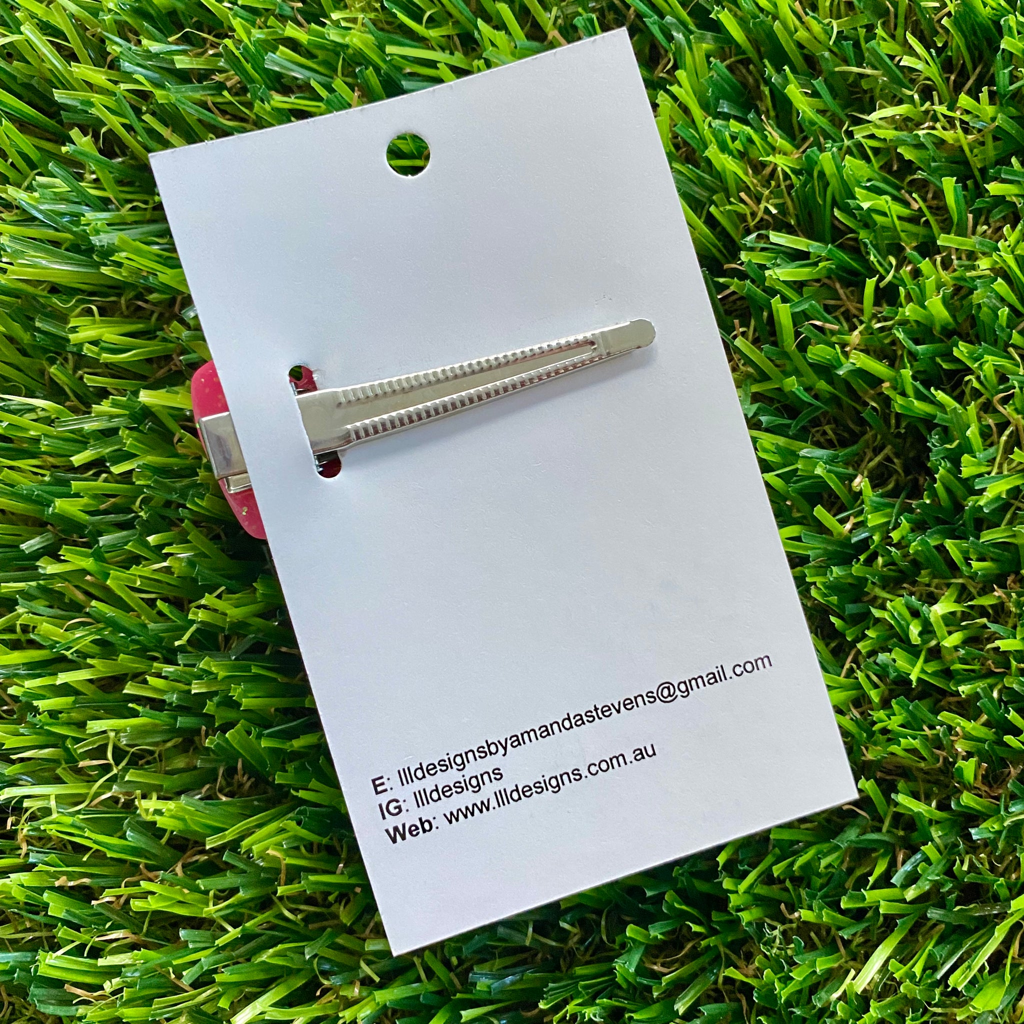 Scroll through photo's to see the size. This hair clip is created by hand poured resin and features a sparkly finish.