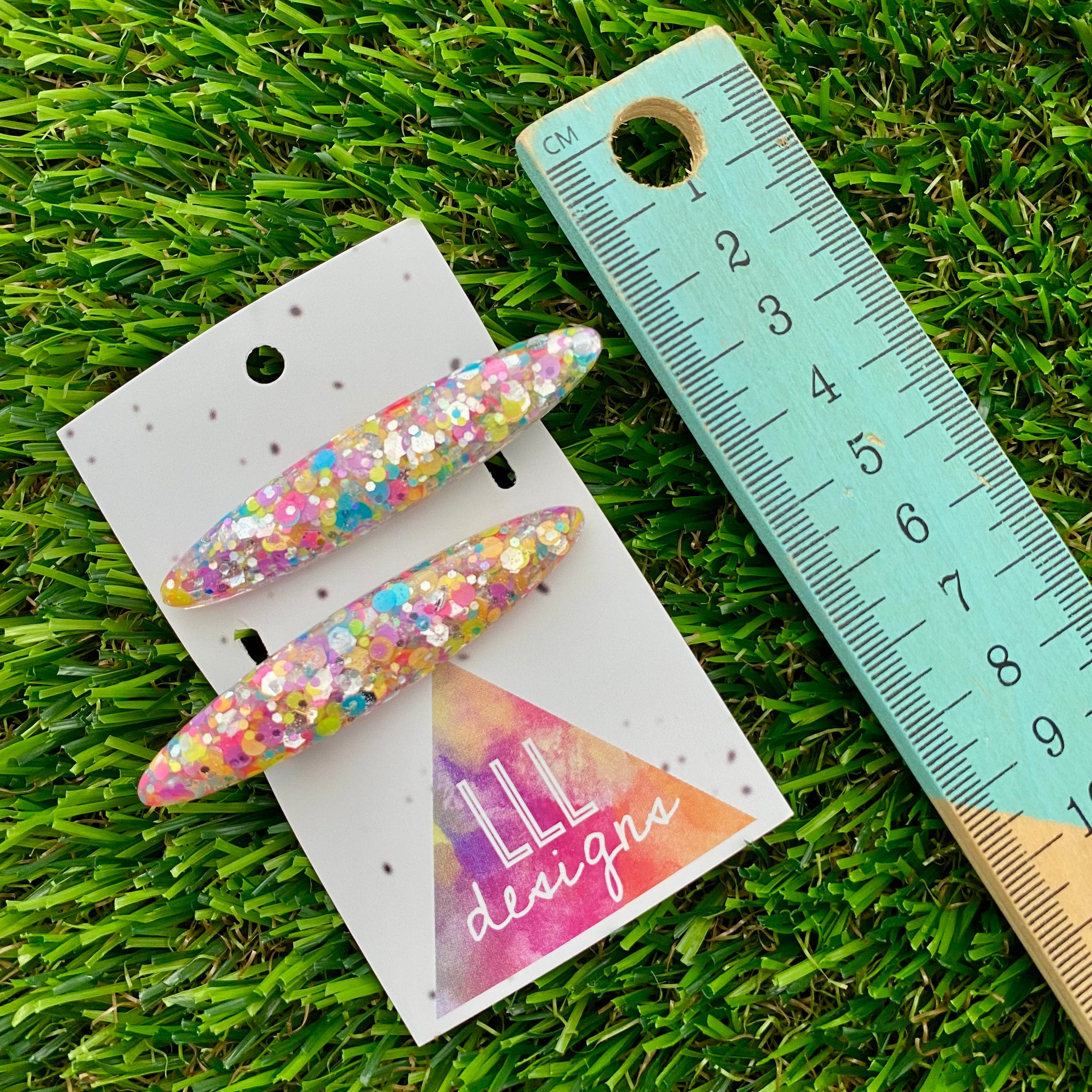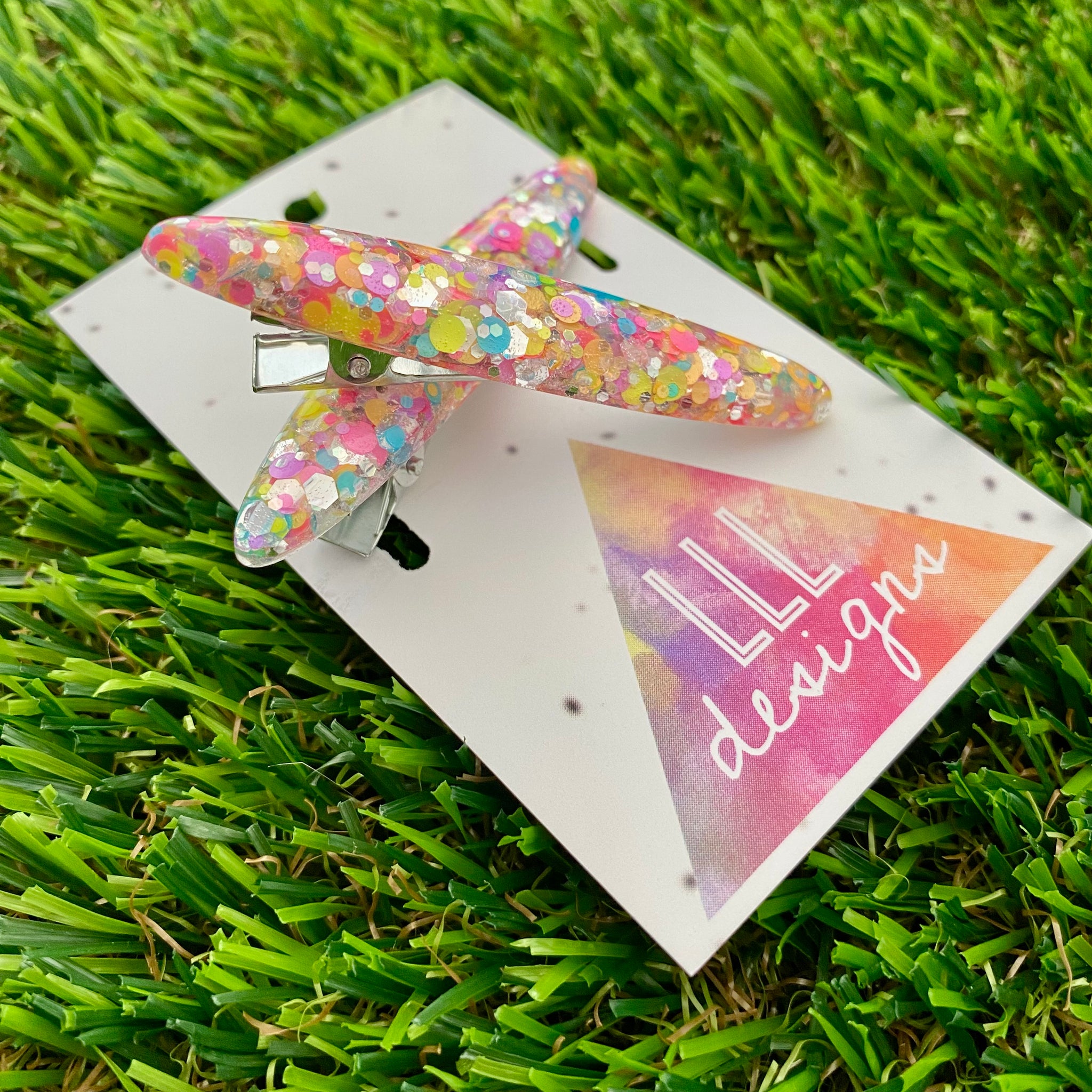 Scroll through photo's to see the size. These hand poured hair clips feature placed confetti, allowing for a one of a kind finish.