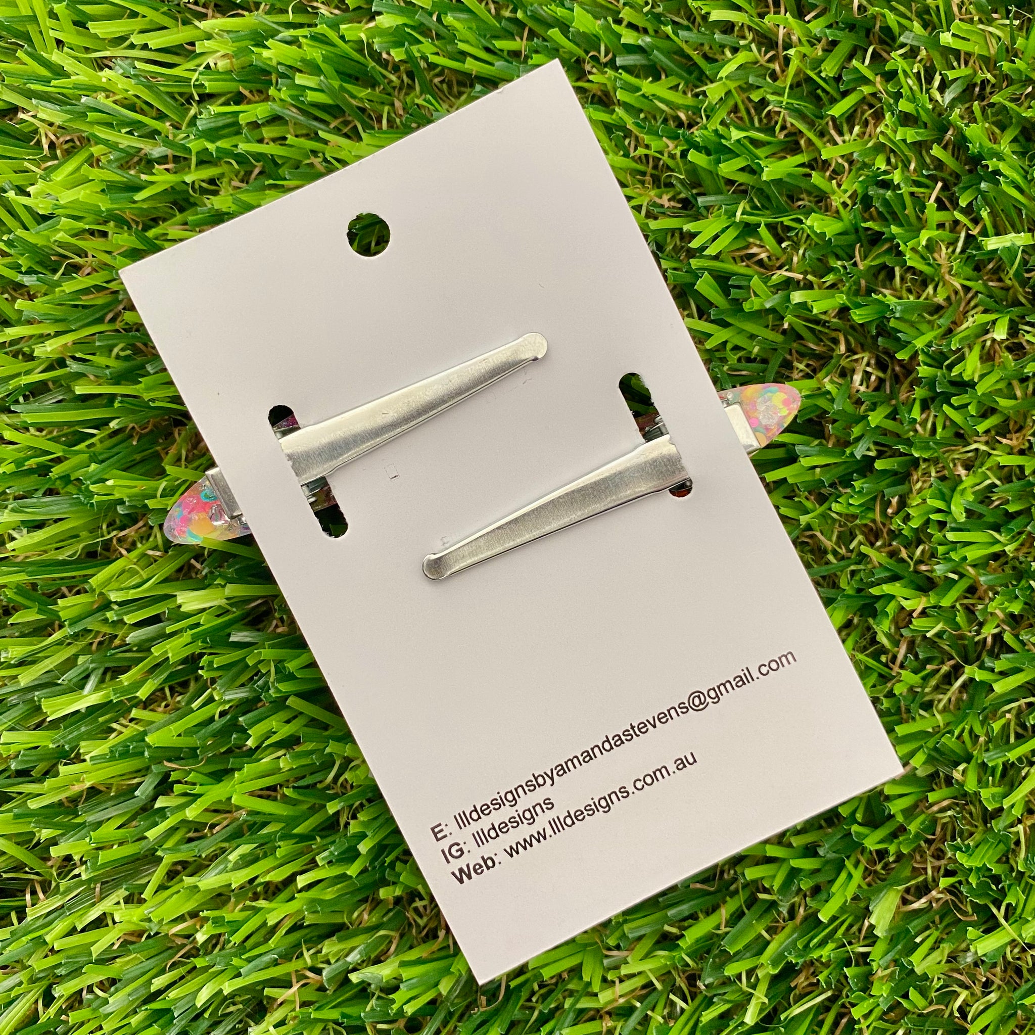 Handmade Resin Hair Clip - Silver Rainbow Confetti Hair Clip Pair Featuring a Rounded Edge!
