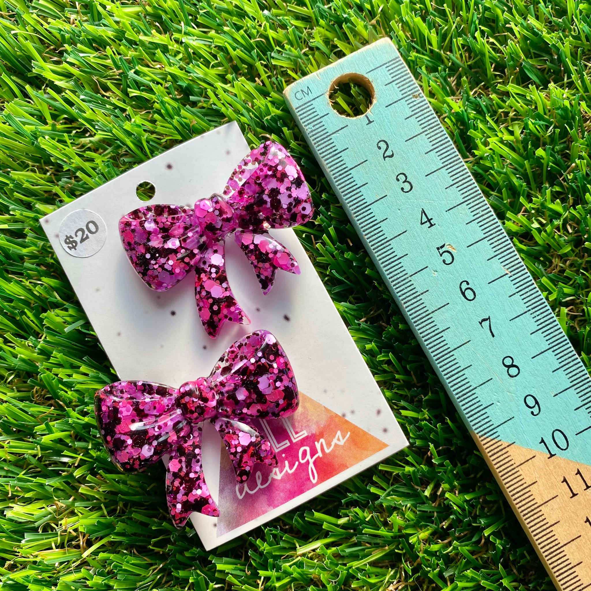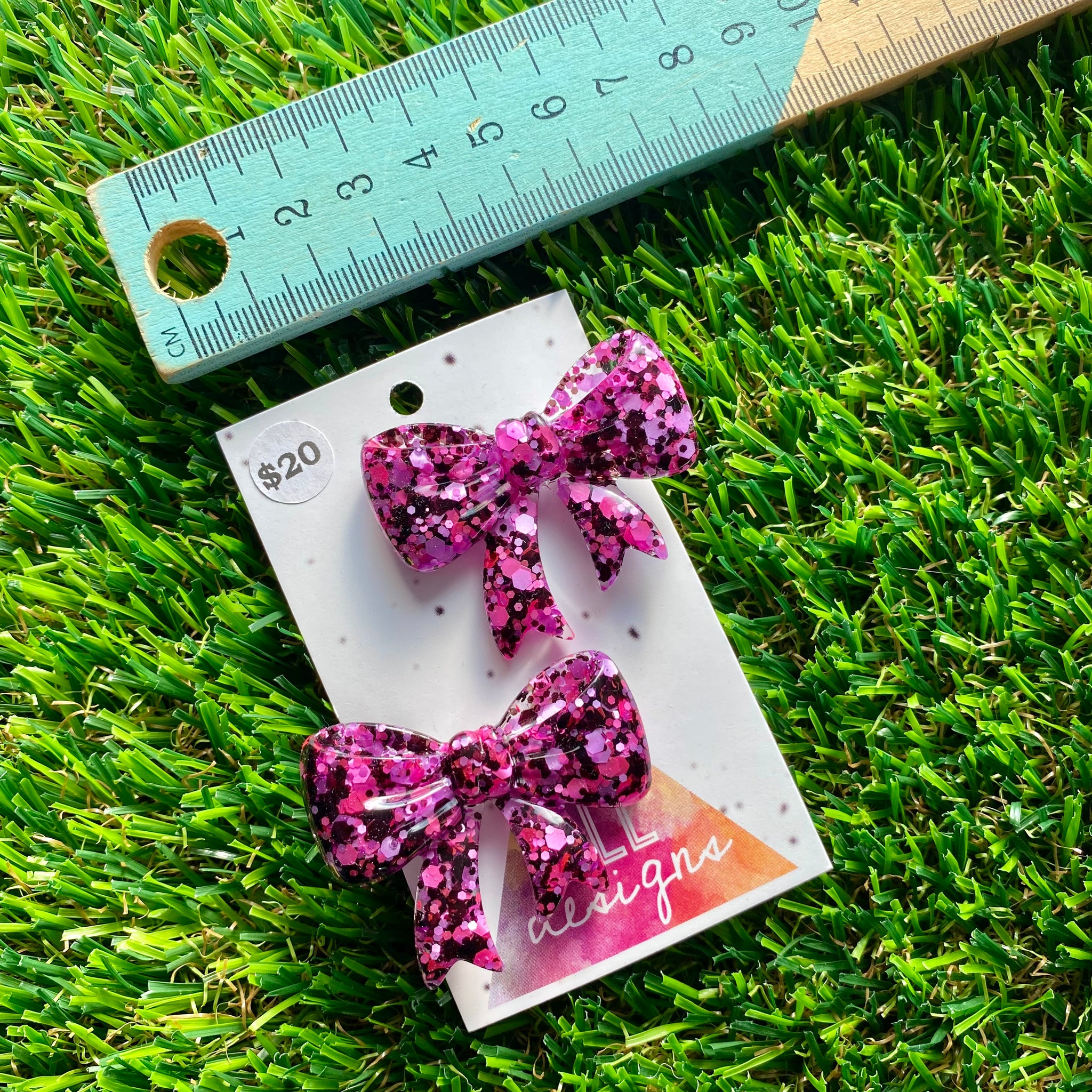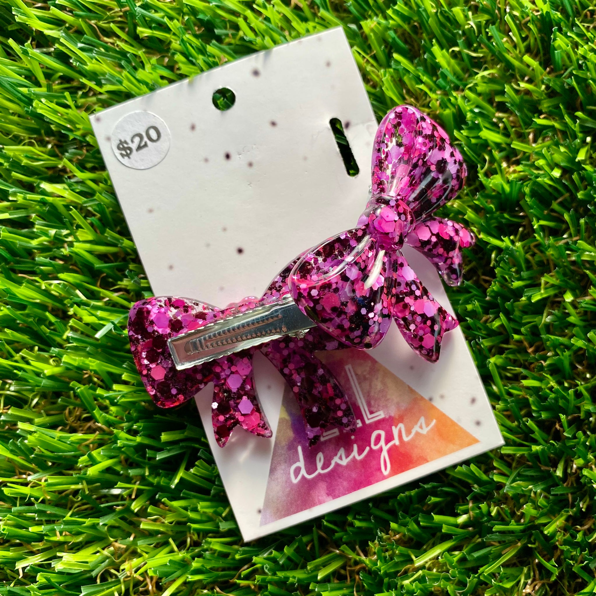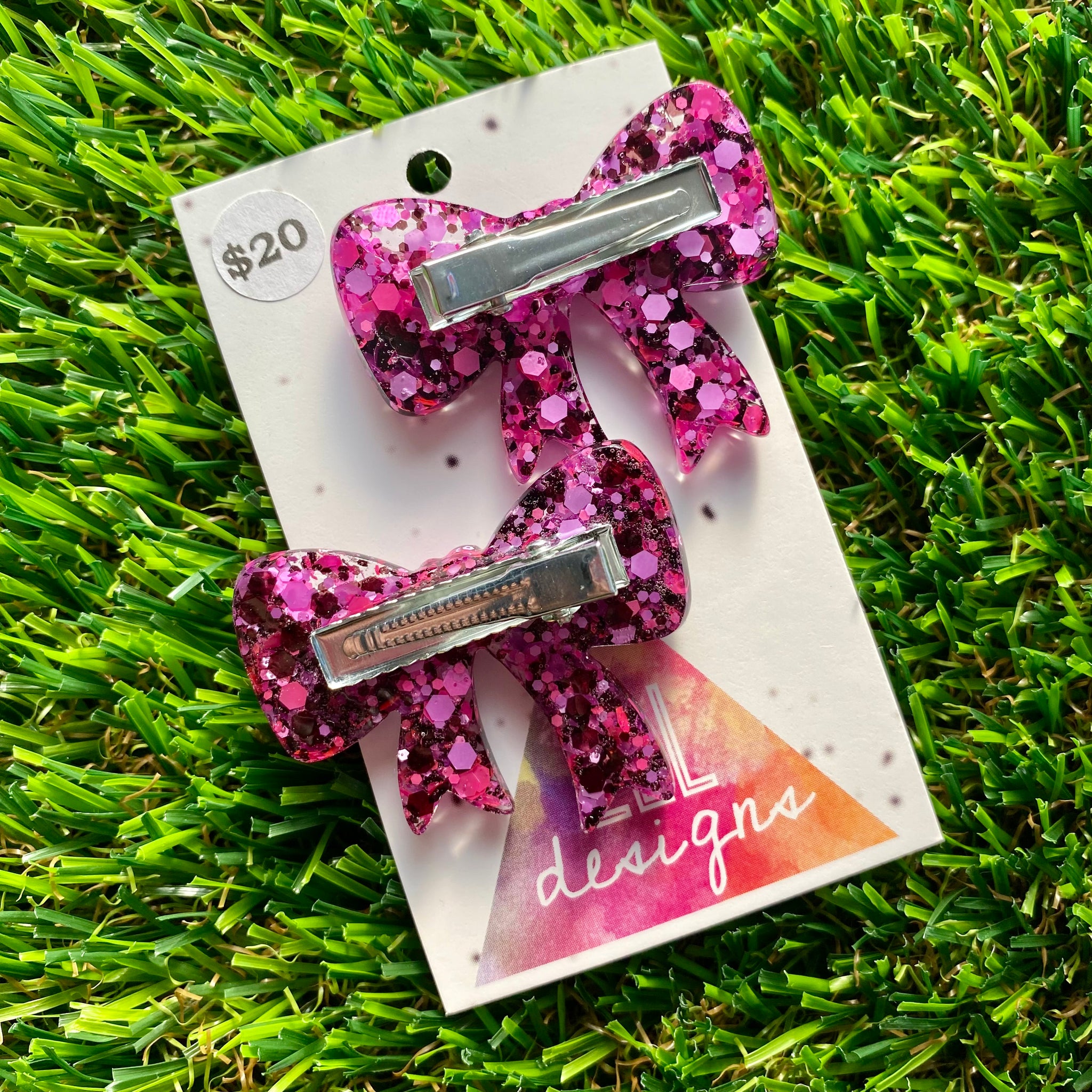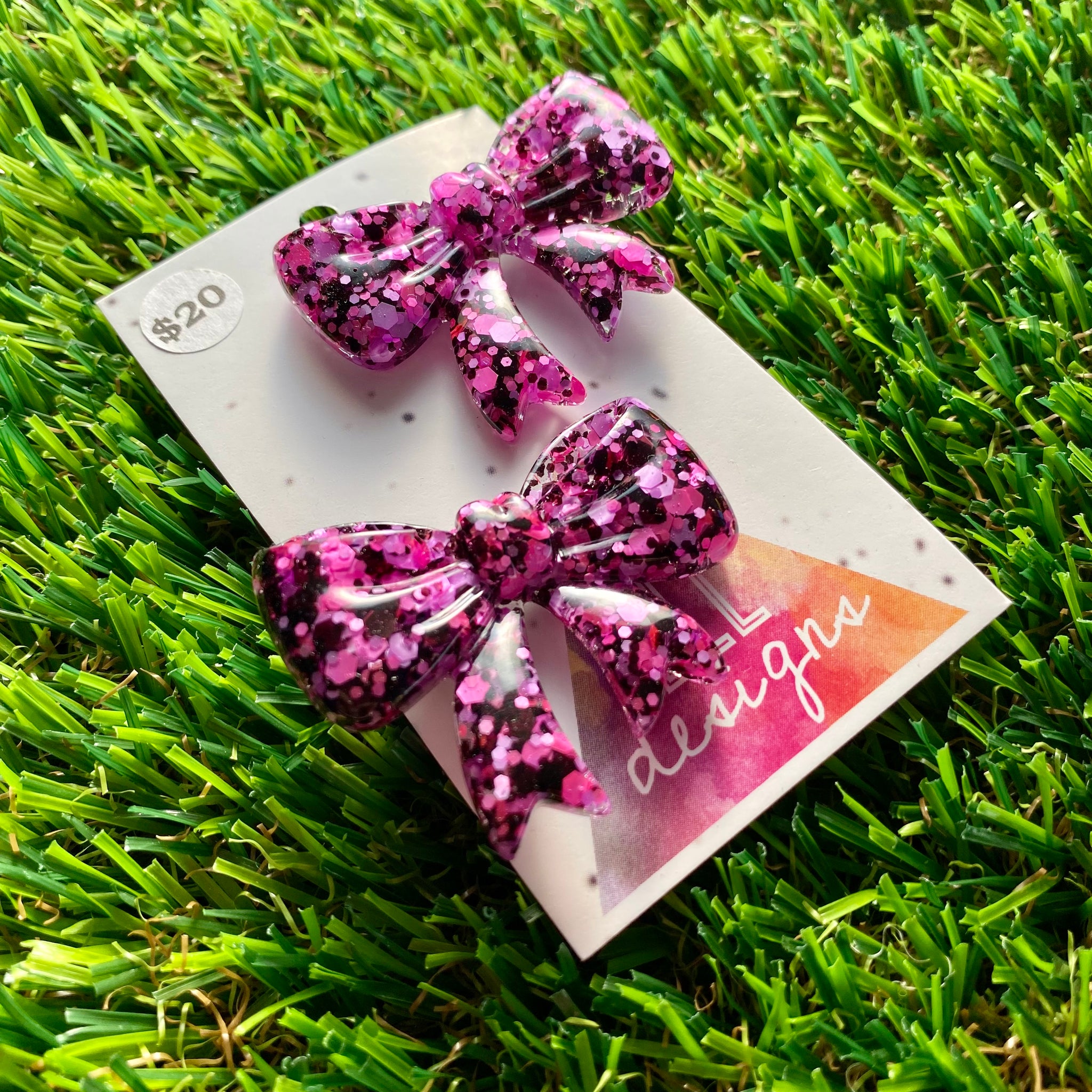 Handmade Resin Hair Clip - Pink and Black Confetti - Large Regular Bow Hair Clip Pair!