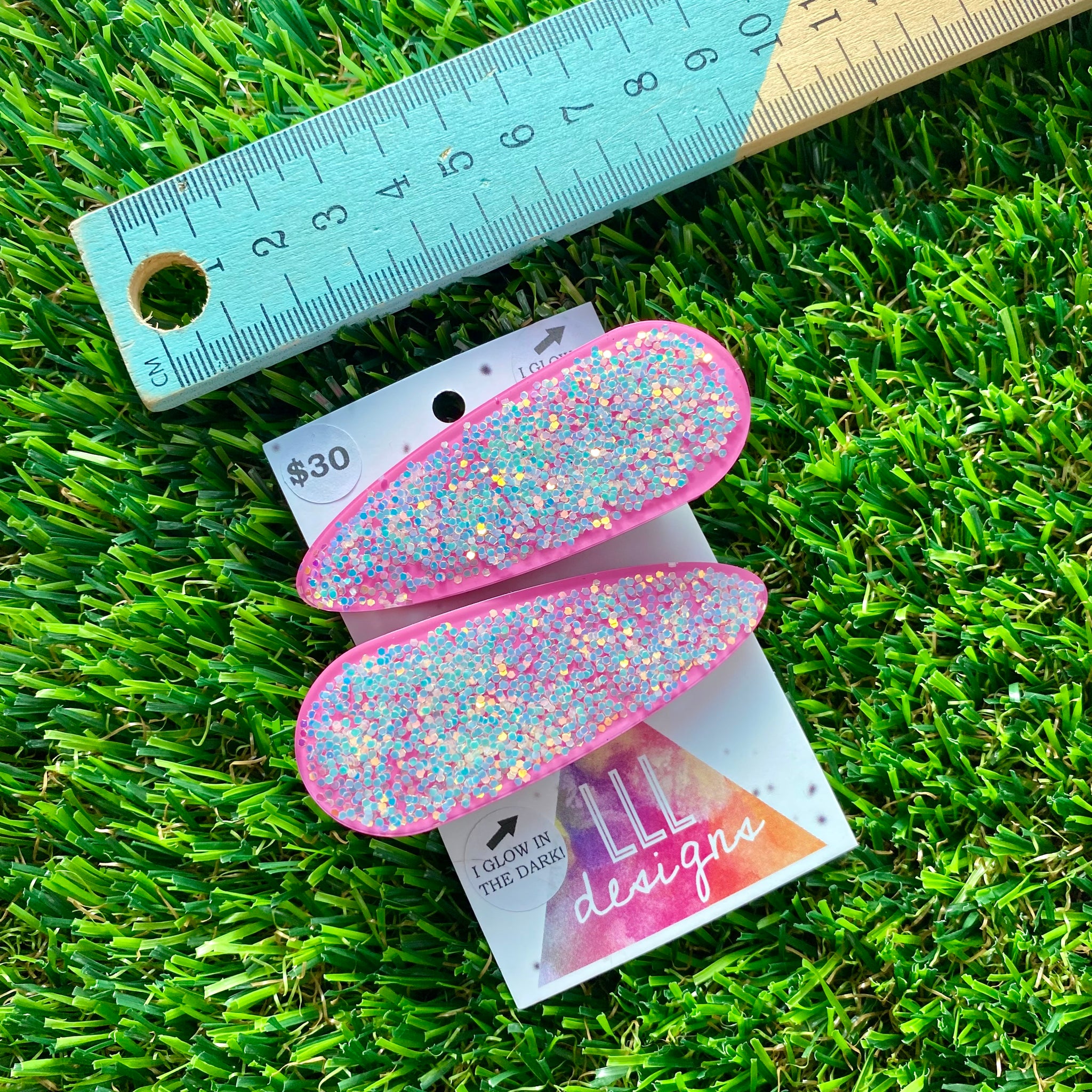 Handmade Resin Hair Clip - Pink Duel Layered Glow In Dark Glitter Confetti Hair Clip Pair!