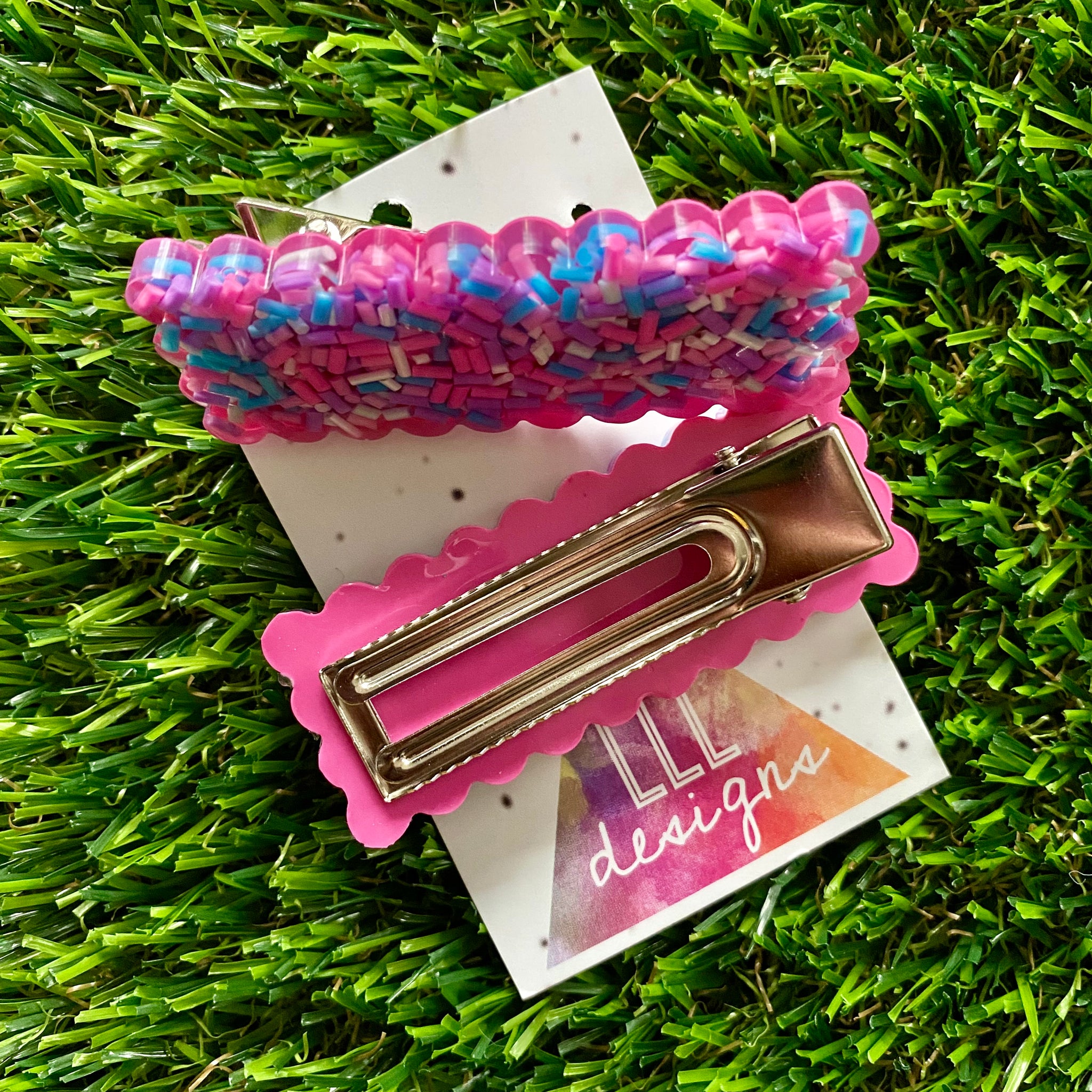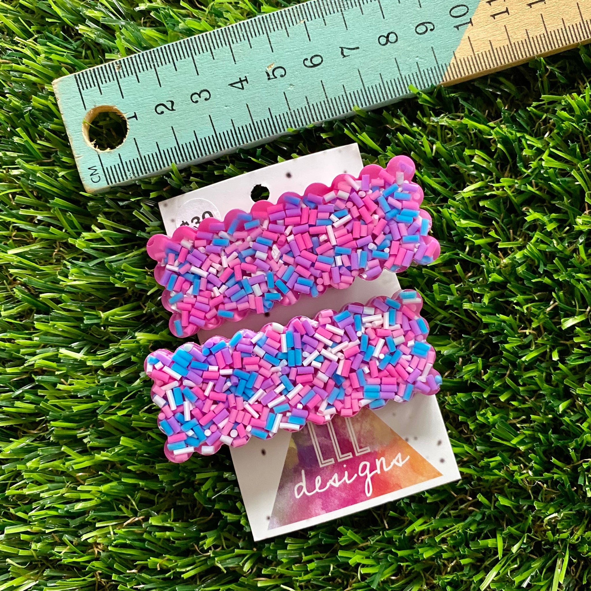 Scroll through photo's to see the size. These hand poured hair clips feature placed sprinkles, allowing for a one of a kind finish.