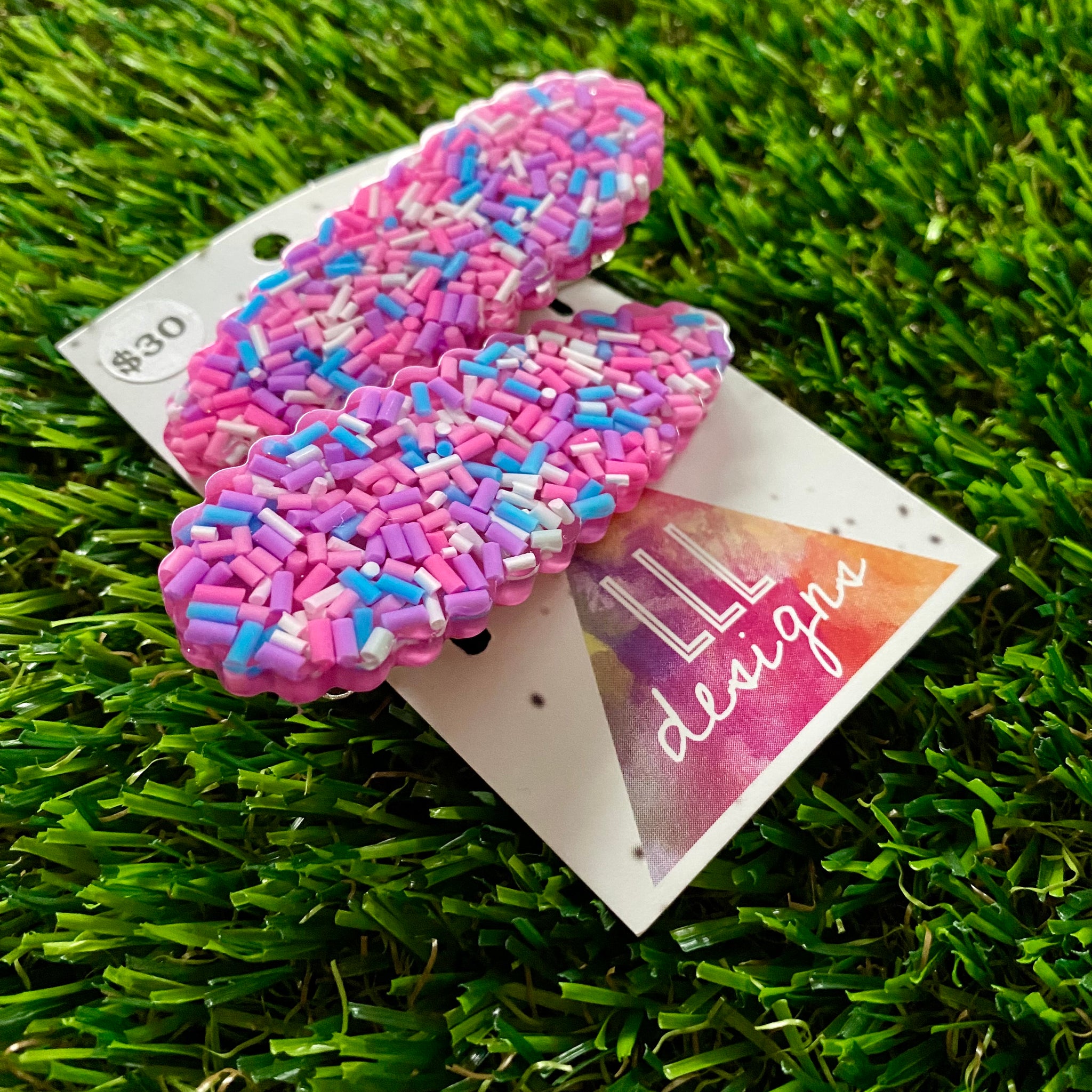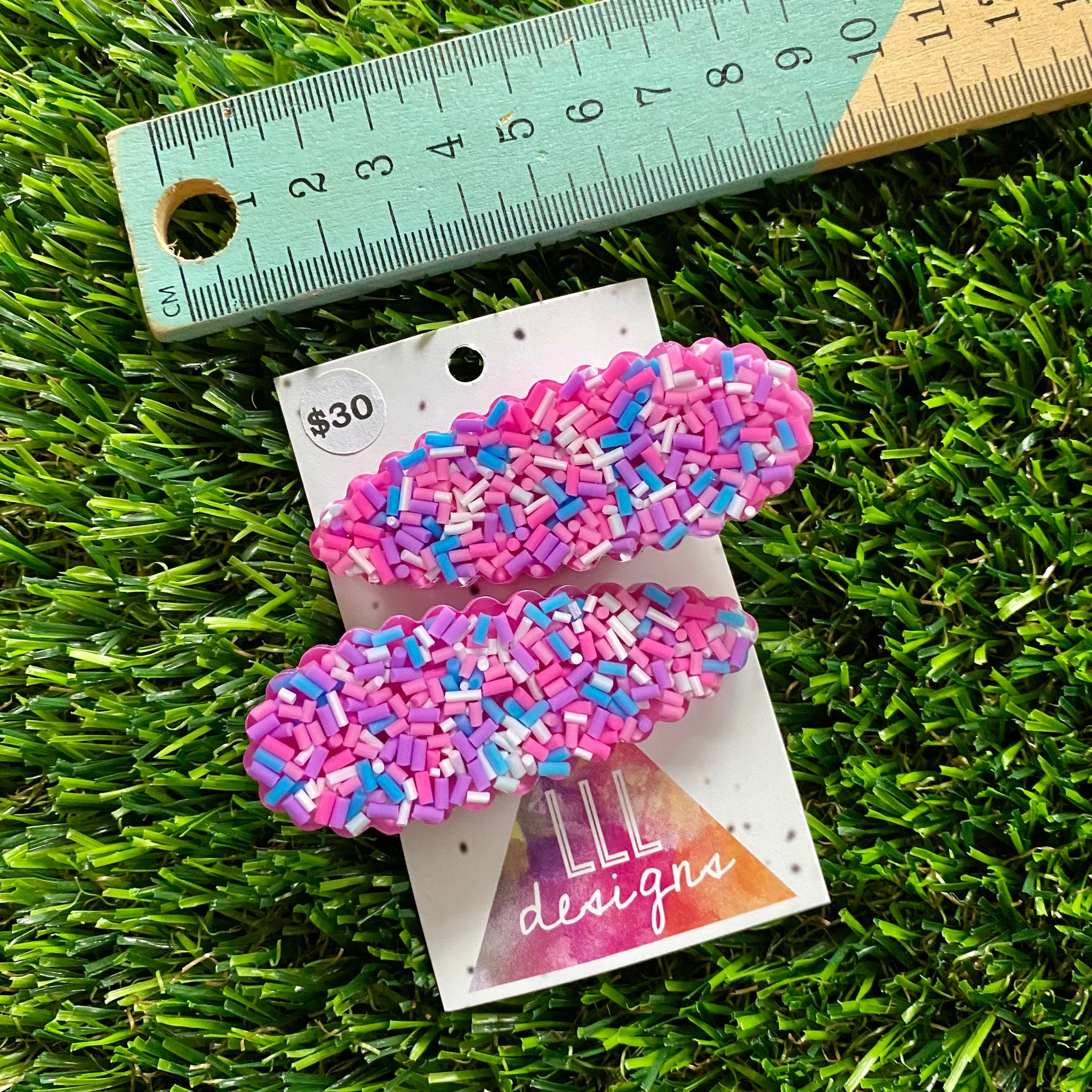 Scroll through photo's to see the size. These hand poured hair clips feature placed sprinkles, allowing for a one of a kind finish.