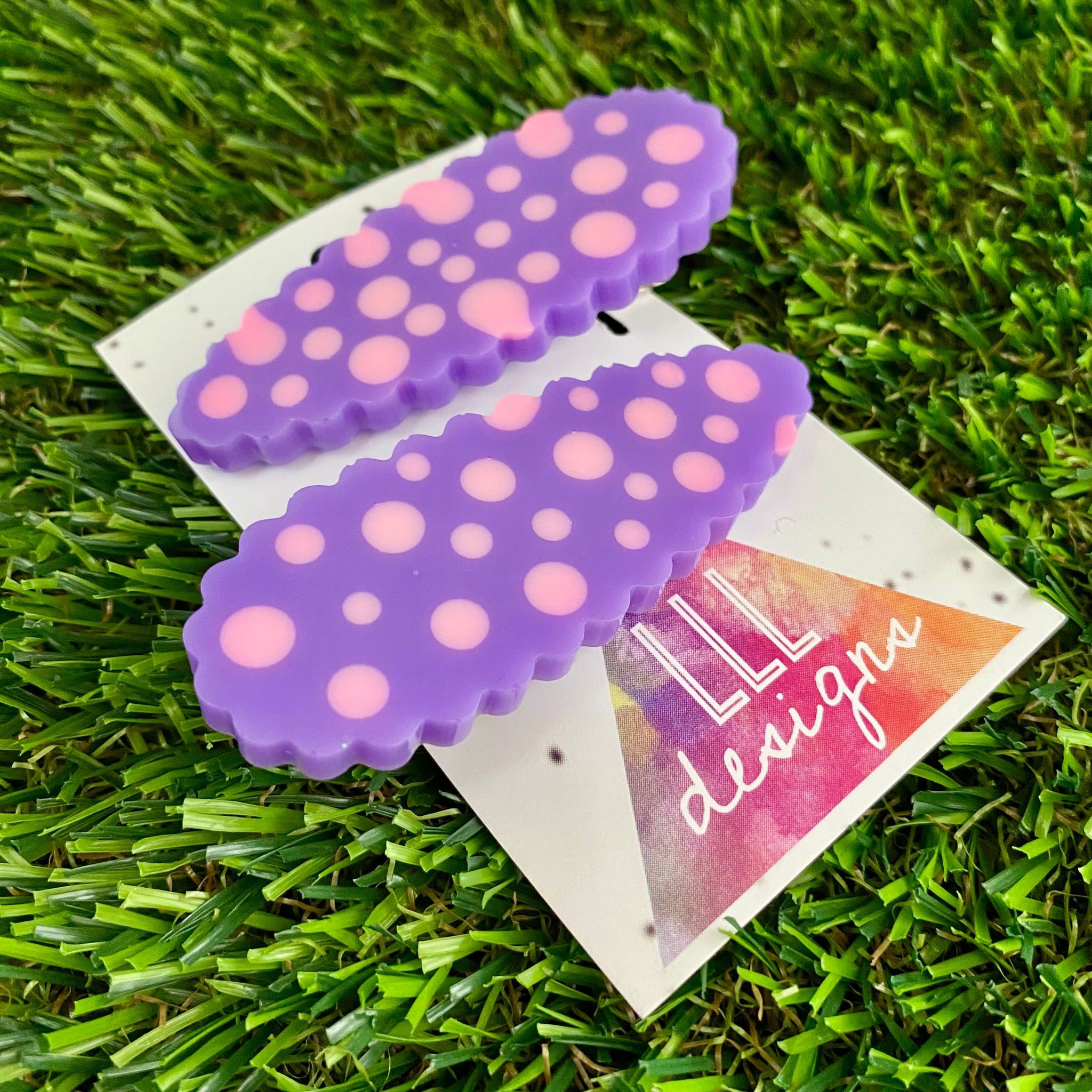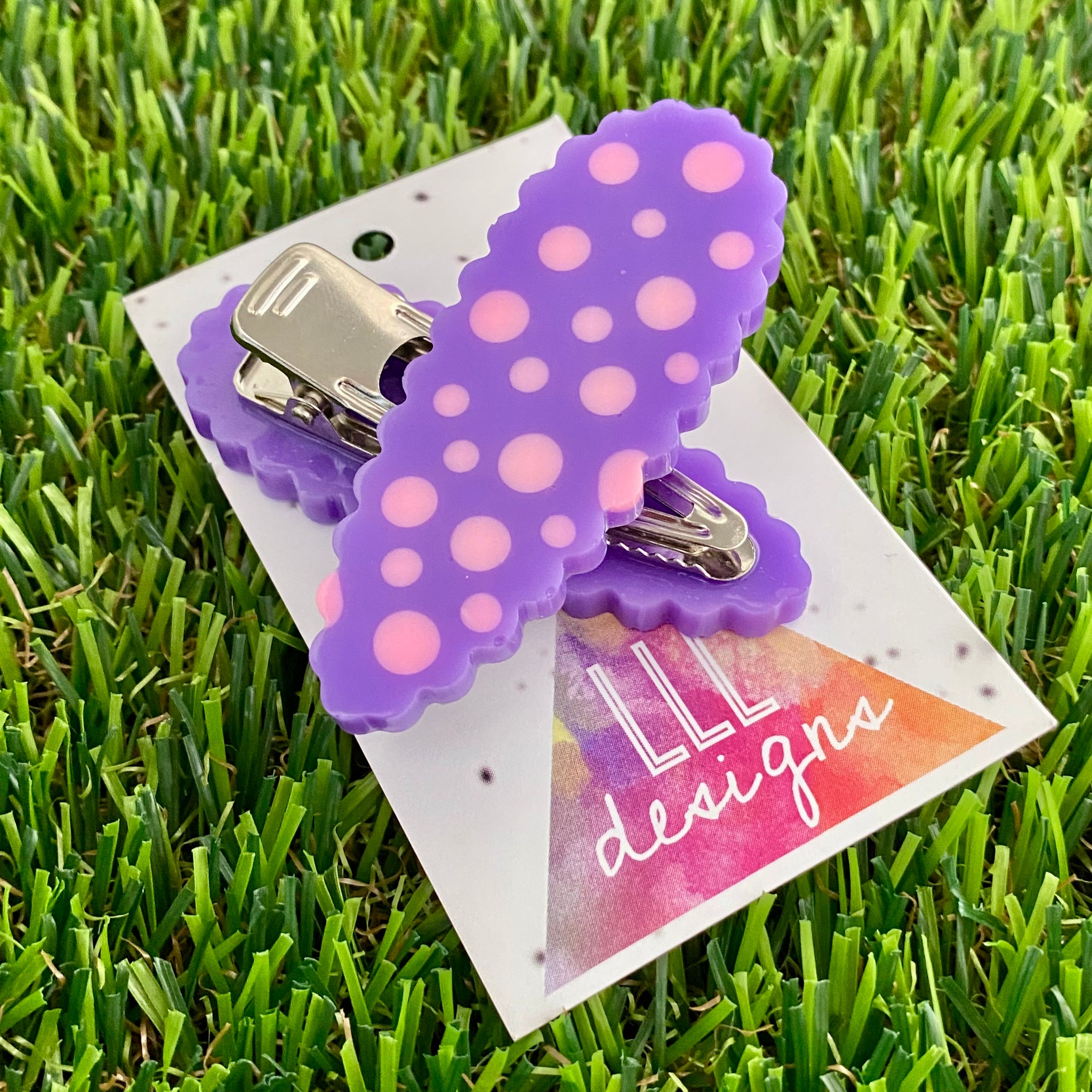 Handmade Resin Hair Clip - Purple Hair Clip Pair Featuring Pink Polka Dots and a Scalloped Edge!