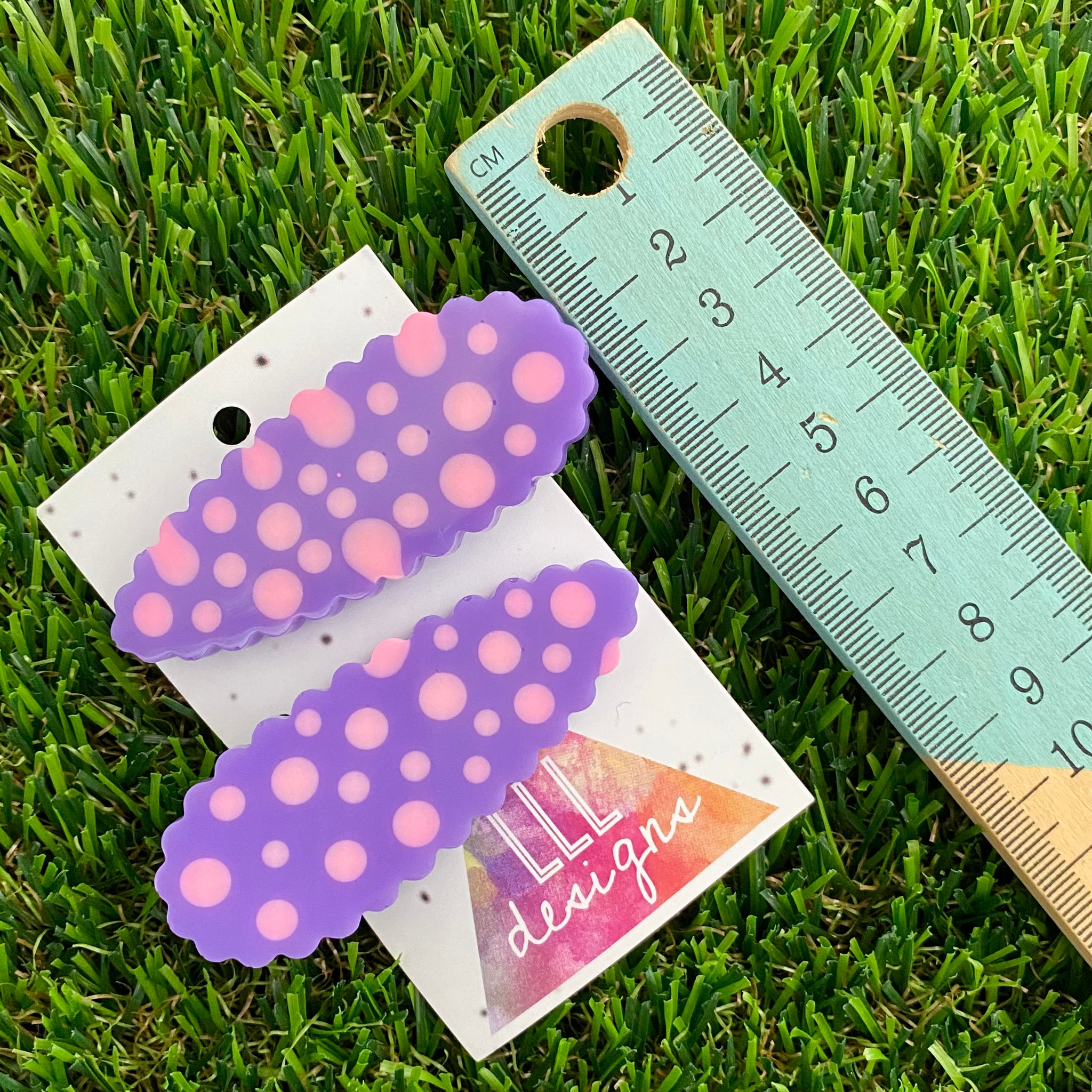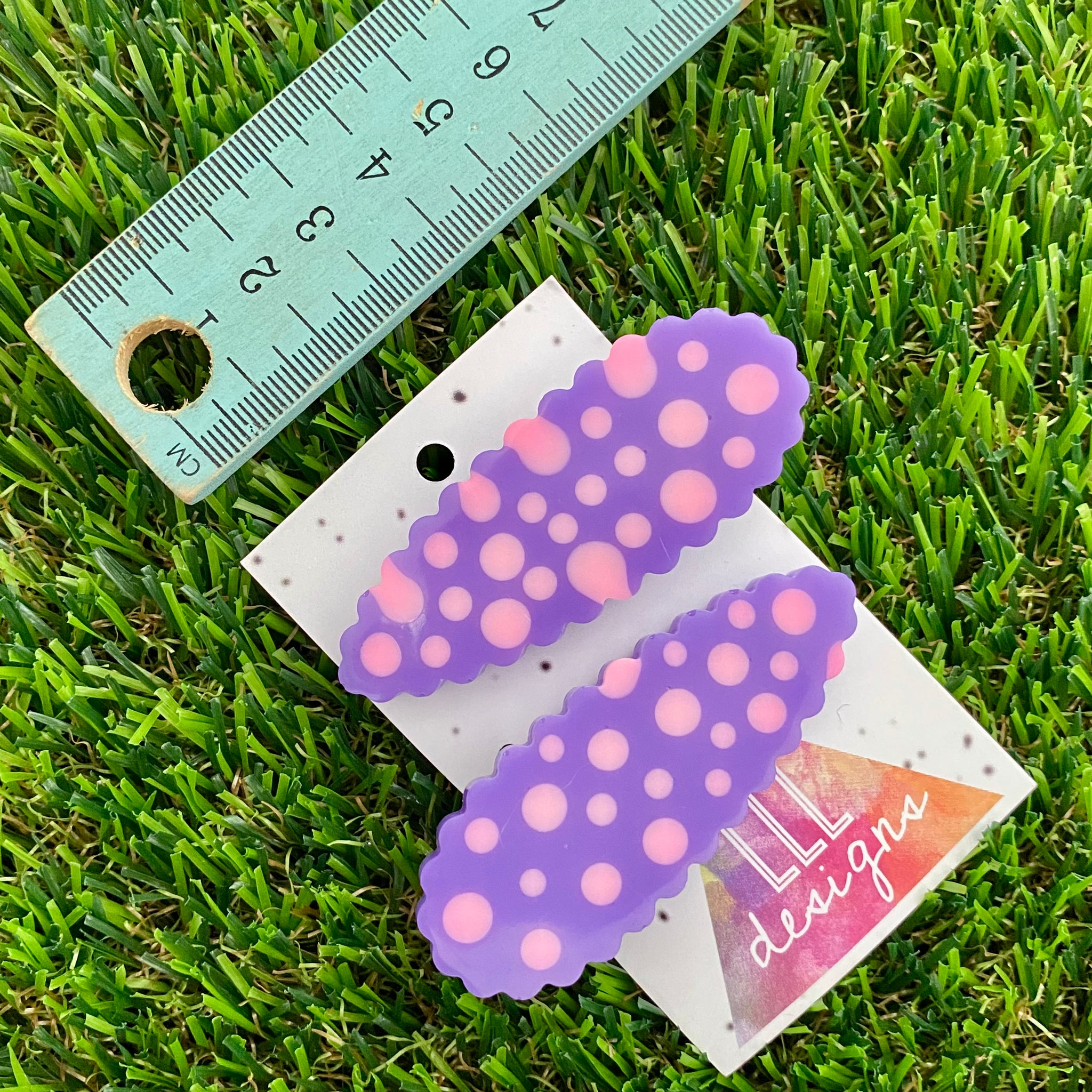 Scroll through photo's to see the size. These hand poured hair clips feature placed resin dots, allowing for a one of a kind finish.