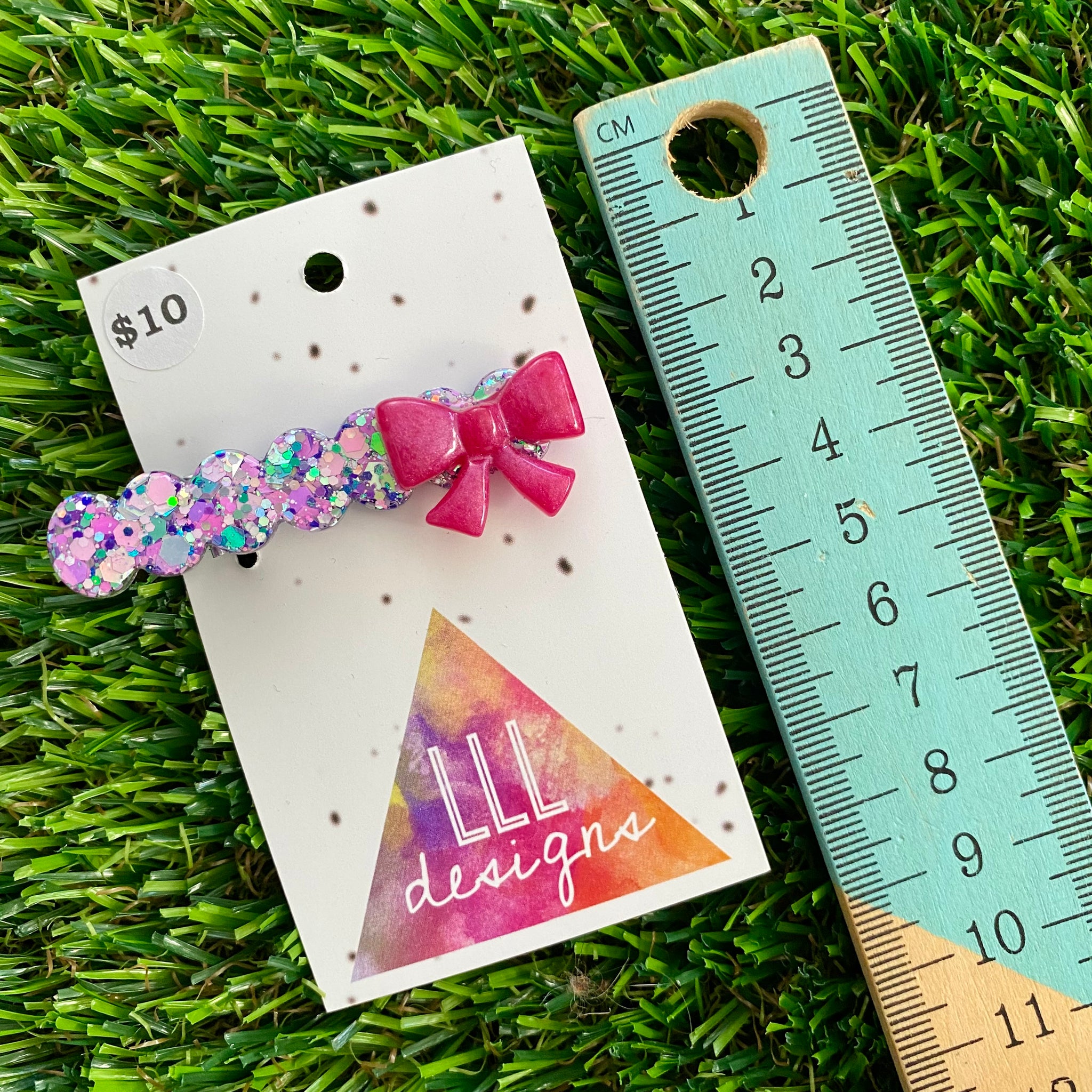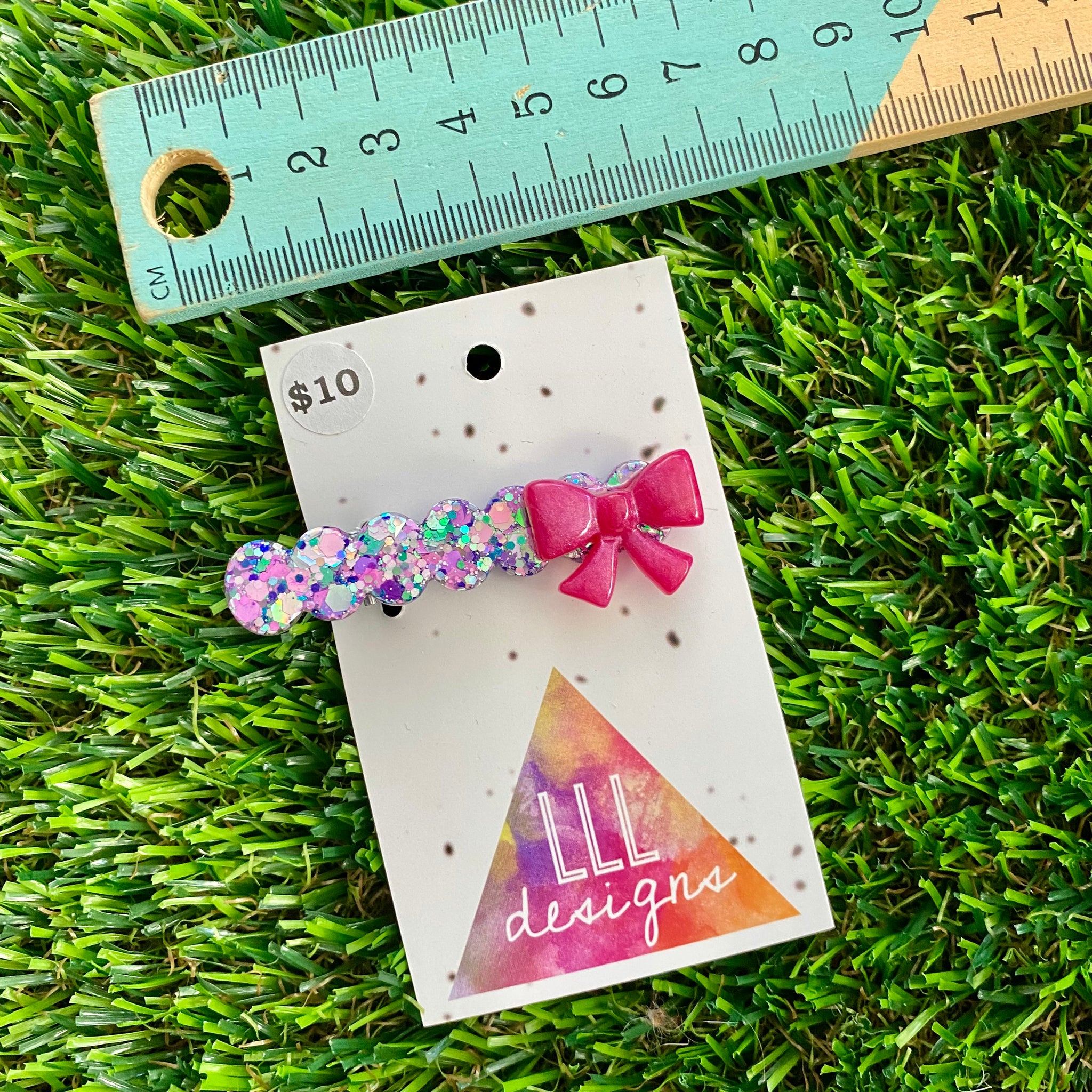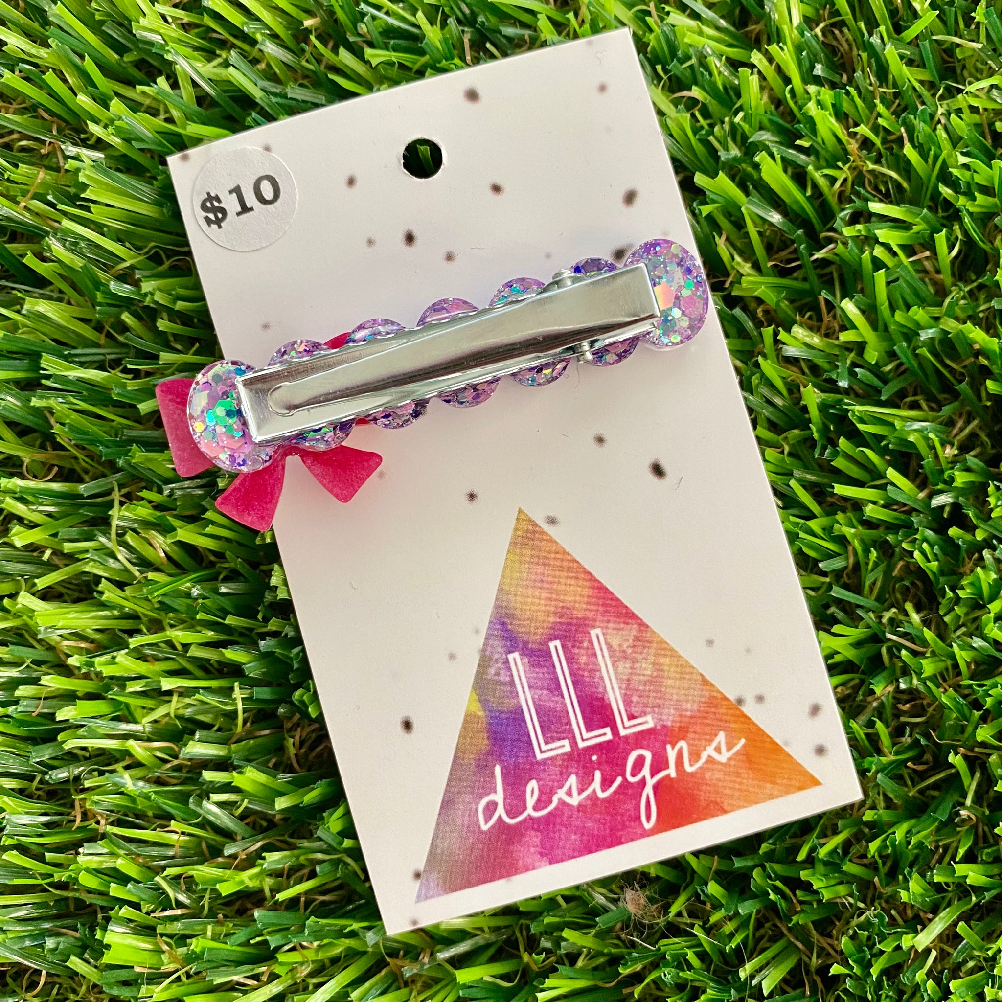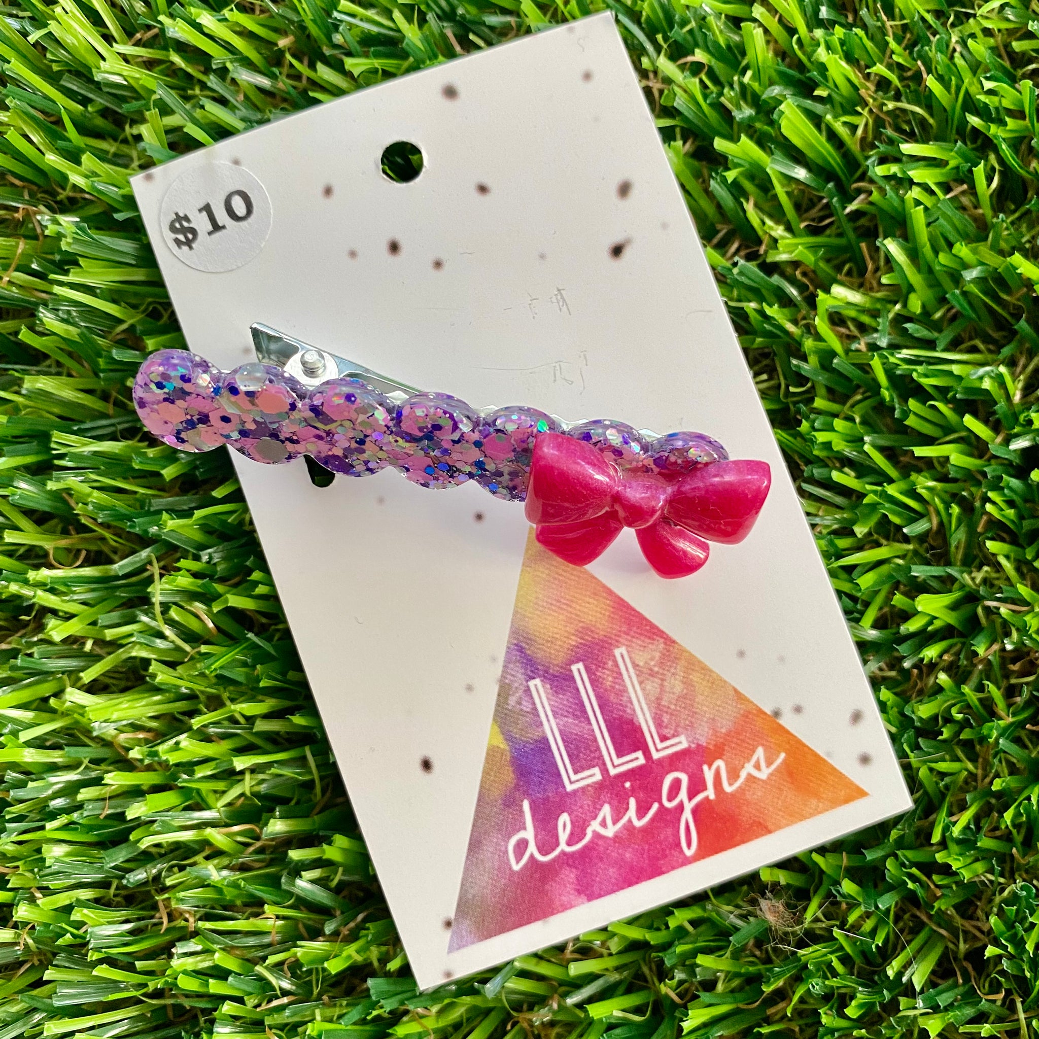 Handmade Resin Hair Clip - Purple Multi Confetti Bubble Bar Hair Clip Featuring a Pink Bow!