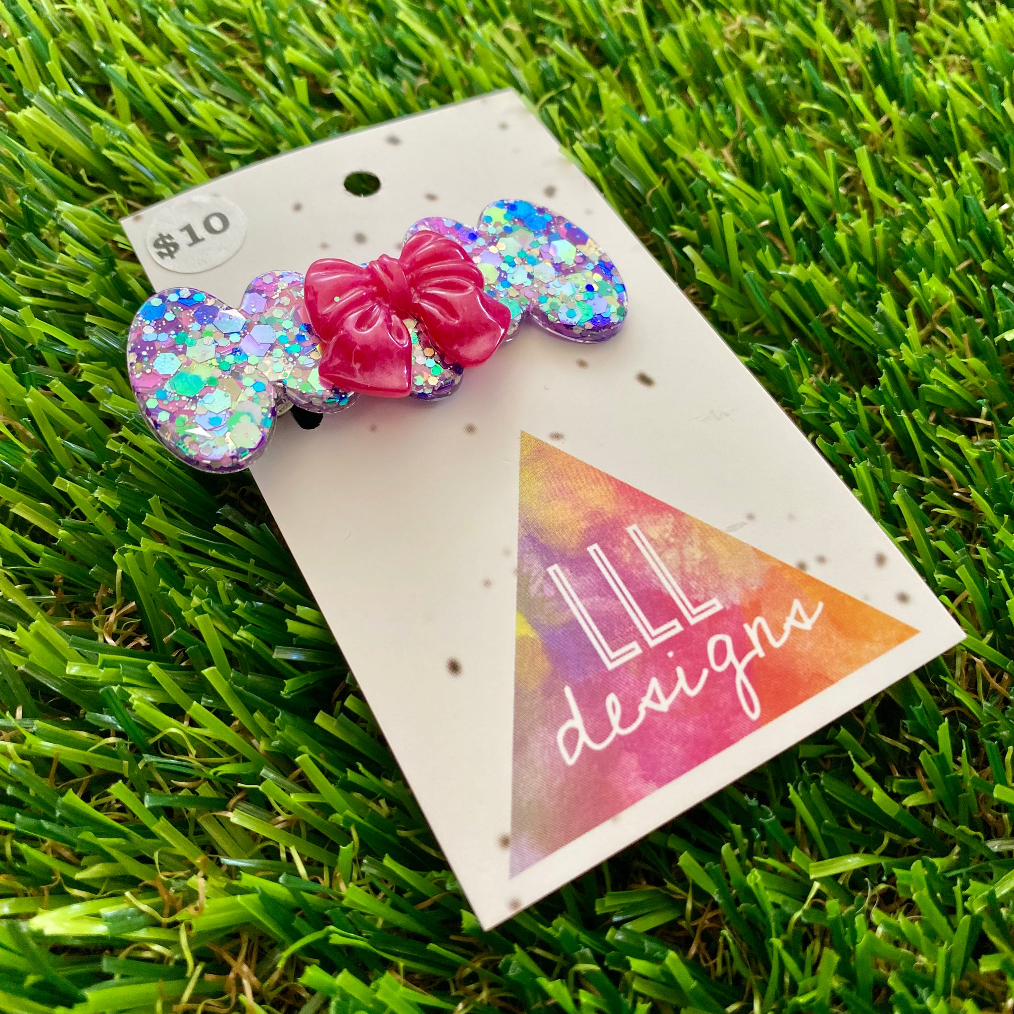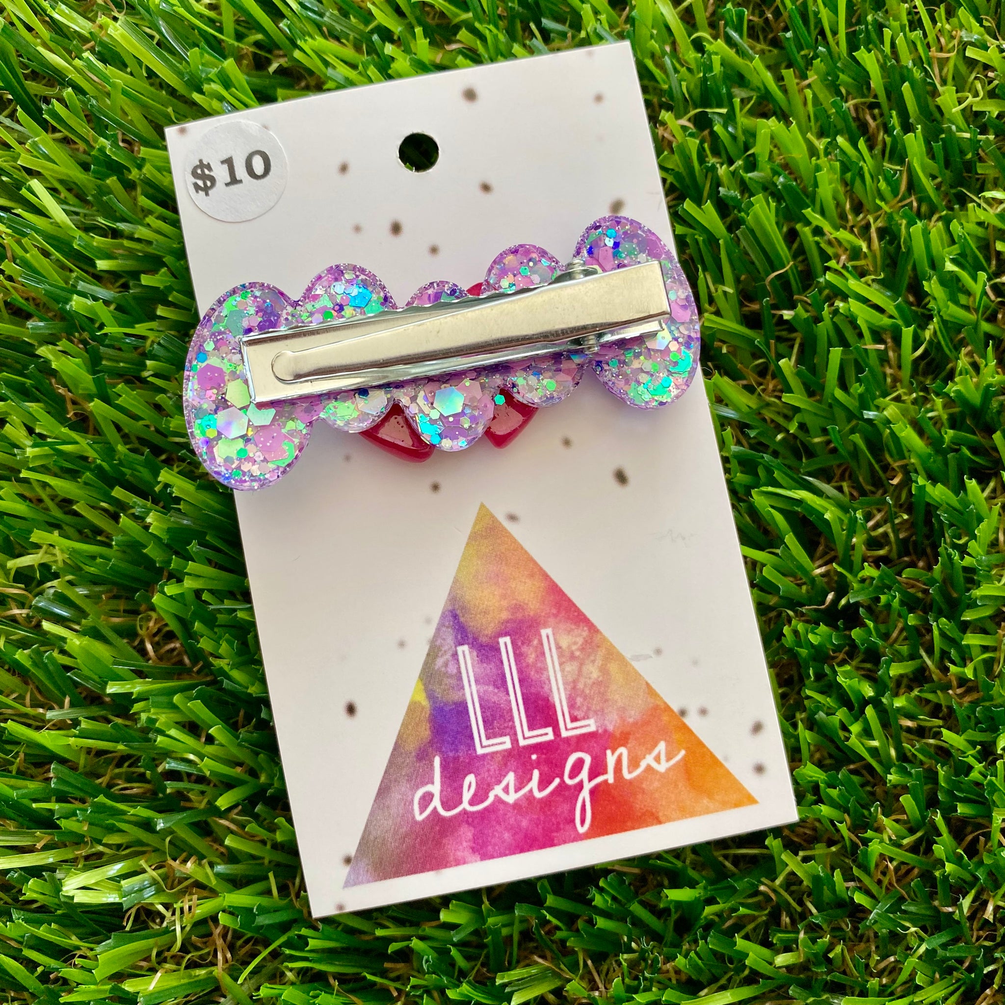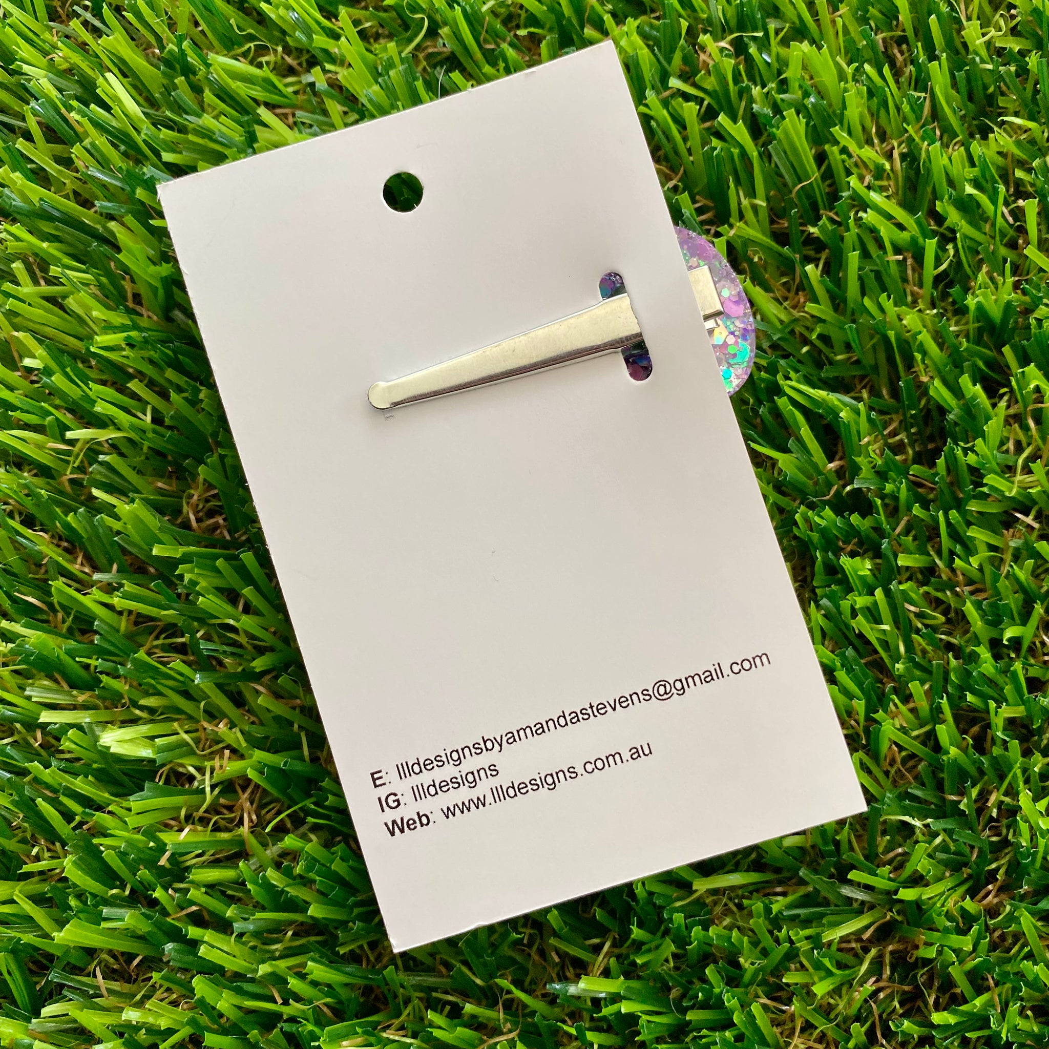 Scroll through photo's to see the size. This hair clip is created by hand poured resin and features a sparkly finish.