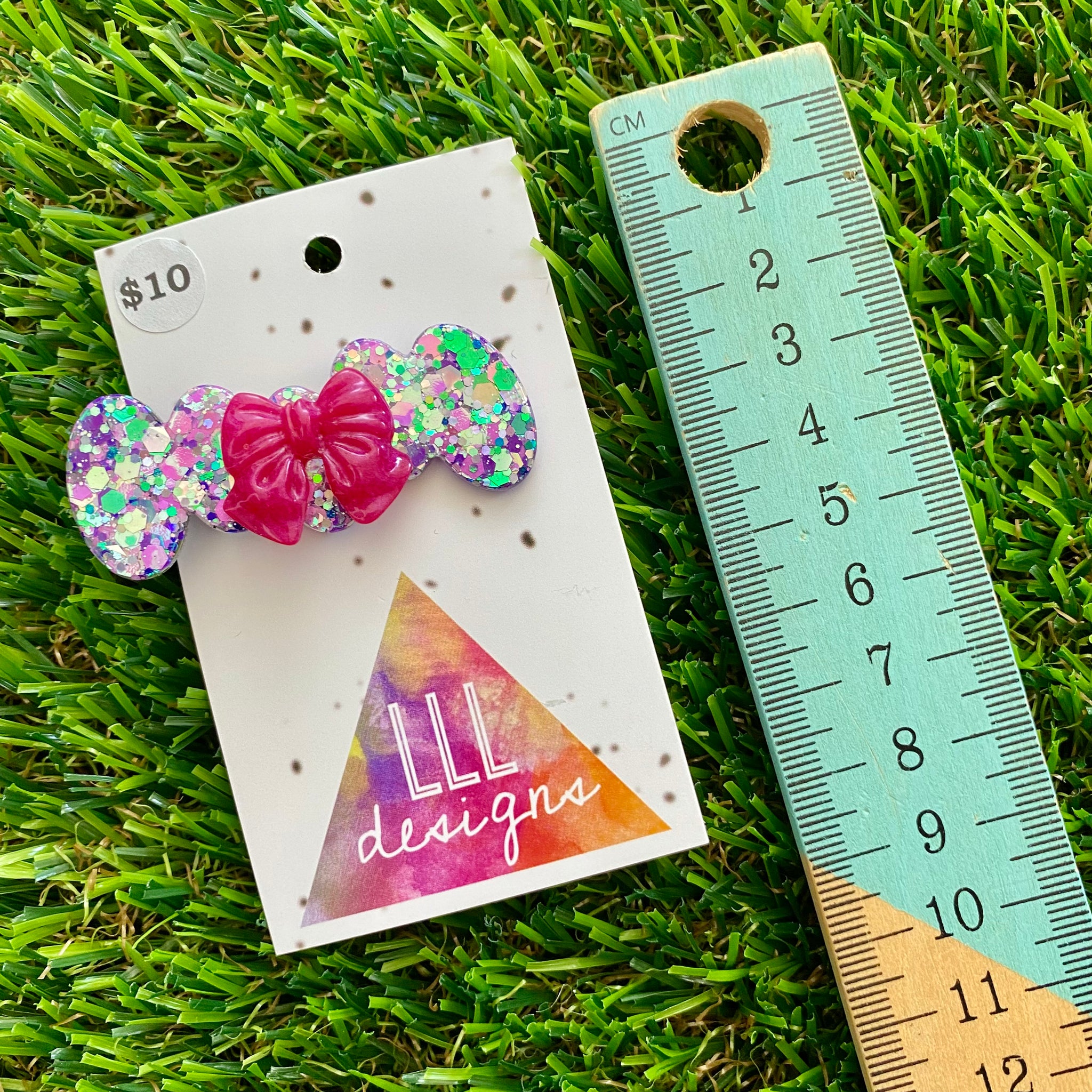 Handmade Resin Hair Clip - Purple Multi Confetti Bubbles and Bows Hair Clip Featuring a Pink Bow!
