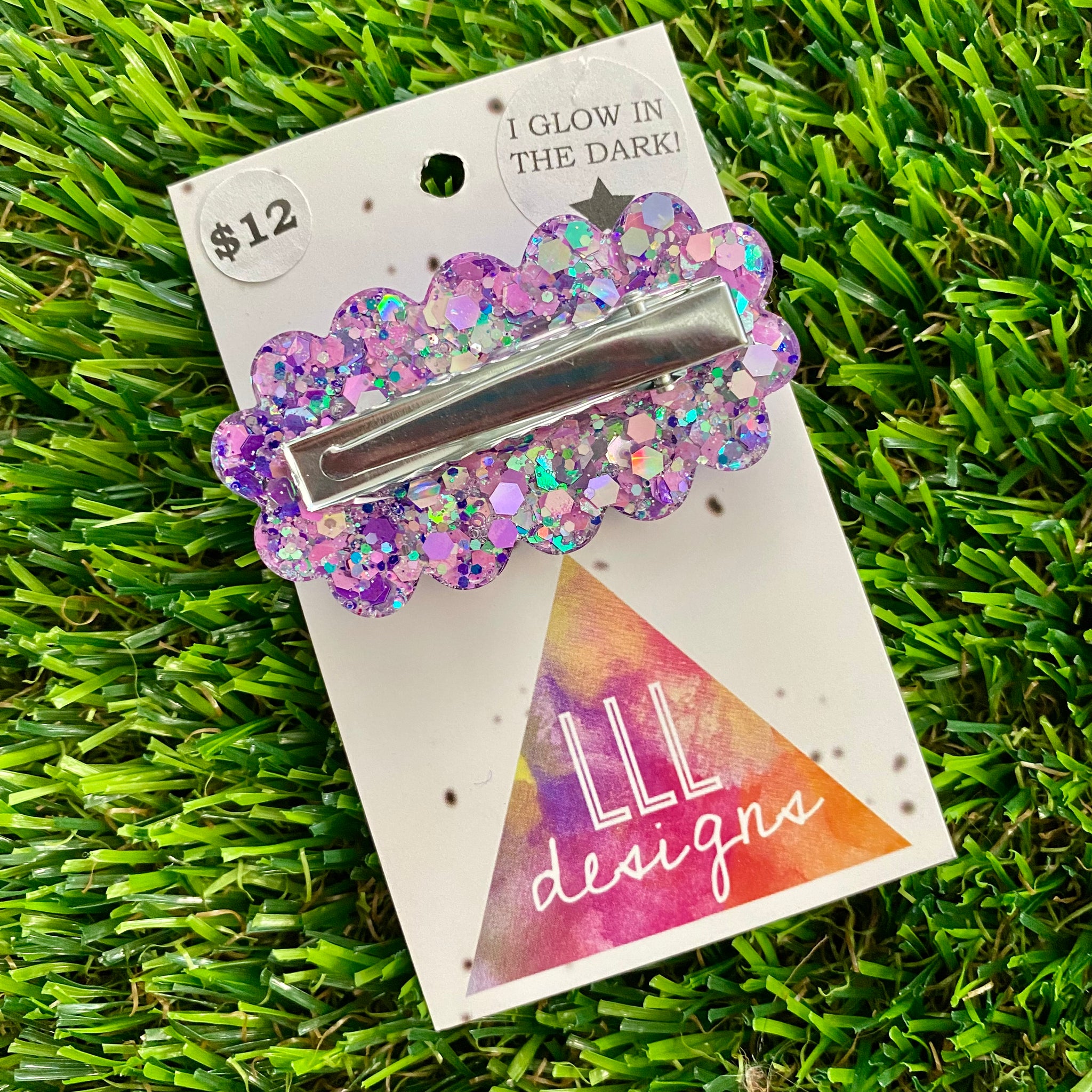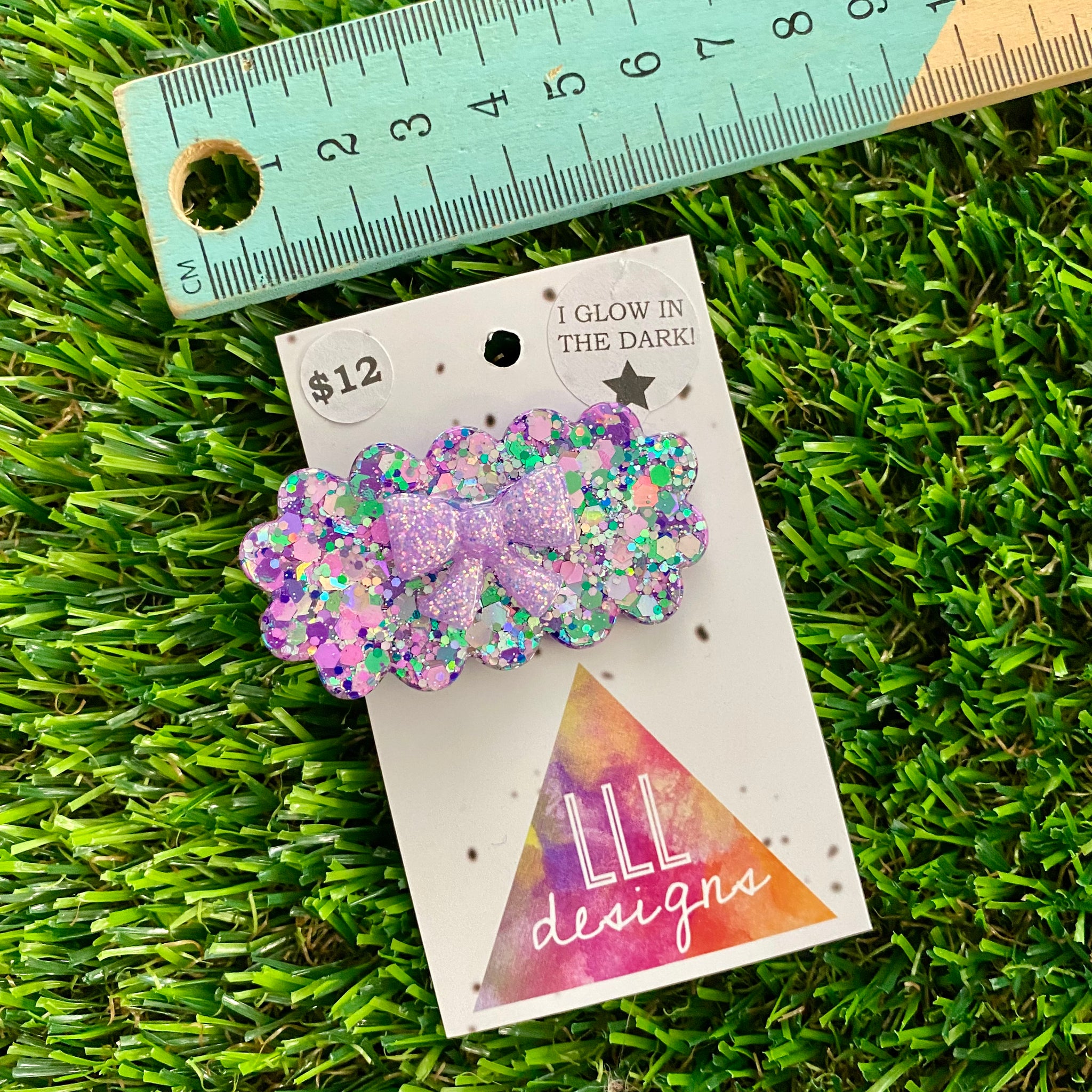 Handmade Resin Hair Clip - Purple Multi Confetti Puffy Cloud Hair Clip Featuring a Lavender Glow In Dark Bow!