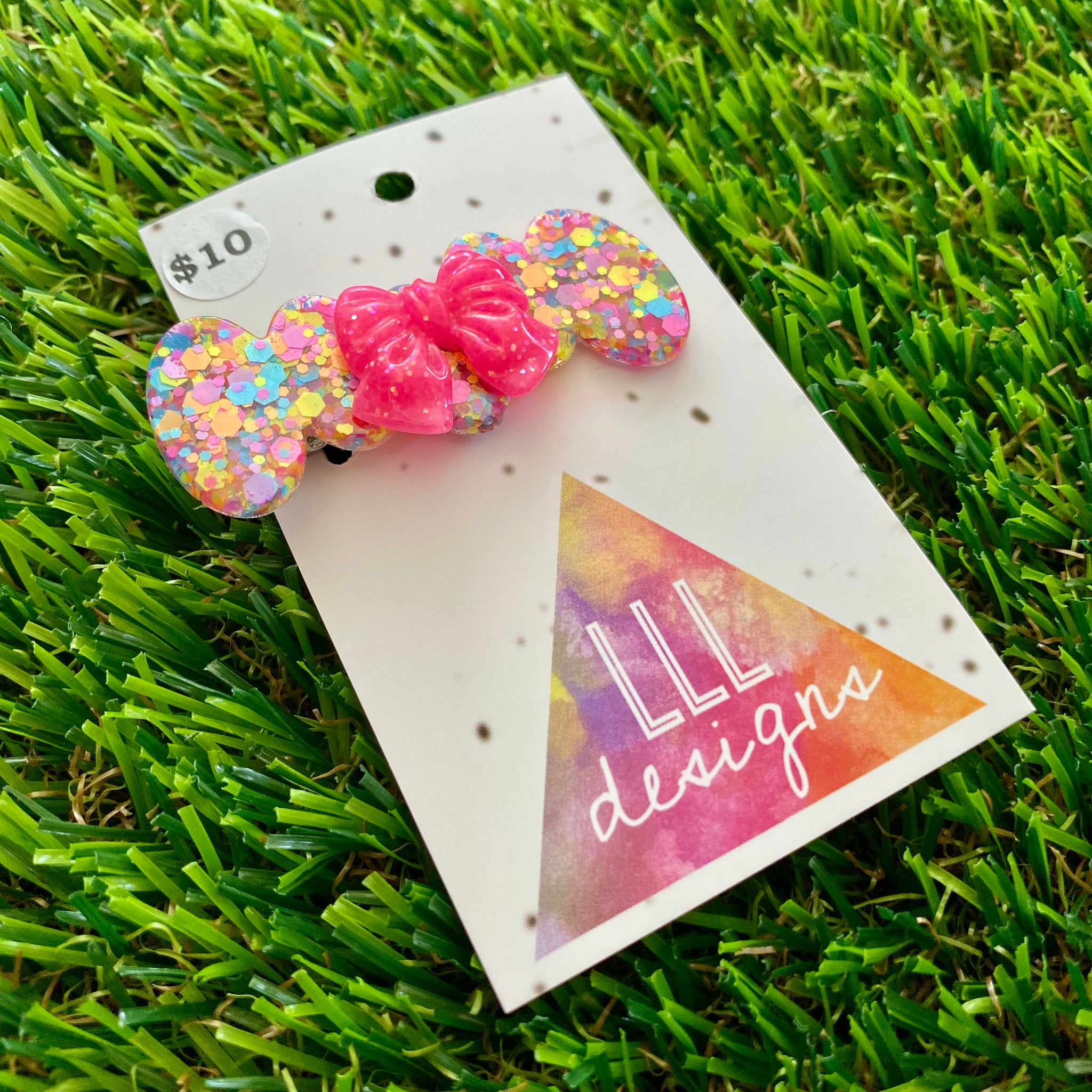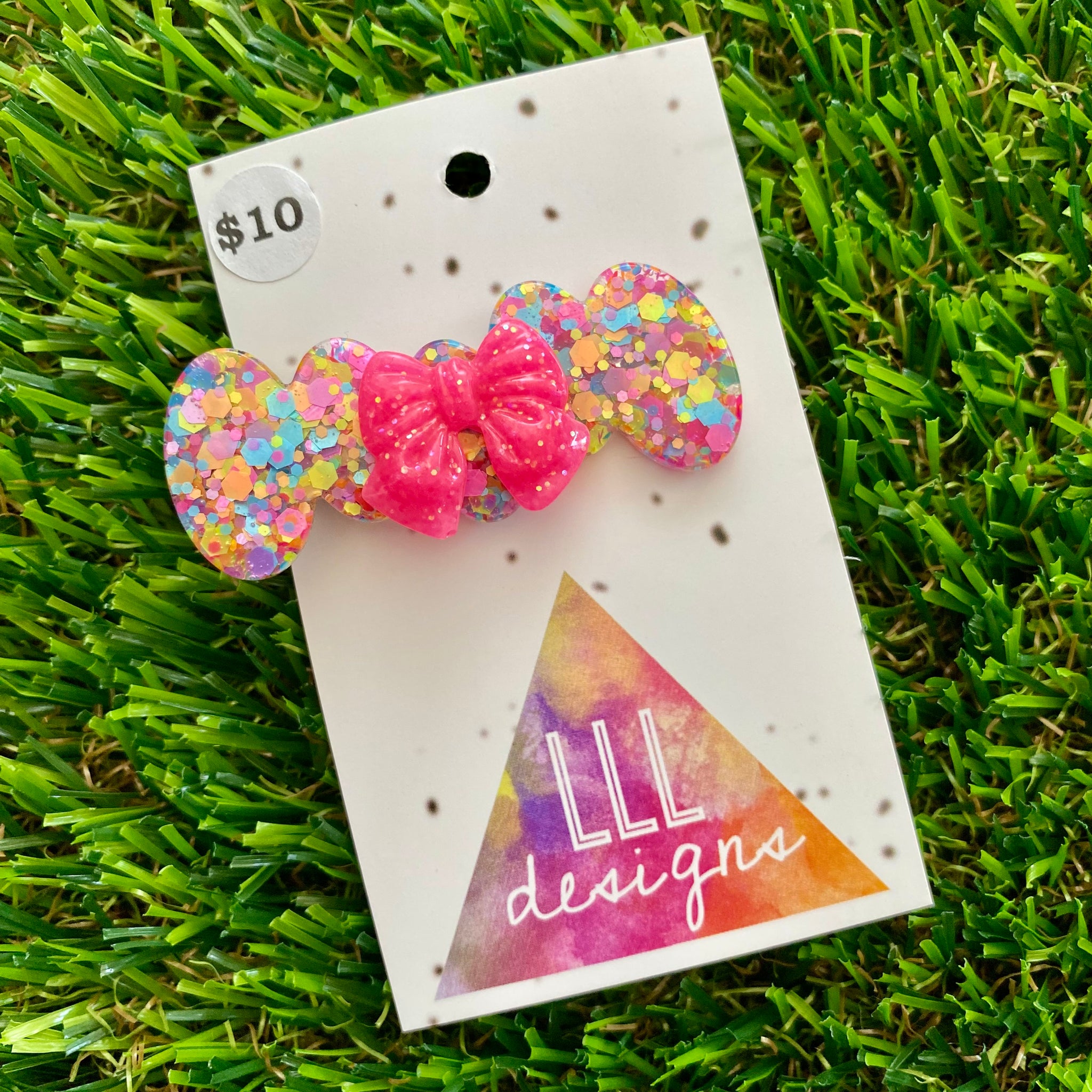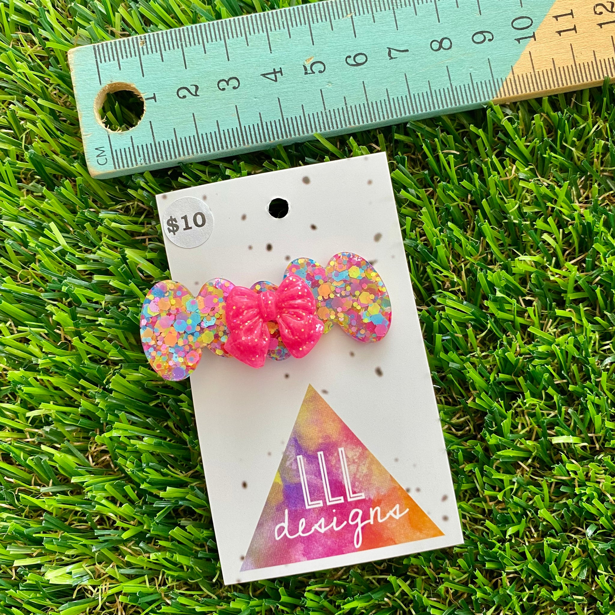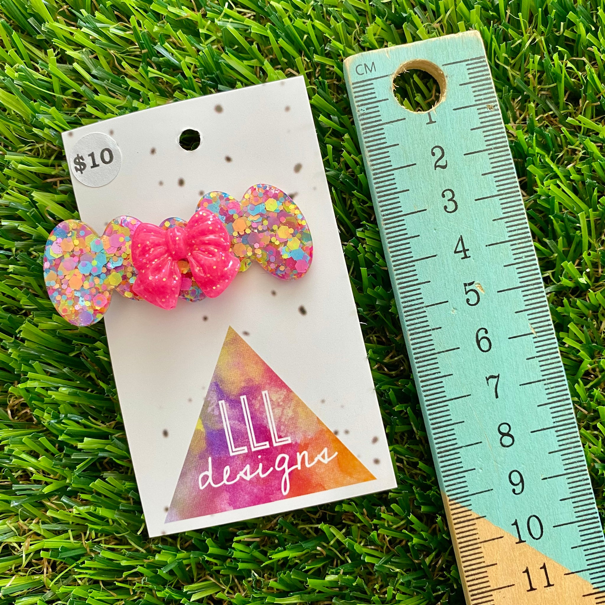 Handmade Resin Hair Clip - Rainbow Confetti Bubbles and Bows Hair Clip Featuring a Neon Glitter Pink Bow!