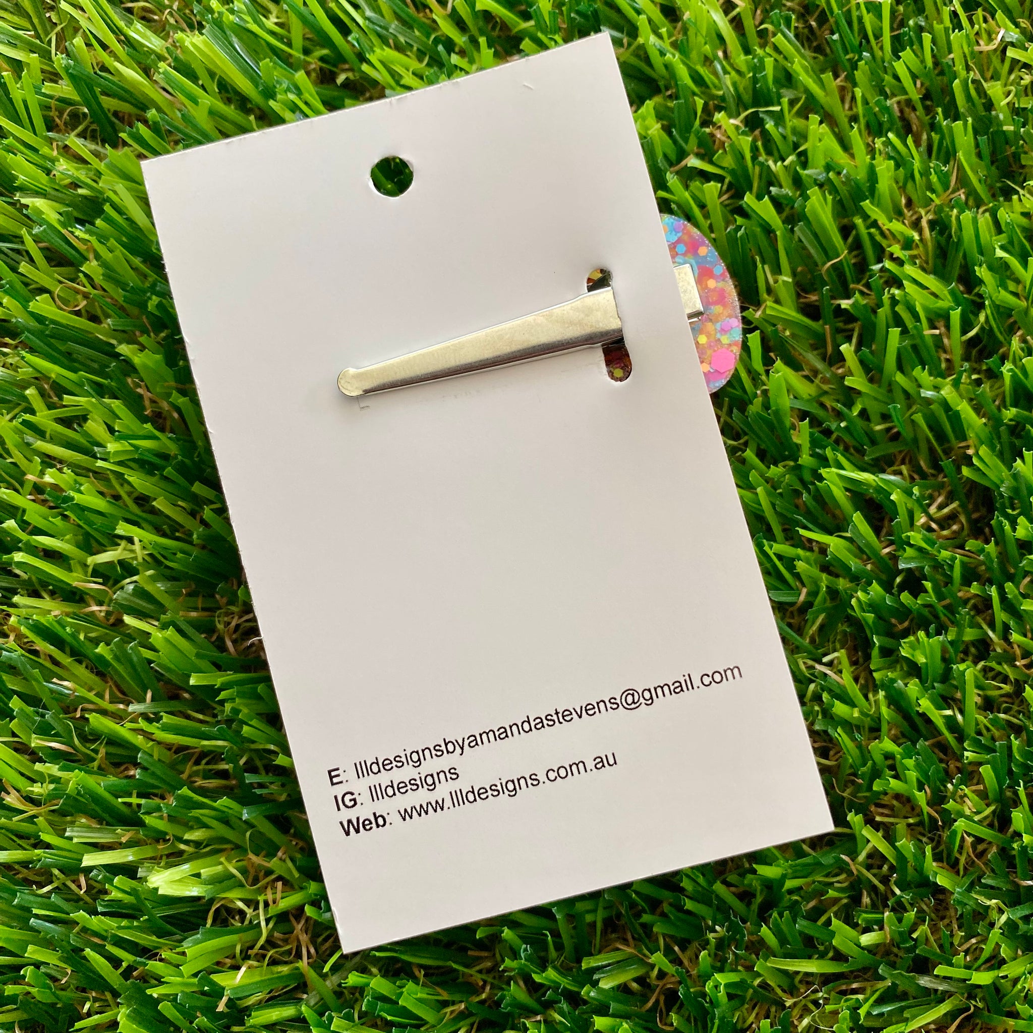Scroll through photo's to see the size. This hair clip is created by hand poured resin and features a sparkly finish.