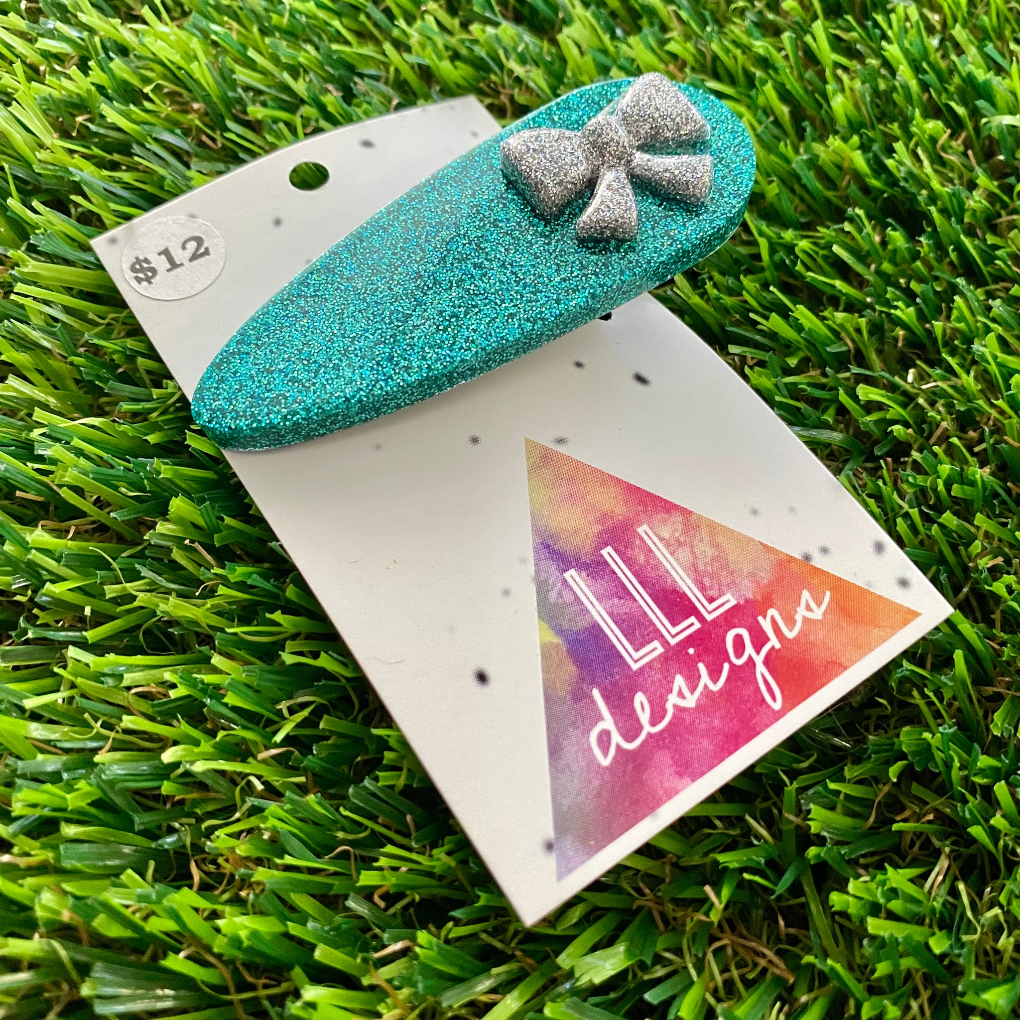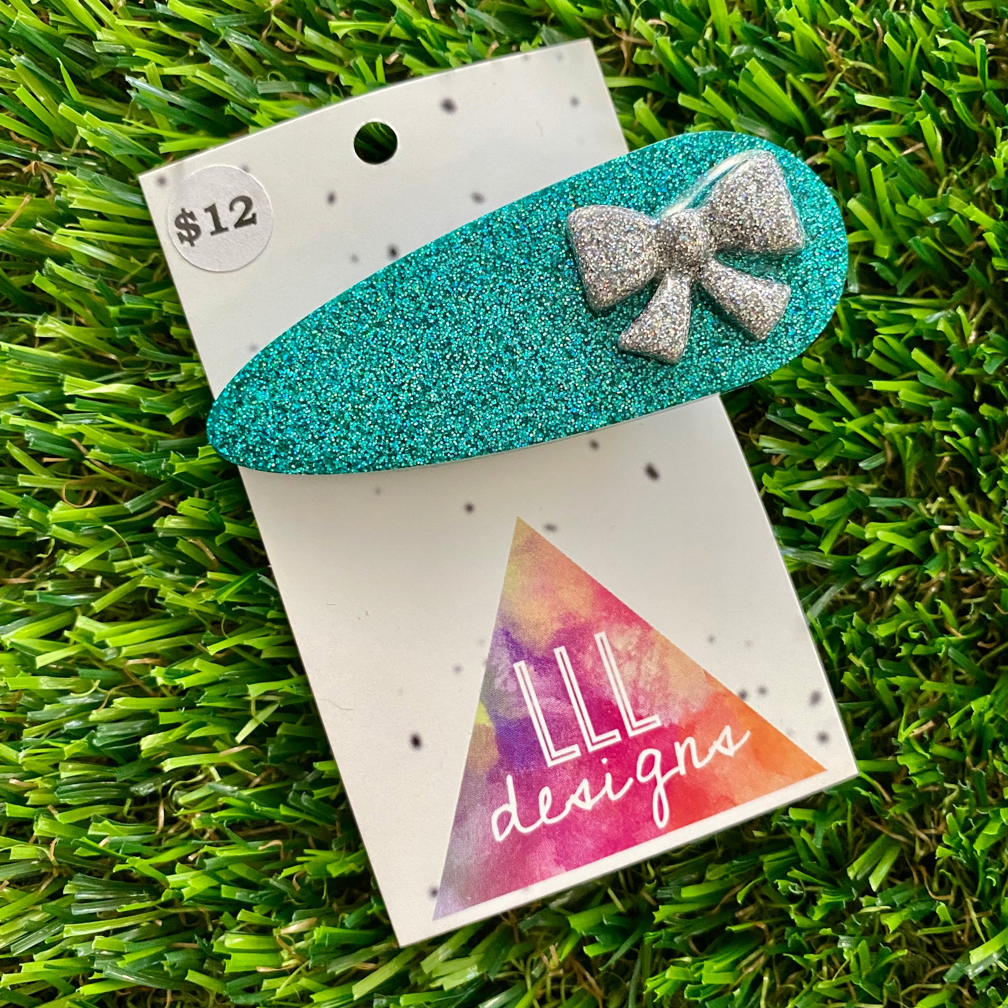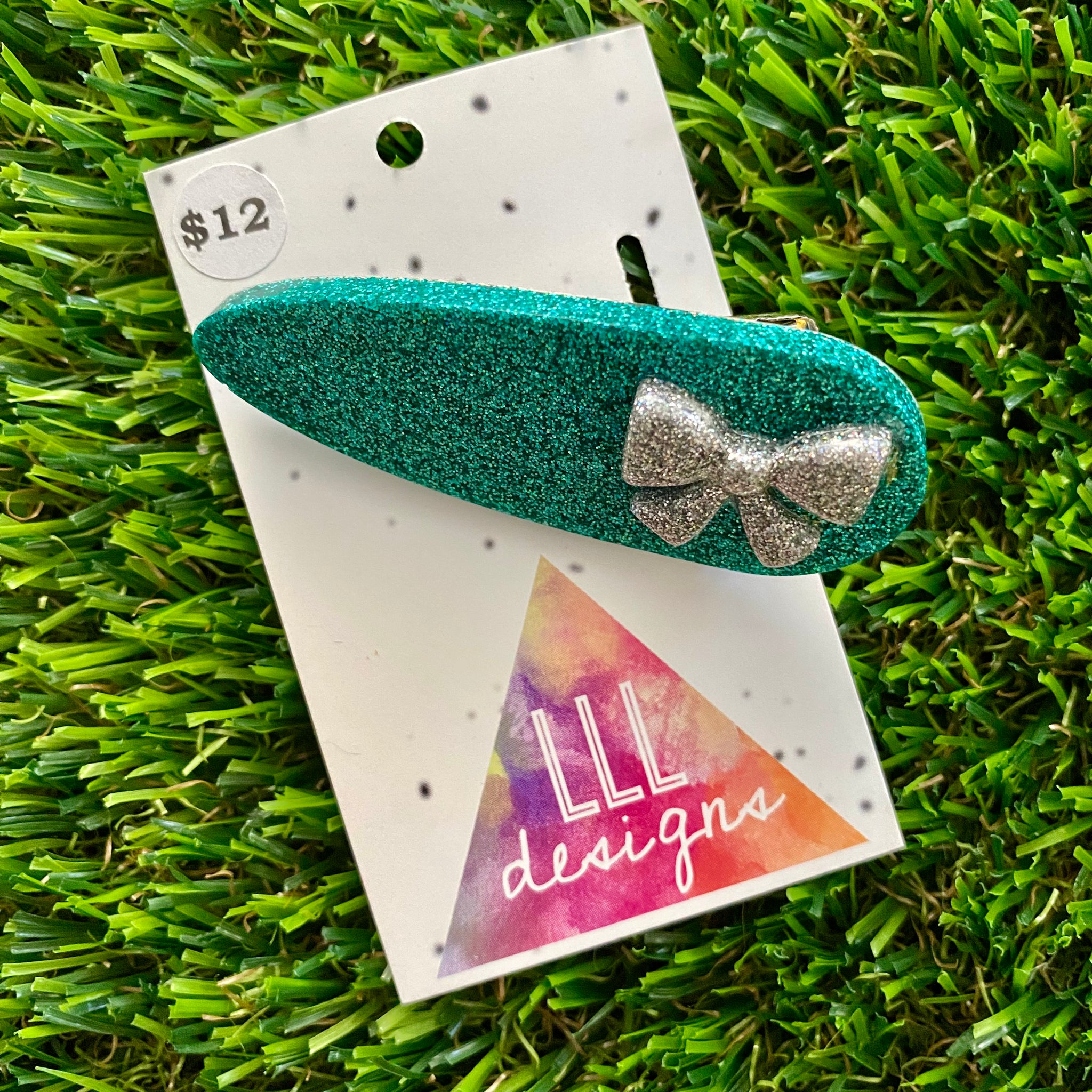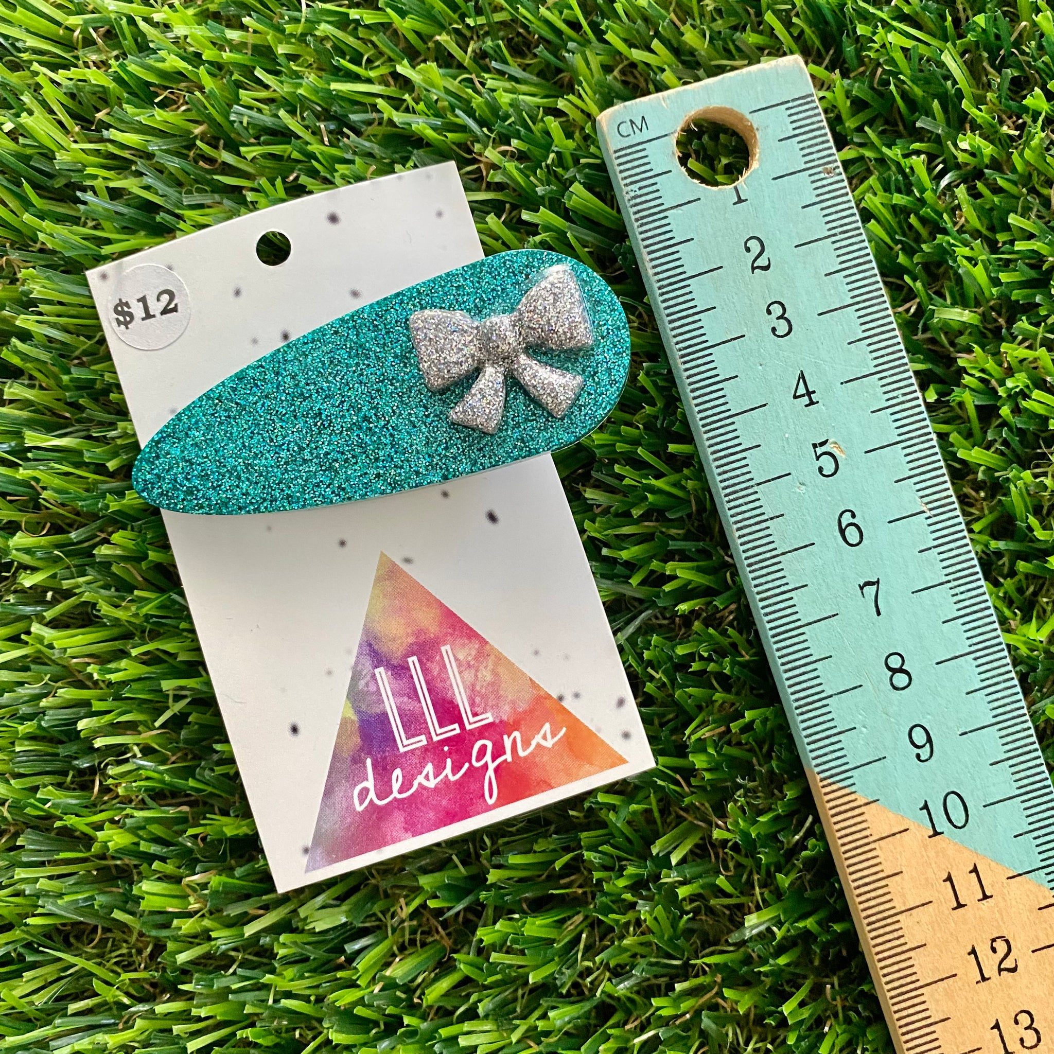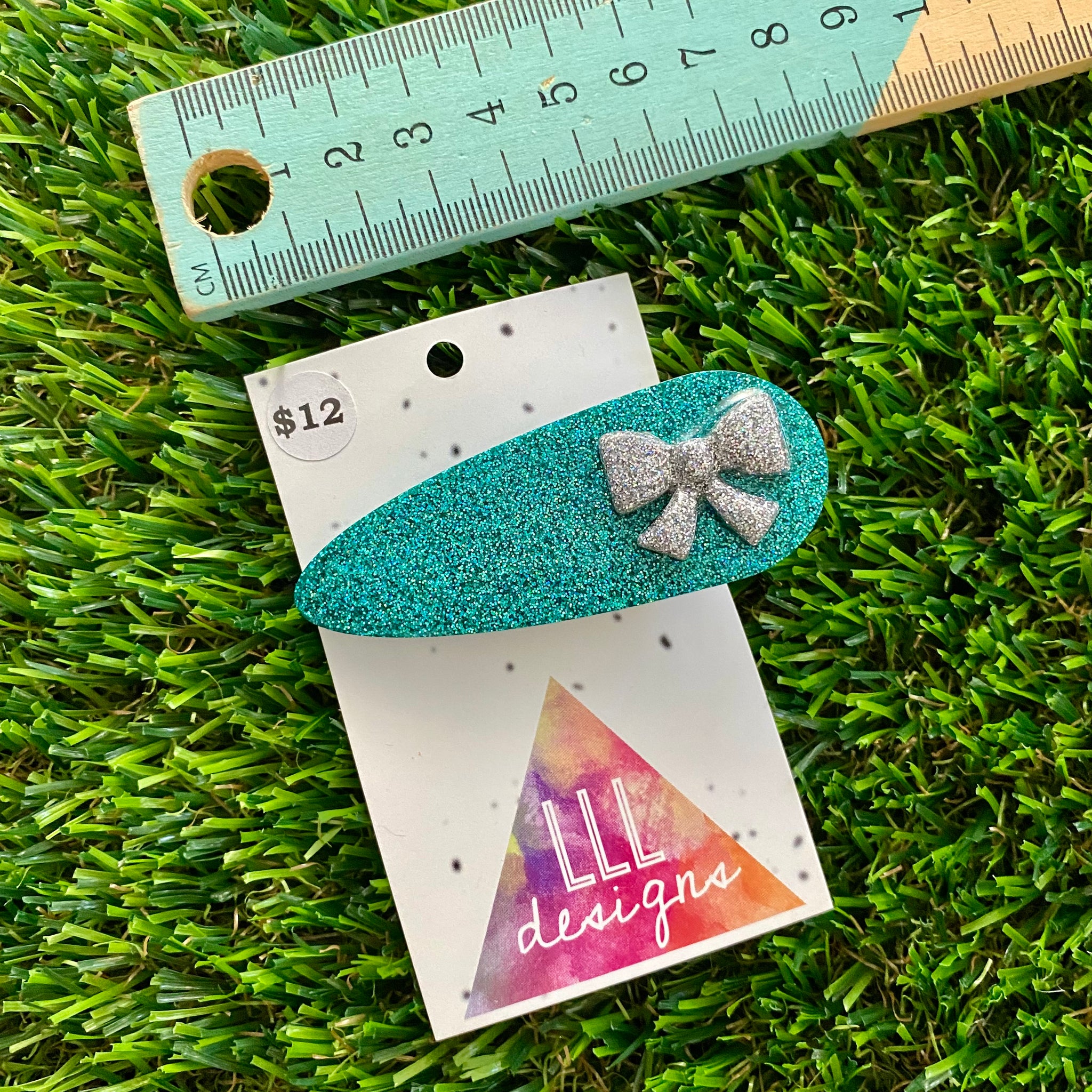 Handmade Resin Hair Clip - Teal Glitter Hair Clip Featuring a Glitter Silver Bow!