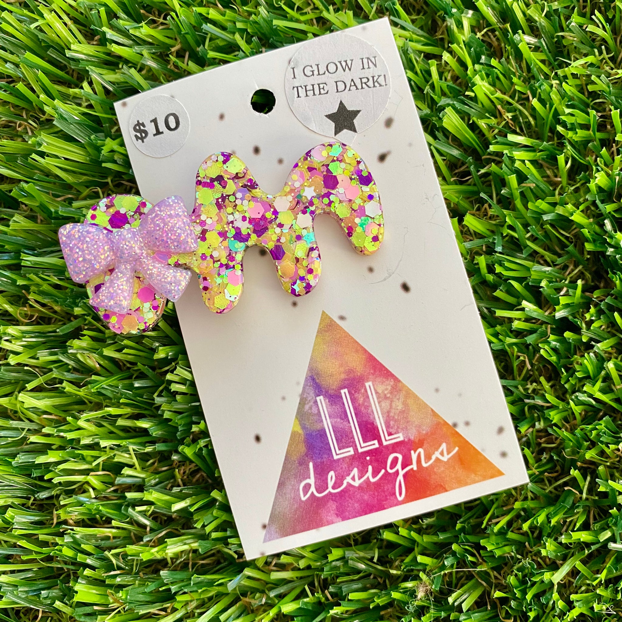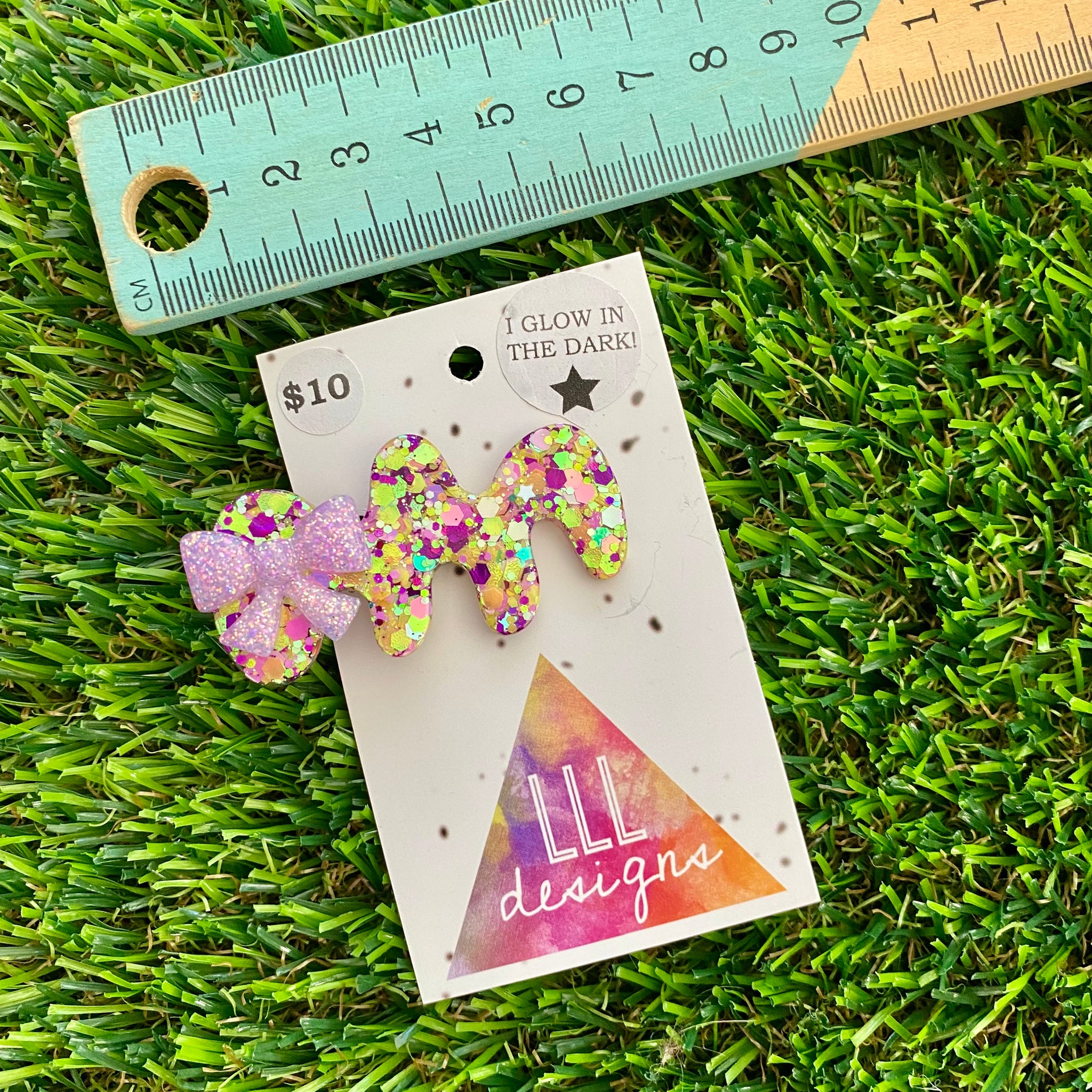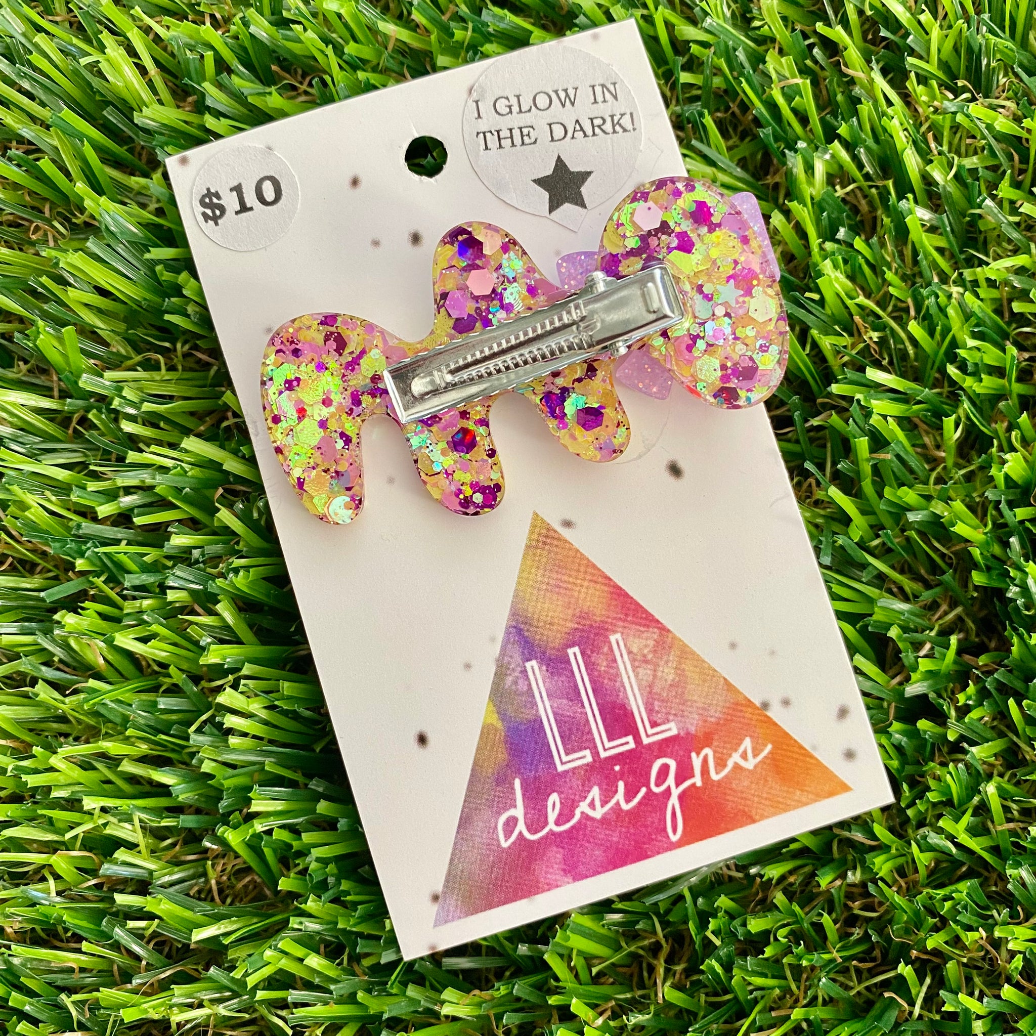 Handmade Resin Hair Clip - Yellow, Pink, Violet Glitter Puddle Hair Clip Featuring Lavender Glow In Dark Bow!