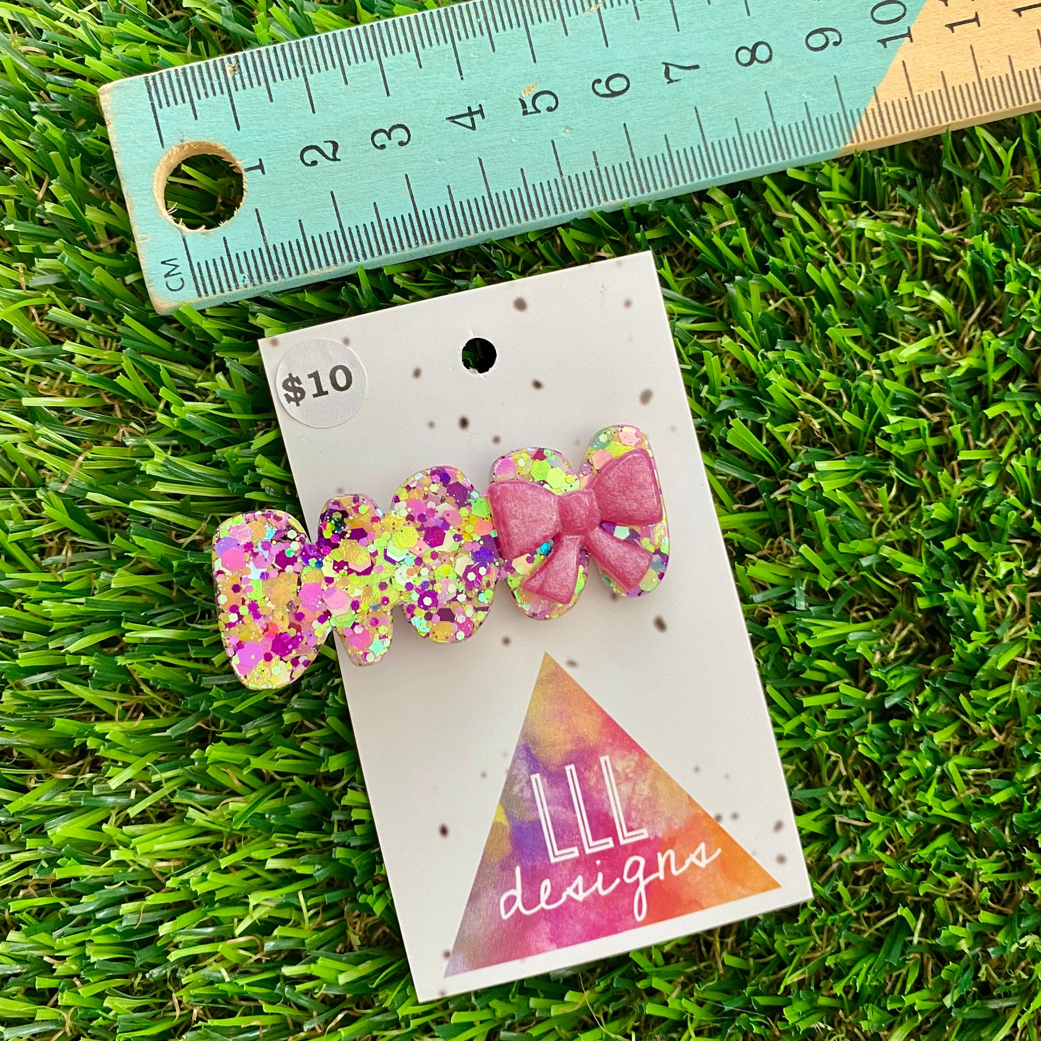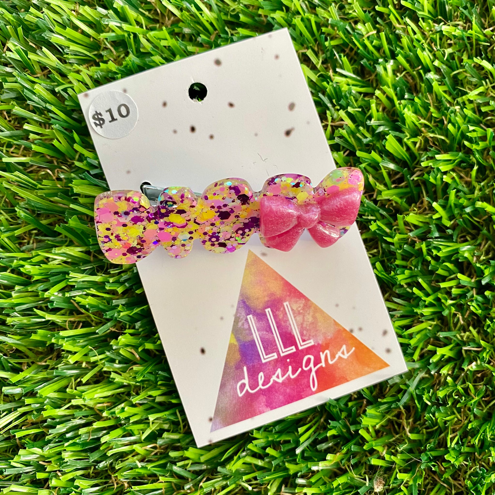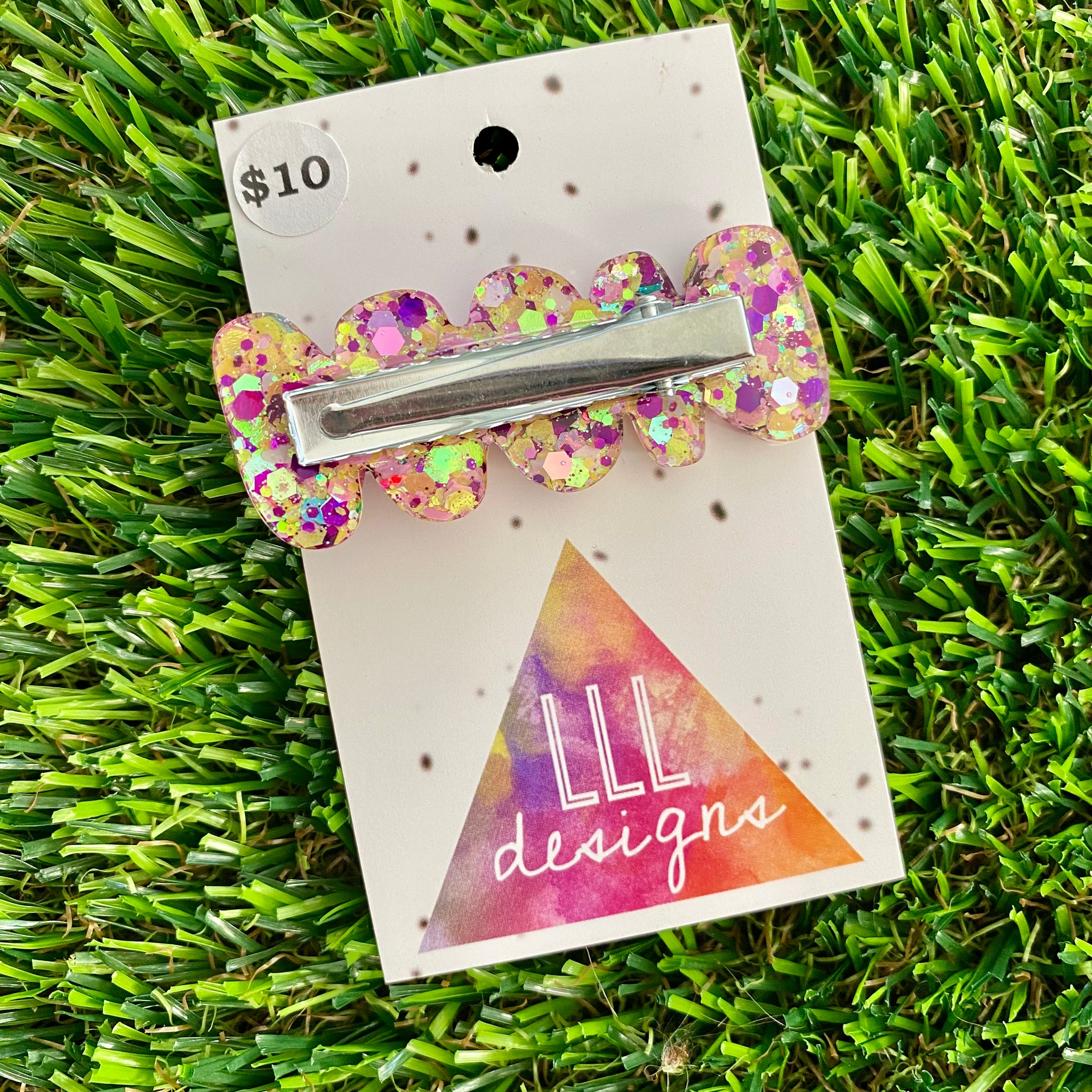 Handmade Resin Hair Clip - Yellow, Pink, Violet Glitter Squiggle Hair Clip Featuring a Pink Bow!
