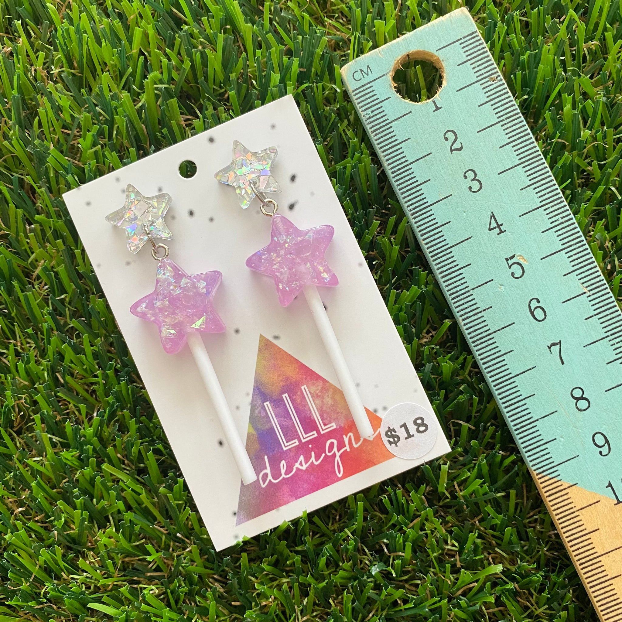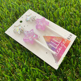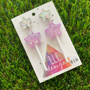 Lavender Iridescent Glitter Star Lollipop Dangle Earrings Featuring Silver Star Top!