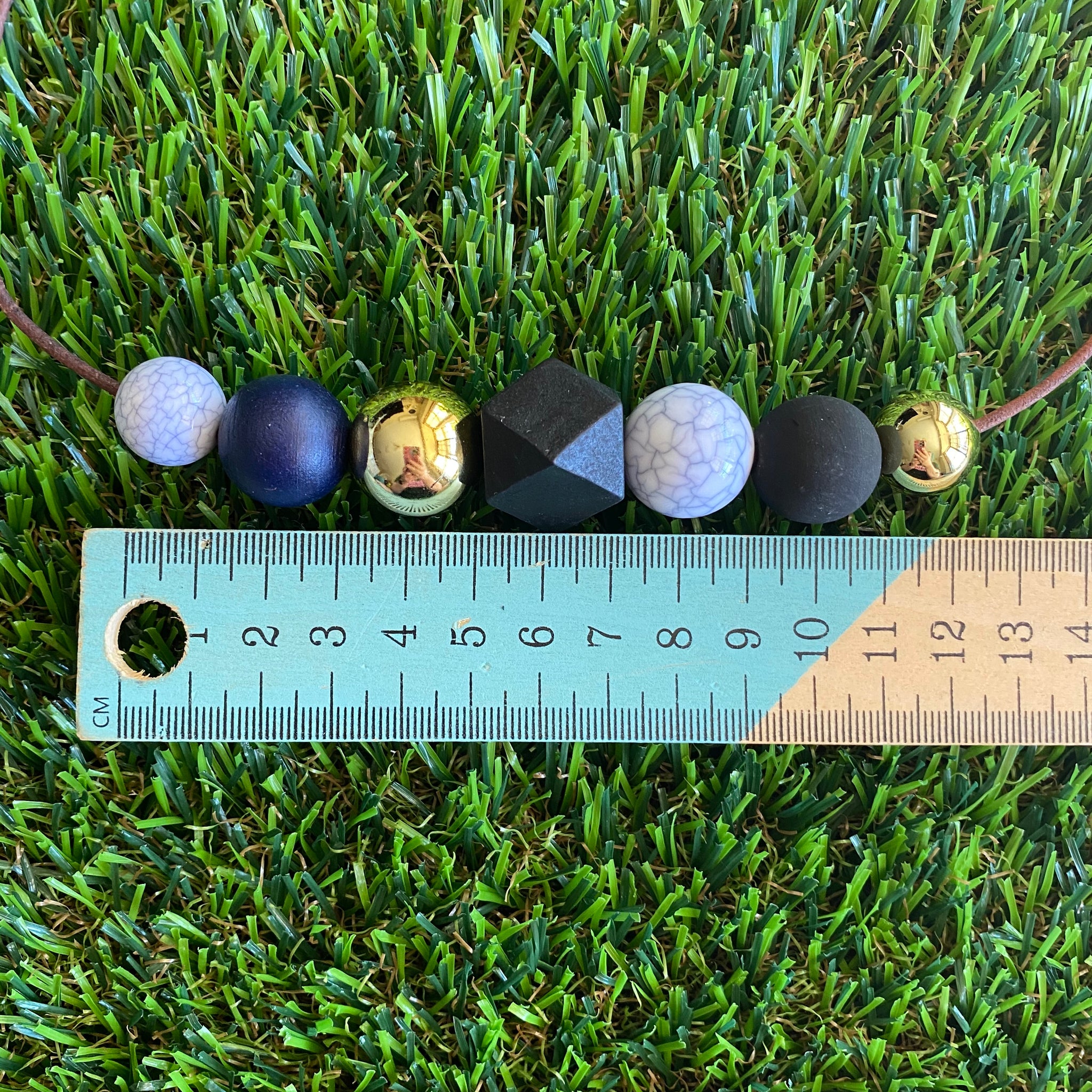 Leather Beaded Necklace - Handmade Lightweight Designer Necklace Made with Adjustable Sliding Knots - Featuring Black, Navy, Gold and Marble Accents.
