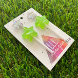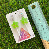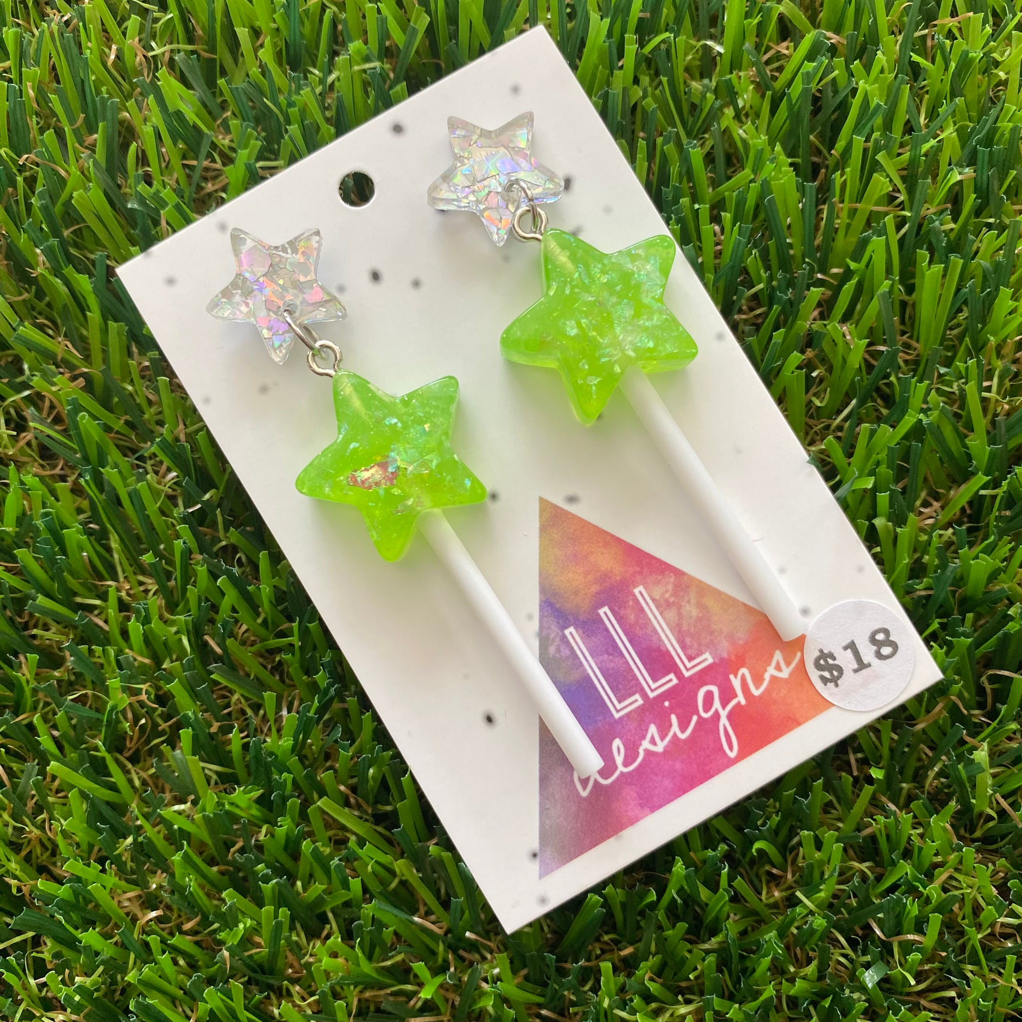 Lime Green Iridescent Glitter Star Lollipop Dangle Earrings Featuring Silver Star Top!