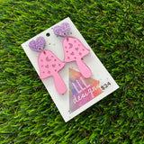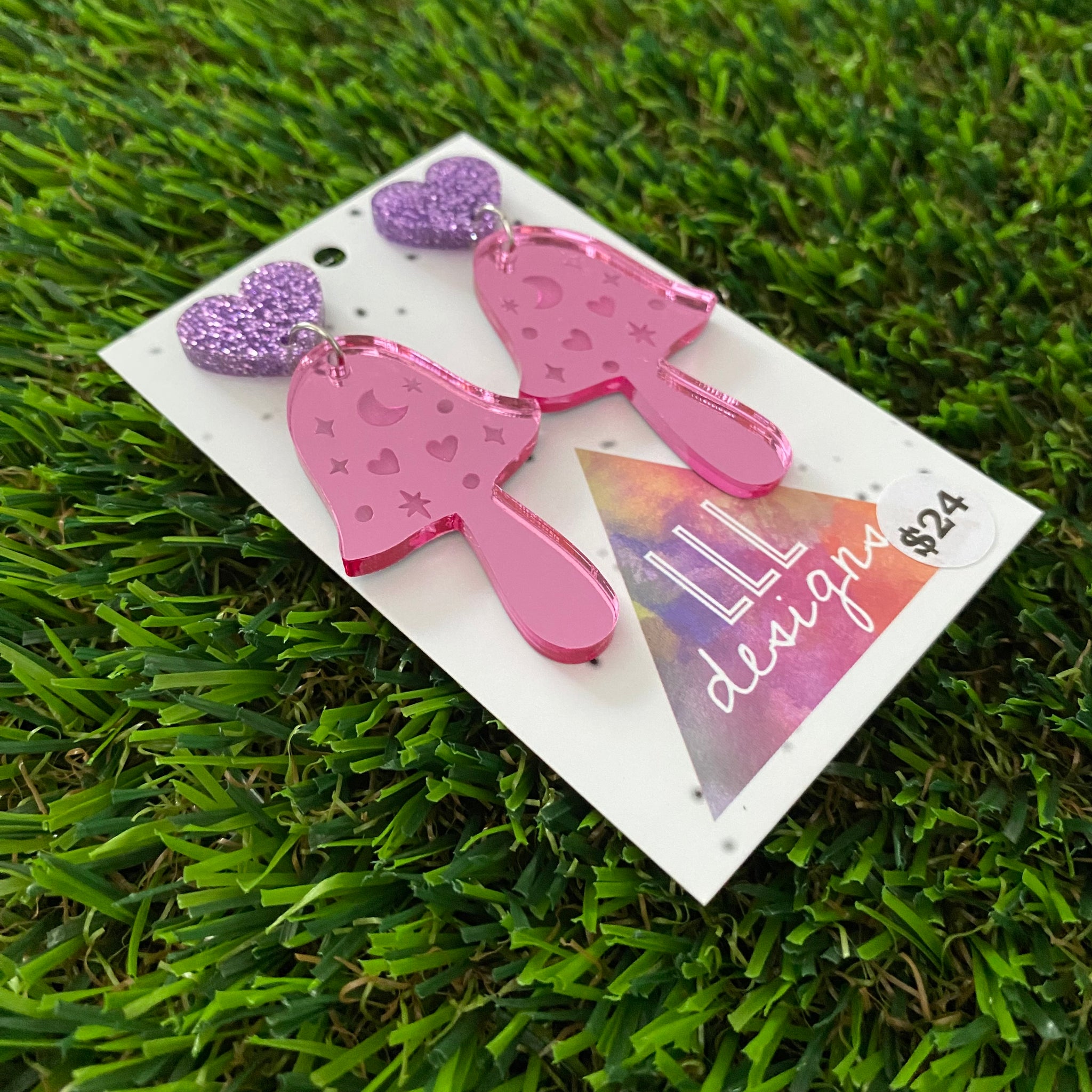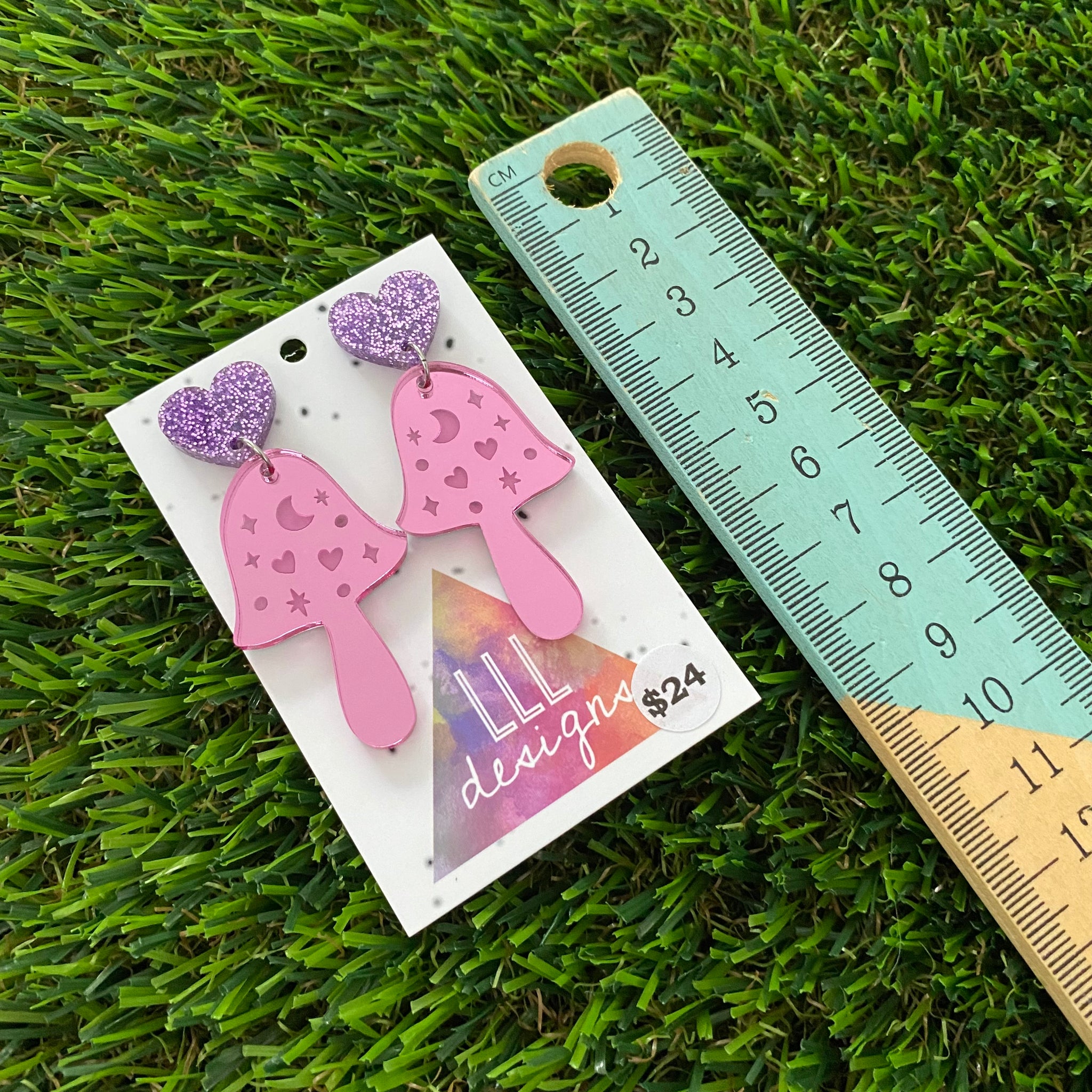 Mushroom Earrings - Pink Magical Mushrooms with Glitter Purple Heart Top!